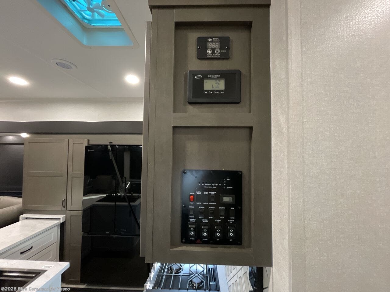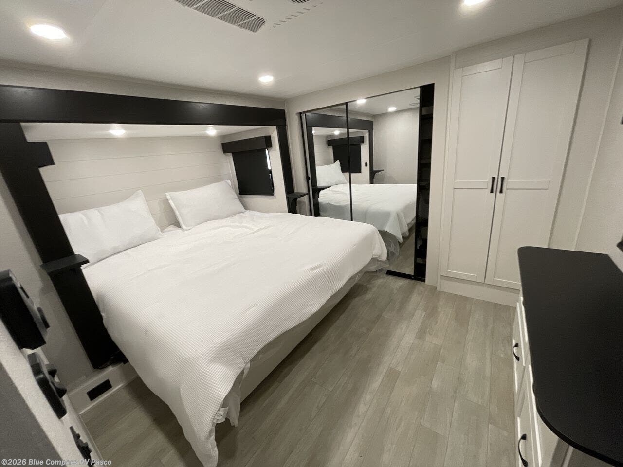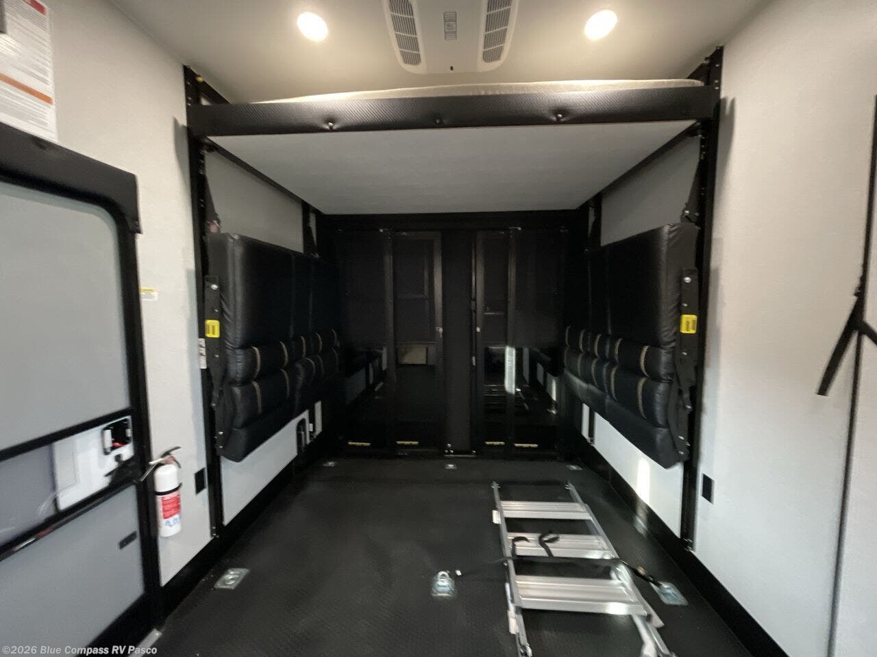 Get on the road with this toy hauler fifth wheel! The 14' garage is a playground for your toys, offering ample space for your ATV, motorcycle, or other gear. The loft above provides additional storage and an electric queen bed for a comfortable rest. The living room is a haven for relaxation, featuring an L-shaped sofa and a theater-style seat perfect for enjoying your favorite shows or movies on the TV. The kitchen is a culinary delight, equipped with a 12V refrigerator, microwave, overhead cabinets, and ample countertop space. The credenza with roll-out table is perfect for meal prep or serving, and the full bathroom provides a private space to freshen up, while the half bath option in the garage gives you more options. The cherry on top is that the front bedroom is a regal retreat, featuring a king bed, drawers, and a spacious walk-in closet.