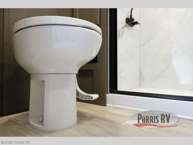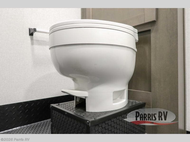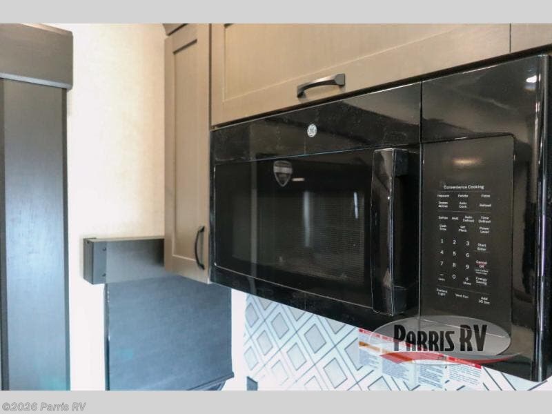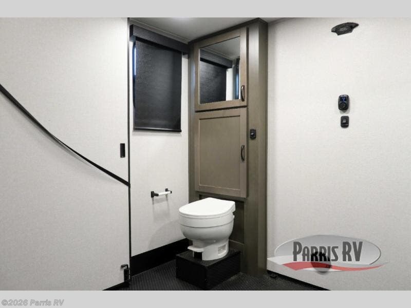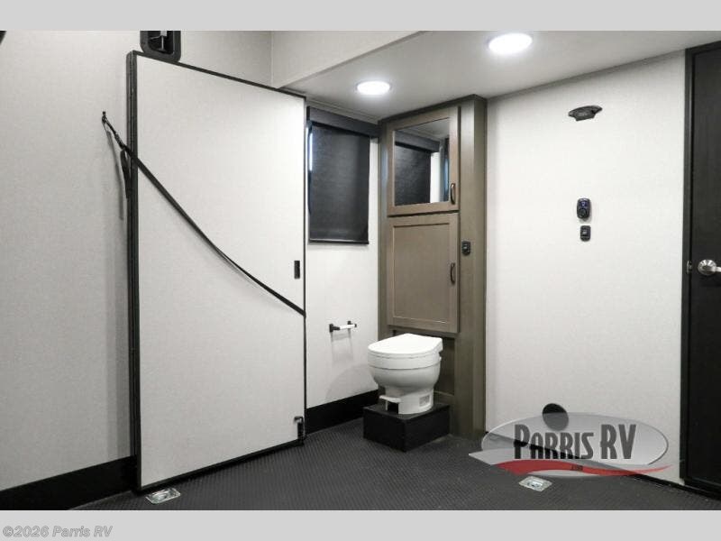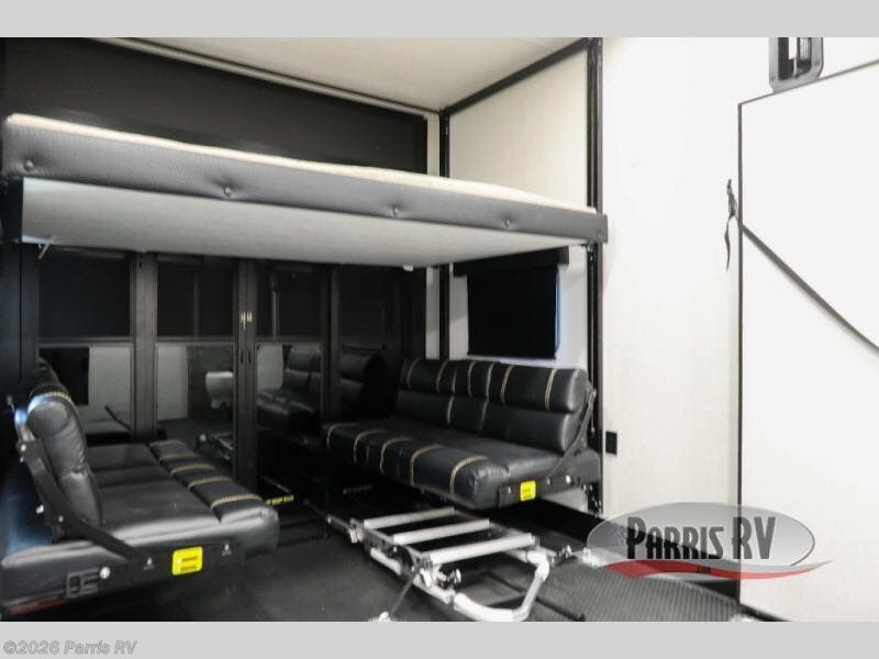 Get on the road with this toy hauler fifth wheel! The 14' garage is a playground for your toys, offering ample space for your ATV, motorcycle, or other gear. The loft above provides additional storage and an electric queen bed for a comfortable rest. The living room is a haven for relaxation, featuring an L-shaped sofa and a theater-style seat perfect for enjoying your favorite shows or movies on the TV. The kitchen is a culinary delight, equipped with a 12V refrigerator, microwave, overhead cabinets, and ample countertop space. The credenza with roll-out table is perfect for meal prep or serving, and the full bathroom provides a private space to freshen up, while the half bath option in the garage gives you more options. The cherry on top is that the front bedroom is a regal retreat, featuring a king bed, drawers, and a spacious walk-in closet.