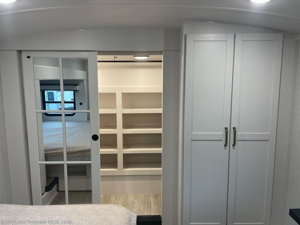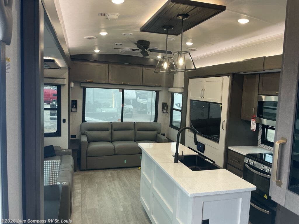 The Heartland Milestone is a full-profile luxury fifth wheel that is ready to help you make the most of your adventures! You will find a TrussTXL Roof System with Alpha roof membrane system offering quality exterior protection, and the Power Up Solar that includes a 200 watt solar panel will let you go off-grid when the adventure calls for it. The upgraded MORryde Step Above entrance steps will help you enter your unit with ease, and the 6-point hydraulic auto-leveling system comes standard to help you keep your unit secure while camping. The interior kitchen has some great features, like residential solid surface countertops and a large farmhouse sink. There are roller night shades throughout each unit to have privacy and comfort.