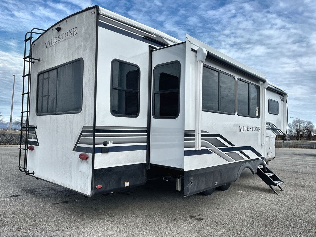 You'll be able to see the country in full luxury with this Milestone fifth wheel! There is a private bedroom in the front with a king-size bed where you can sleep comfortably each evening.The kitchen has all the appliances you will need to make the most out of your trips featuring a convection microwave, 21” oven, and a 16 cu. ft. 12V refrigerator. The living room will make for a great entertaining area, you can relax on the 78" hide-a-bed sofa that will serve as a bed so you can sit back and even have a nap! There is a full bathroom that has a 30" by 48" shower to freshen up each day. This RV has a wonderful design featuring dual opposing slides that will make for the real residential experience and make the most out of your travel.