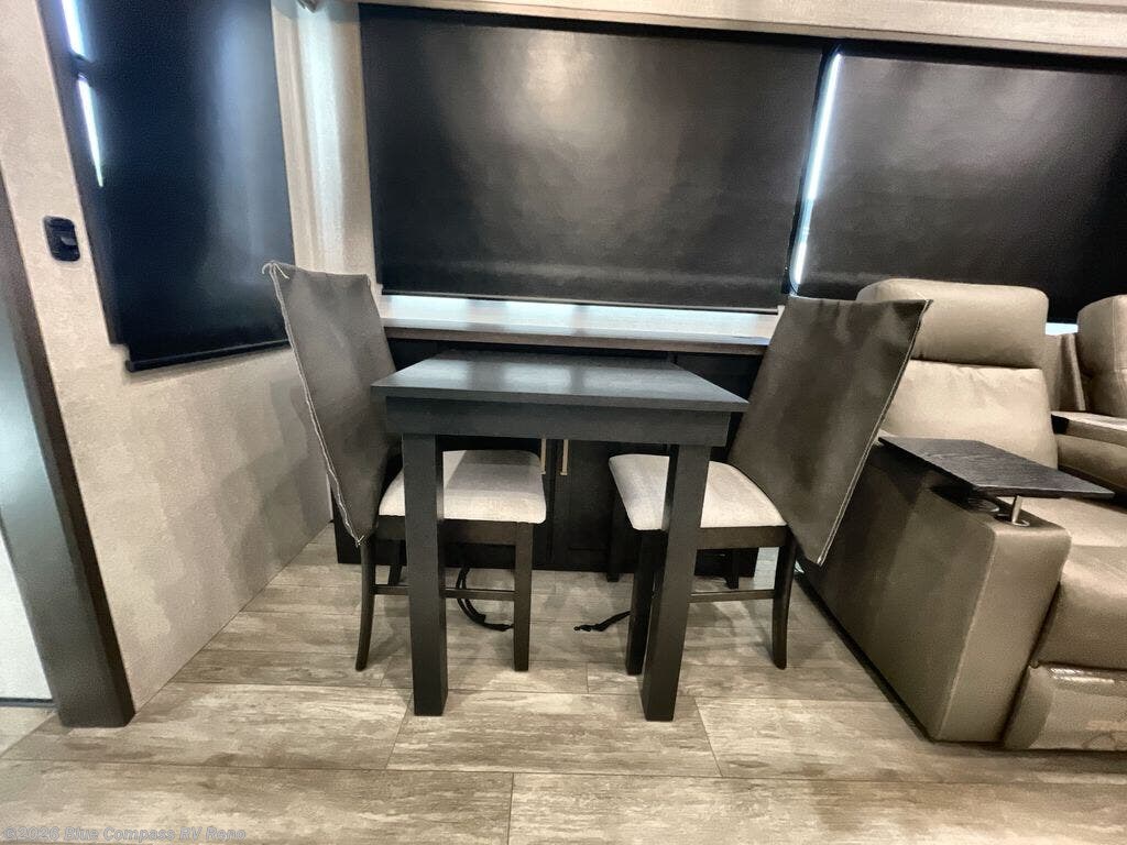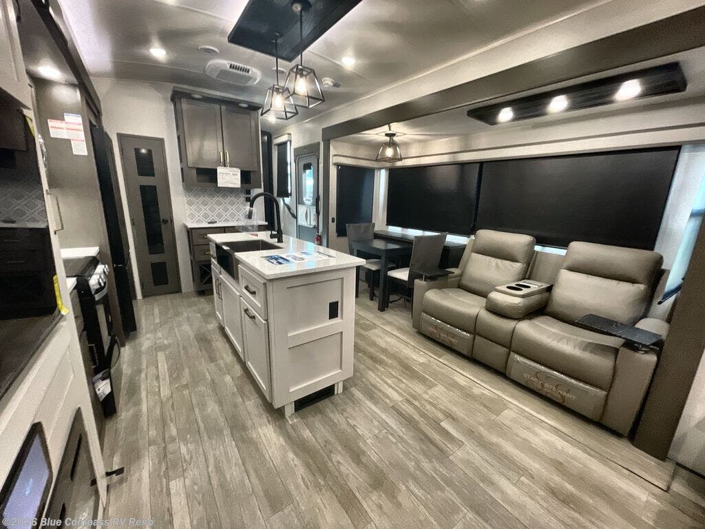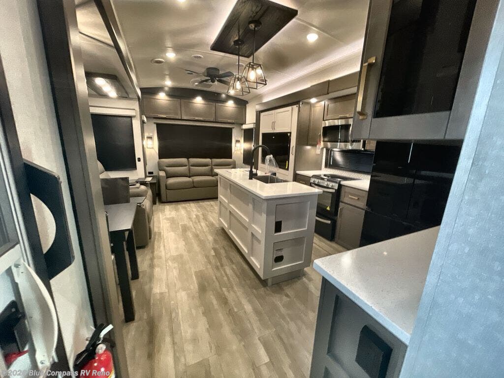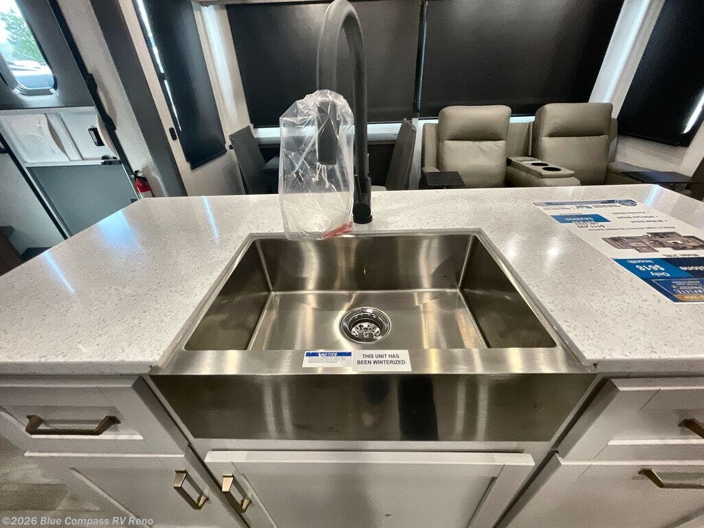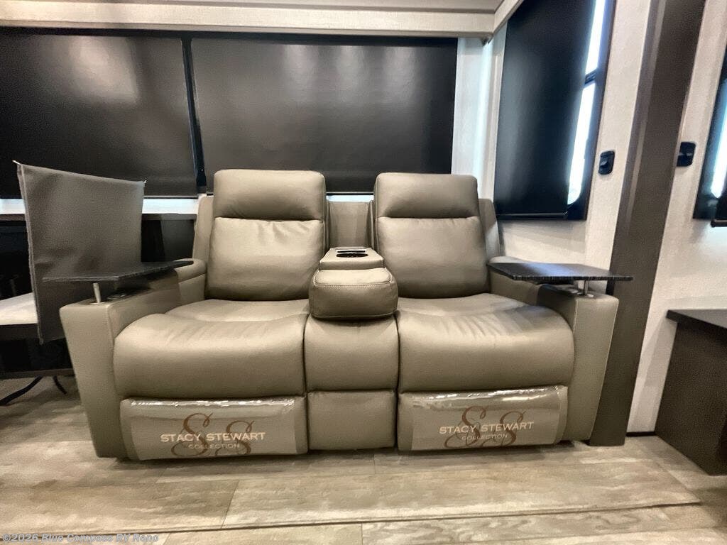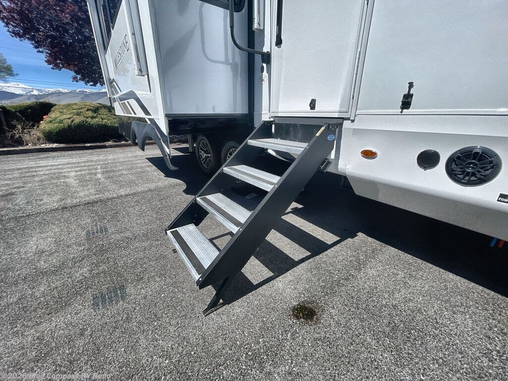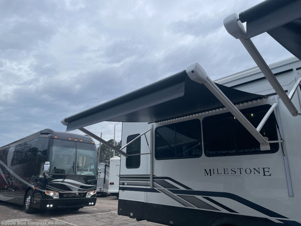 The Heartland Milestone is a full-profile luxury fifth wheel that is ready to help you make the most of your adventures! You will find a TrussTXL Roof System with Alpha roof membrane system offering quality exterior protection, and the Power Up Solar that includes a 200 watt solar panel will let you go off-grid when the adventure calls for it. The upgraded MORryde Step Above entrance steps will help you enter your unit with ease, and the 6-point hydraulic auto-leveling system comes standard to help you keep your unit secure while camping. The interior kitchen has some great features, like residential solid surface countertops and a large farmhouse sink. There are roller night shades throughout each unit to have privacy and comfort.