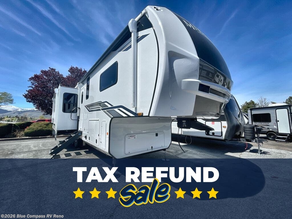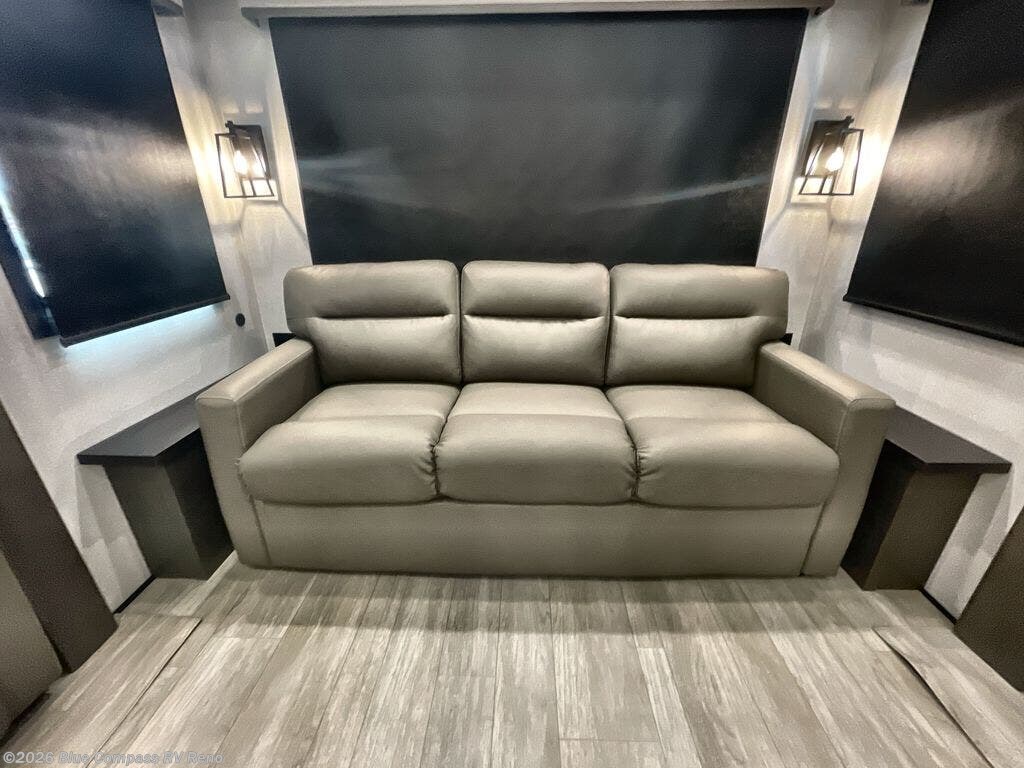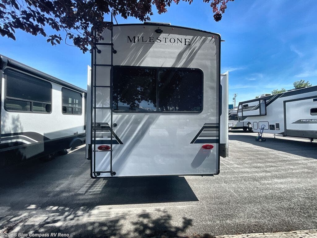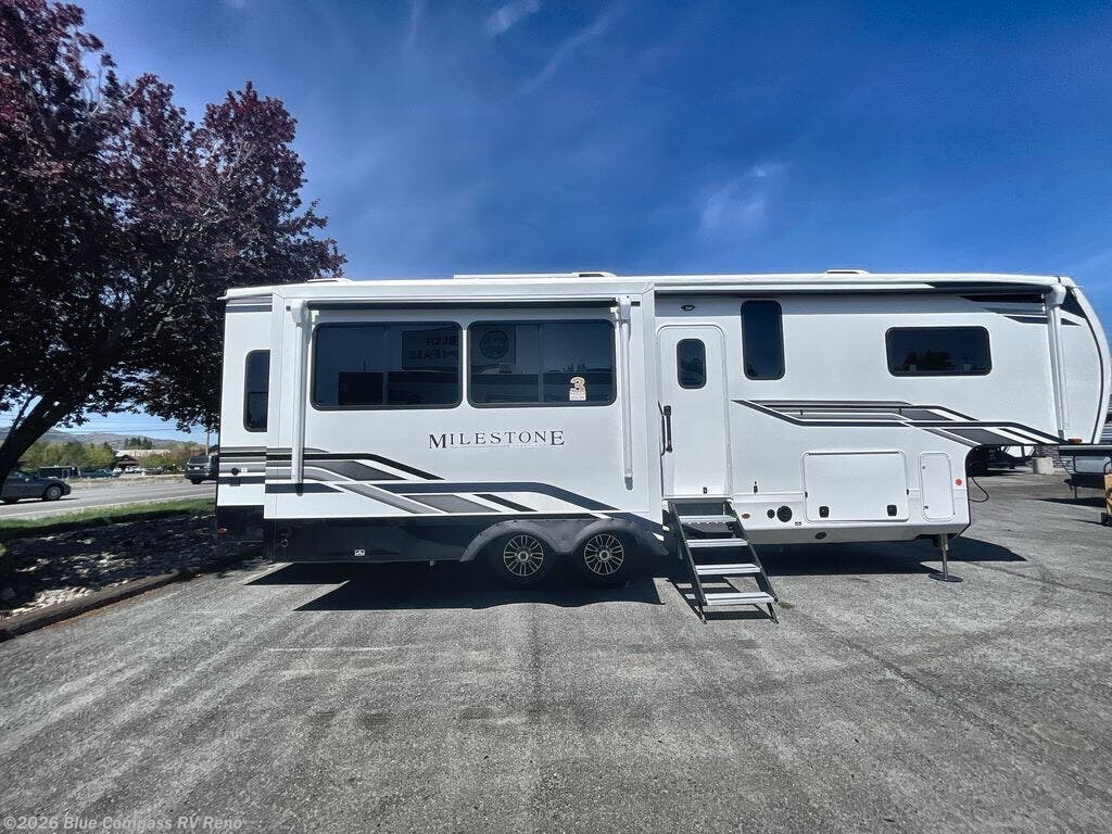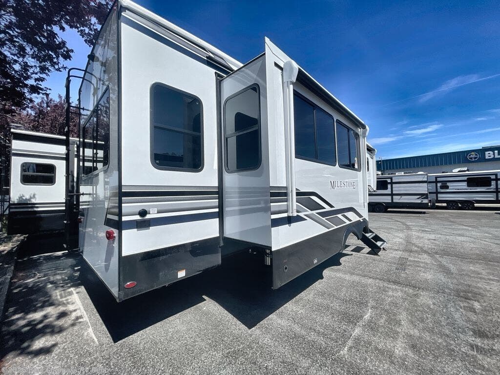 You'll be able to see the country in full luxury with this Milestone fifth wheel! There is a private bedroom in the front with a king-size bed where you can sleep comfortably each evening.The kitchen has all the appliances you will need to make the most out of your trips featuring a convection microwave, 21” oven, and a 16 cu. ft. 12V refrigerator. The living room will make for a great entertaining area, you can relax on the 78" hide-a-bed sofa that will serve as a bed so you can sit back and even have a nap! There is a full bathroom that has a 30" by 48" shower to freshen up each day. This RV has a wonderful design featuring dual opposing slides that will make for the real residential experience and make the most out of your travel.
