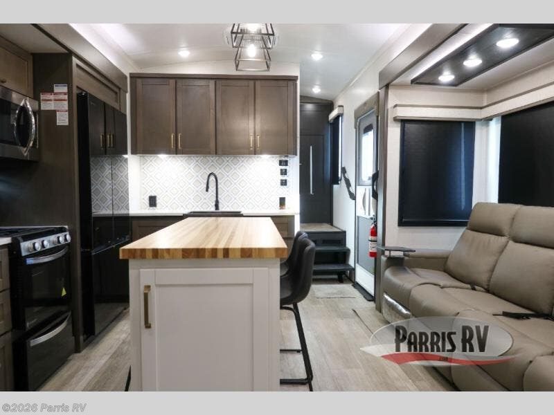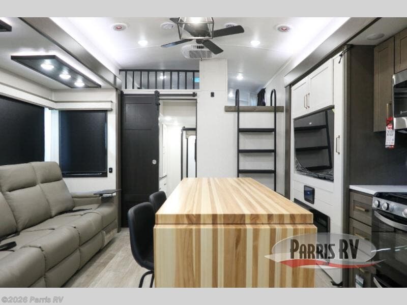 You'll be shocked with how many people can travel in full luxury with this Milestone fifth wheel! There are dual private bedrooms featuring a king-size bed in the front bedroom and a queen-size bed in the rear bedroom so you and your guests can have their own space. Use the loft for added sleeping space for the kiddos! This RV also has two full bathrooms on each end so it is of easy access, also, the rear bathroom has its own exterior entrance! The kitchen has all the counter space you will need to prepare your everyday meals, after cooking you can enjoy your creation at the island table with chairs.There is a super lounger that has all the space you'll need to enjoy quality time with all of your guests! Enjoy a wonderful design featuring dual opposing slides that will make for the real residential experience and make the most out of your travel.