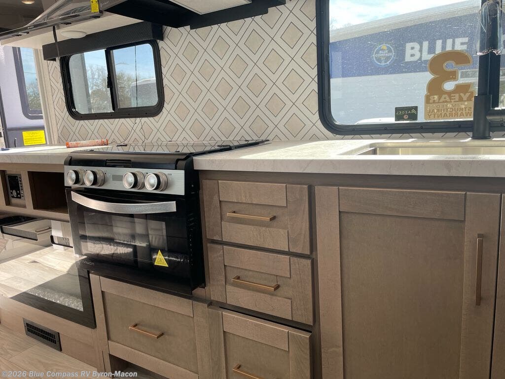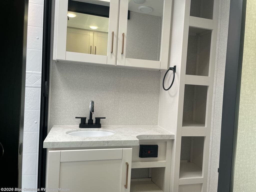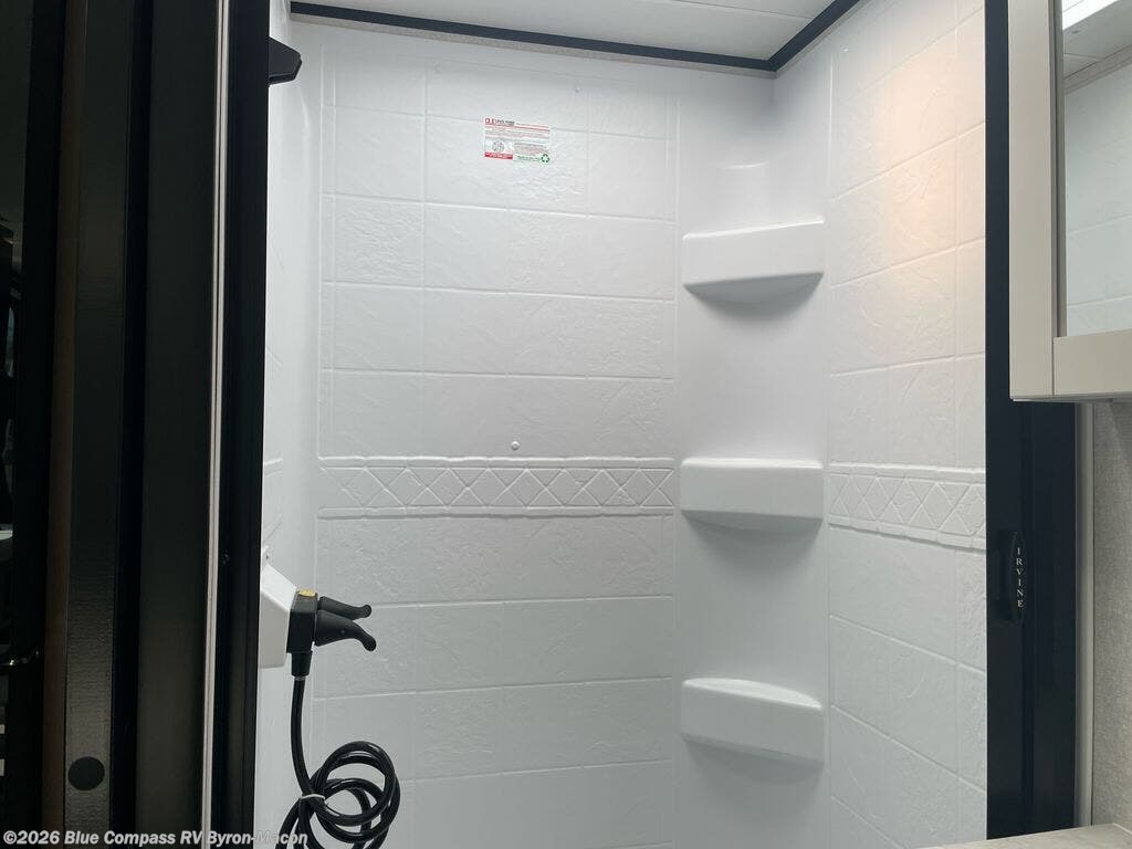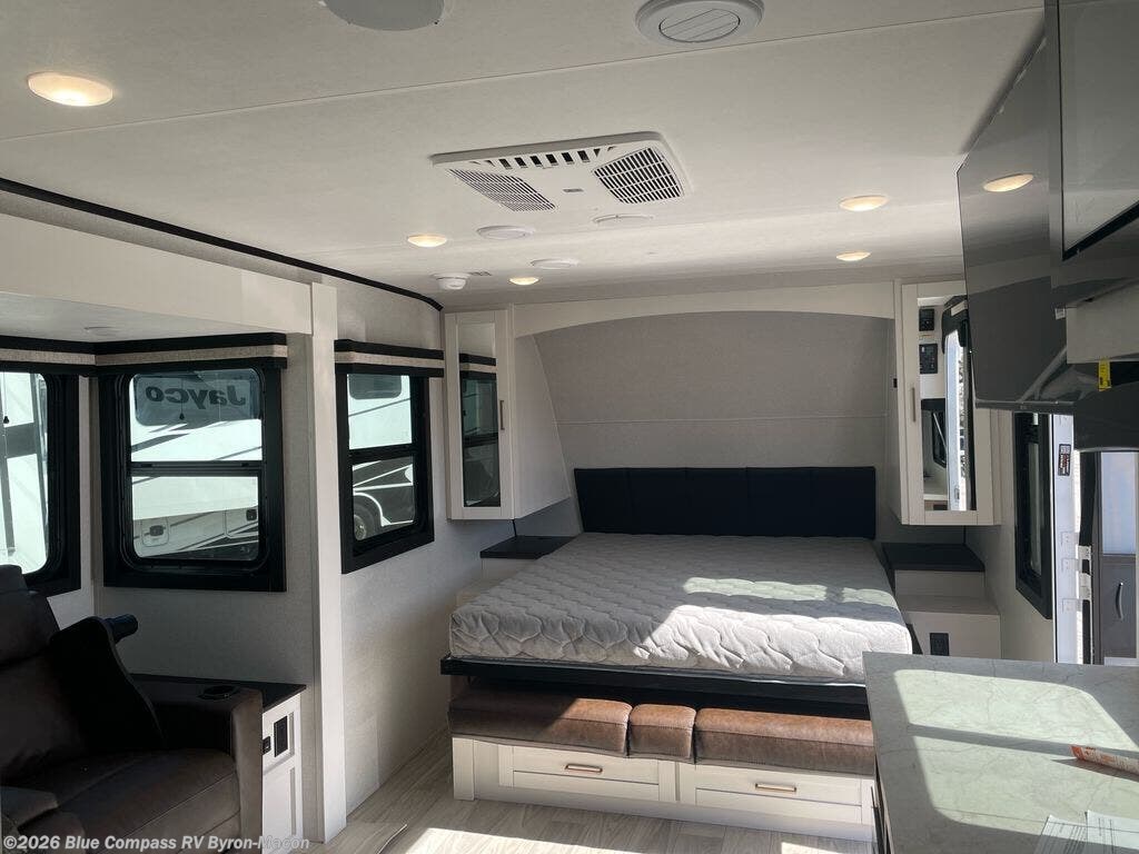 Once you step inside, you'll be welcomed by a thoughtfully designed front bedroom area featuring a 60" x 75" queen murphy bed, which conveniently converts into a 60" jack knife sofa, perfect for relaxing or hosting guests. On each side of the bed, you'll find a wardrobe and nightstand to store all your essentials within arm's reach. Moving into the slide-out, there's a cozy 60" theater seat equipped with table trays for comfortable dining or lounging, along with a storage compartment ideal for stashing board games or travel extras. Directly across, the kitchen stretches nearly the full length of the trailer wall, boasting a stainless-steel single basin sink with a high-rise pullout faucet and a butcher block cutting board, plus an 11-cu. ft. refrigerator to keep all your groceries fresh. Tucked into the rear corner is a full bathroom complete with a 30" x 36" shower, a medicine cabinet, and a porcelain foot flush toilet, offering the convenience and comfort of home without relying on campsite facilities.
