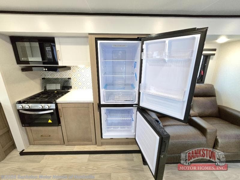 At the front of the trailer, you'll find a versatile 60" x 75" queen Murphy bed that easily converts into a 60" Jack Knife sofa, offering comfortable seating during the day and a cozy sleeping space at night. The slide-out expands the living area with a 60" theater seat, perfect for relaxing, while also housing a fully equipped kitchen with a three-burner range and an 11 cu. ft. refrigerator, making meal prep easy and convenient. Across from the slide, a spacious 38" x 68" dinette provides additional seating for meals, games, or gathering, situated right next to a pantry for storing all your dry goods. In the rear corner, the bathroom includes a roomy 40" shower, a foot-flush toilet, and a linen closet to keep towels and essentials neatly organized and within reach.