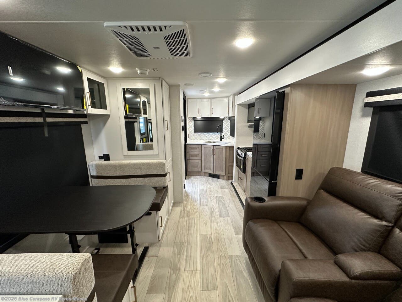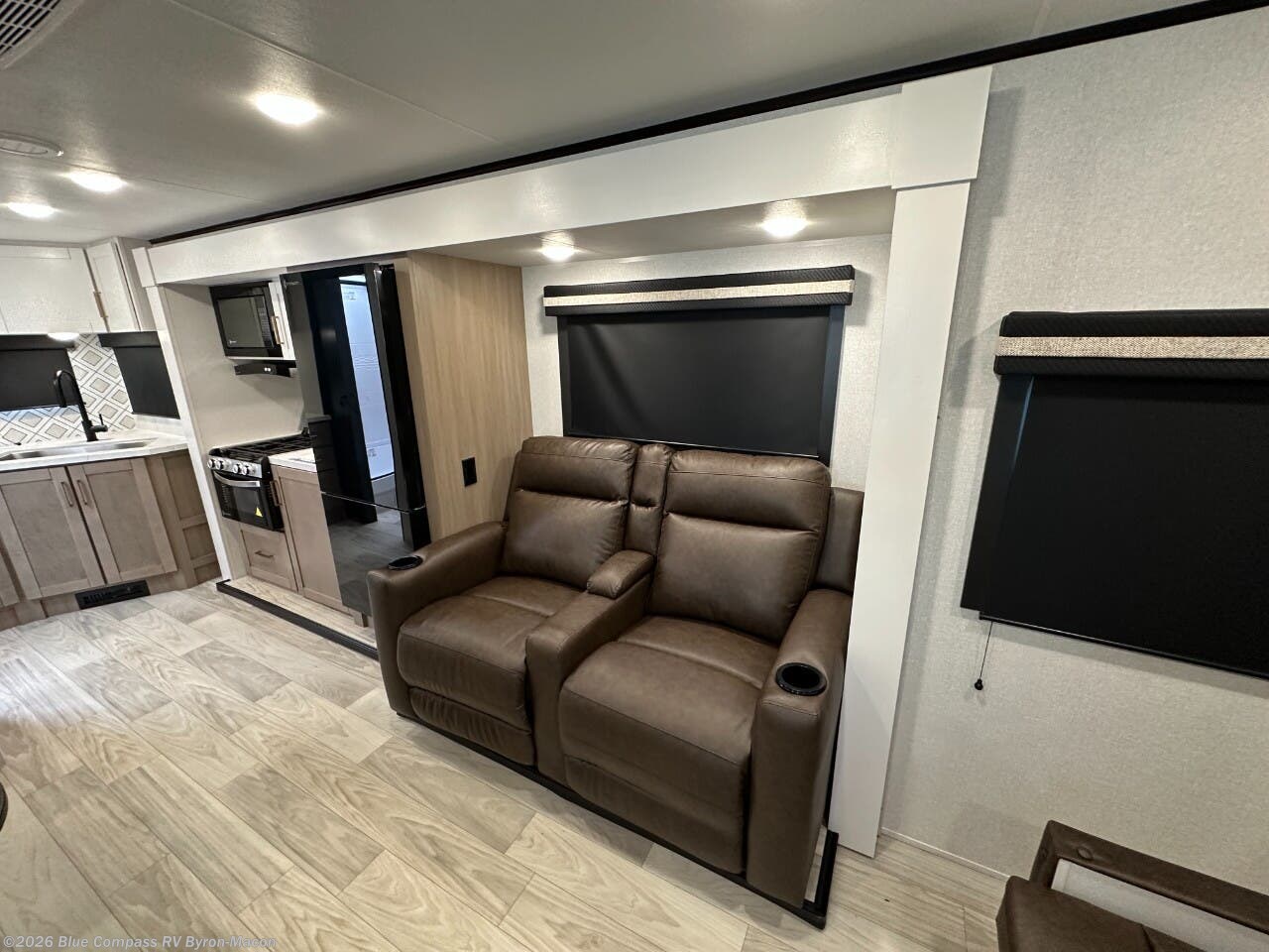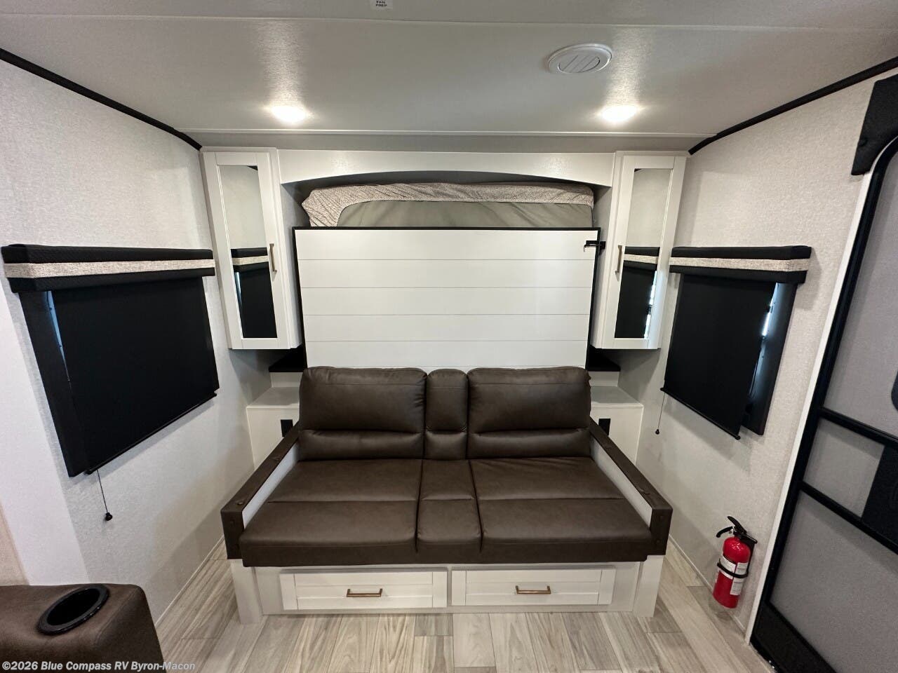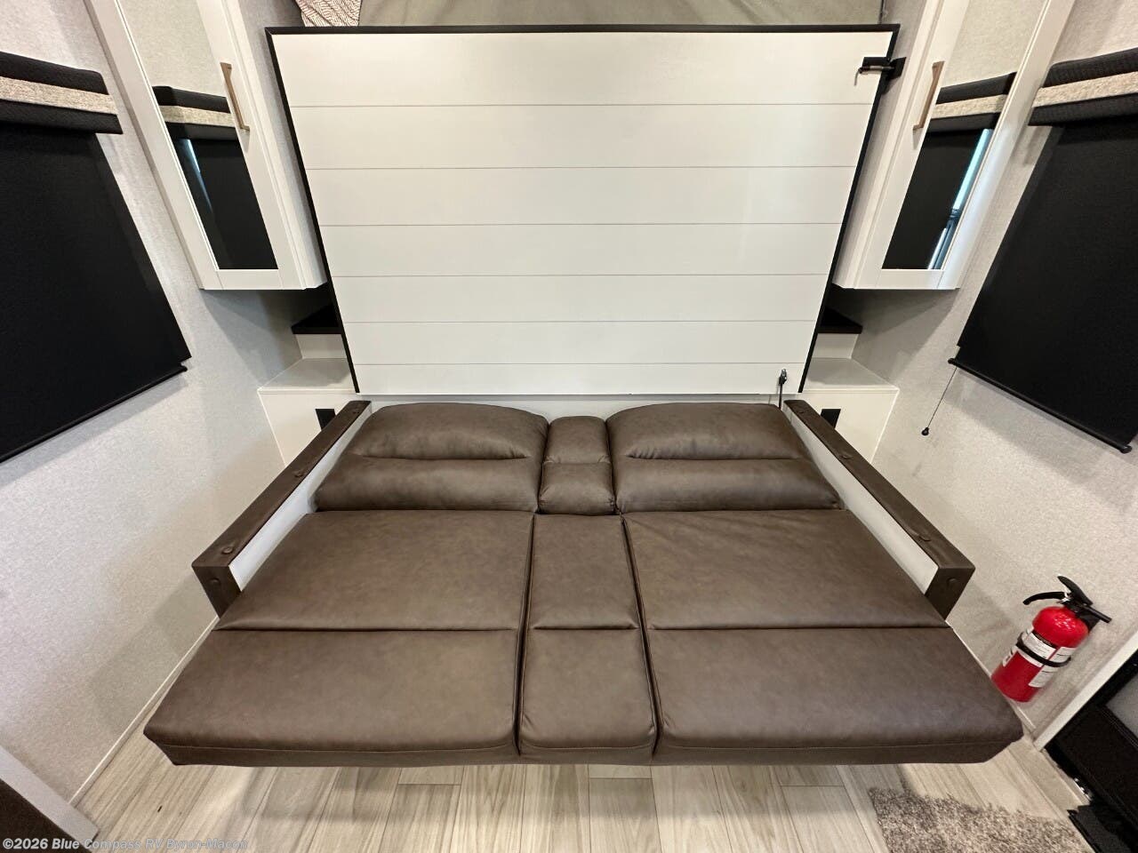 At the front of the trailer, you'll find a versatile 60" x 75" queen Murphy bed that easily converts into a 60" Jack Knife sofa, offering comfortable seating during the day and a cozy sleeping space at night. The slide-out expands the living area with a 60" theater seat, perfect for relaxing, while also housing a fully equipped kitchen with a three-burner range and an 11 cu. ft. refrigerator, making meal prep easy and convenient. Across from the slide, a spacious 38" x 68" dinette provides additional seating for meals, games, or gathering, situated right next to a pantry for storing all your dry goods. In the rear corner, the bathroom includes a roomy 40" shower, a foot-flush toilet, and a linen closet to keep towels and essentials neatly organized and within reach.