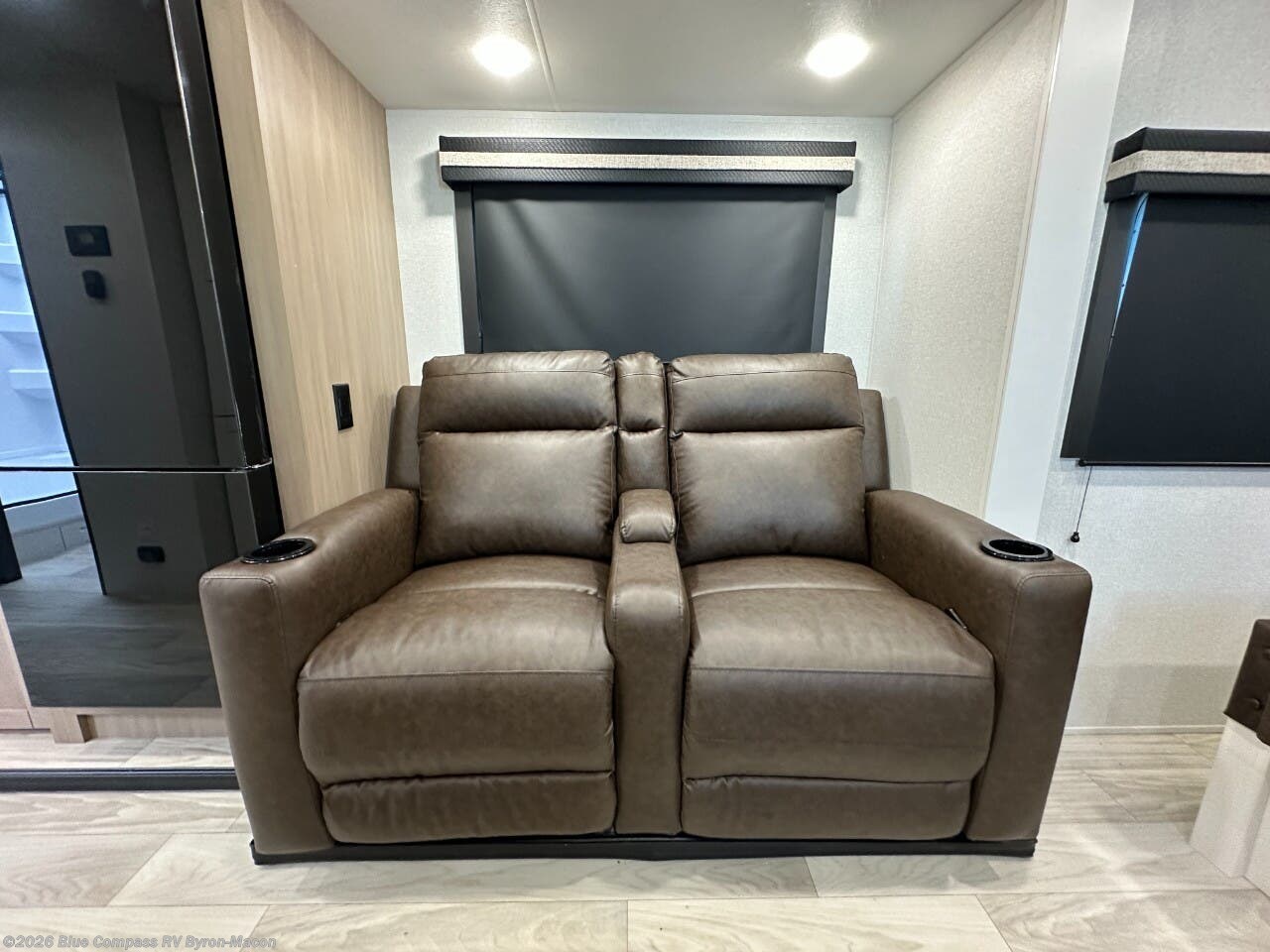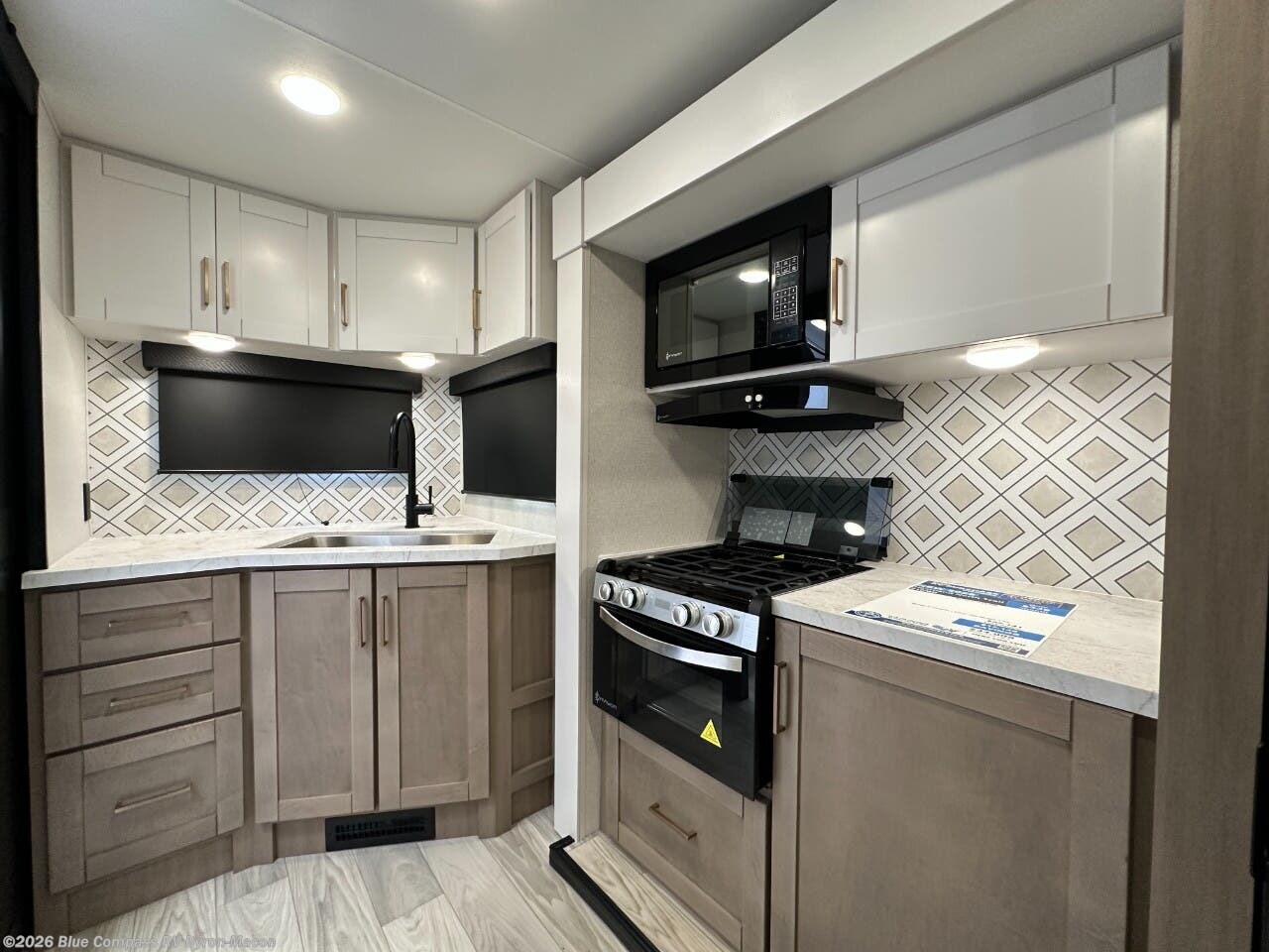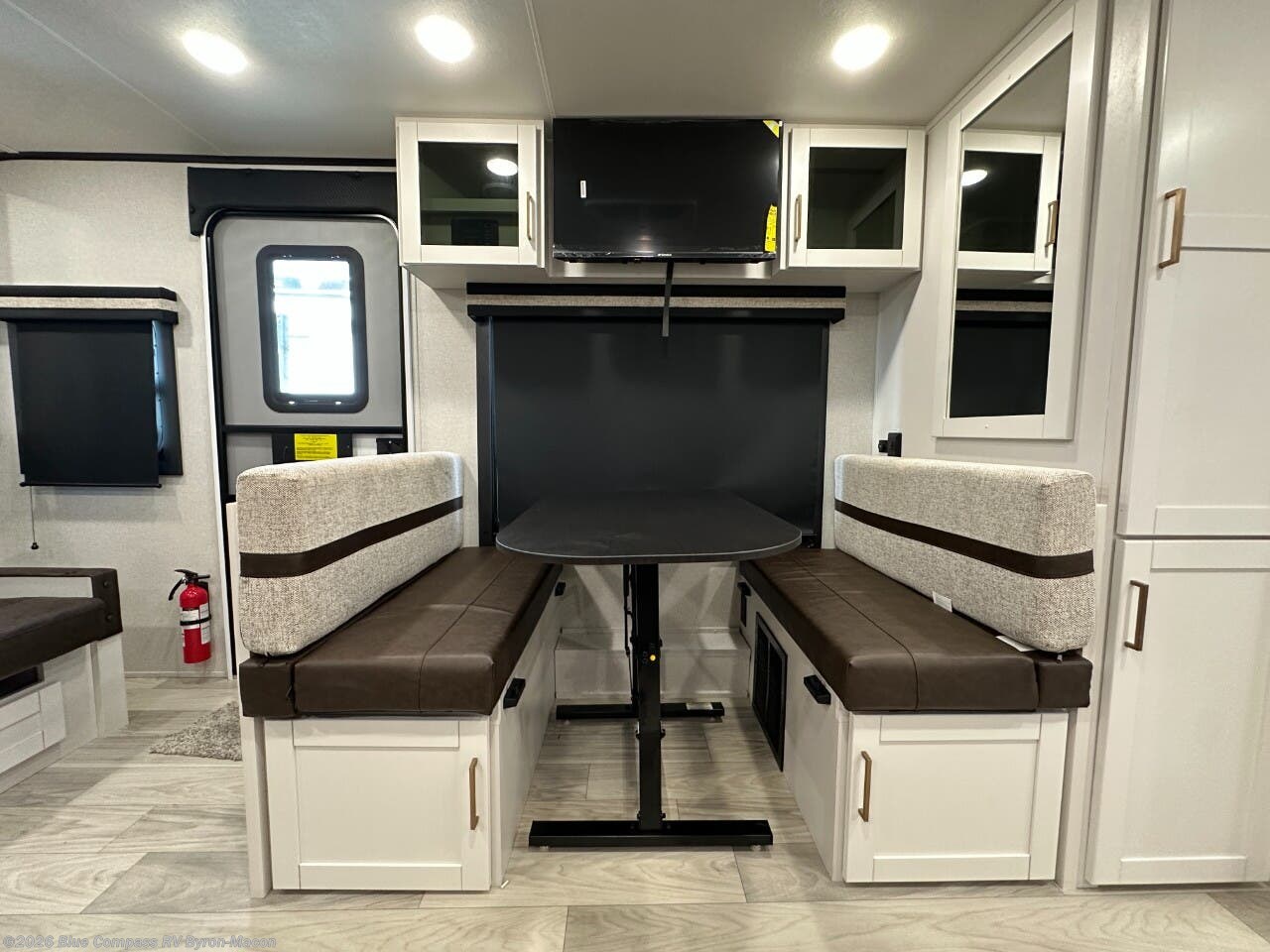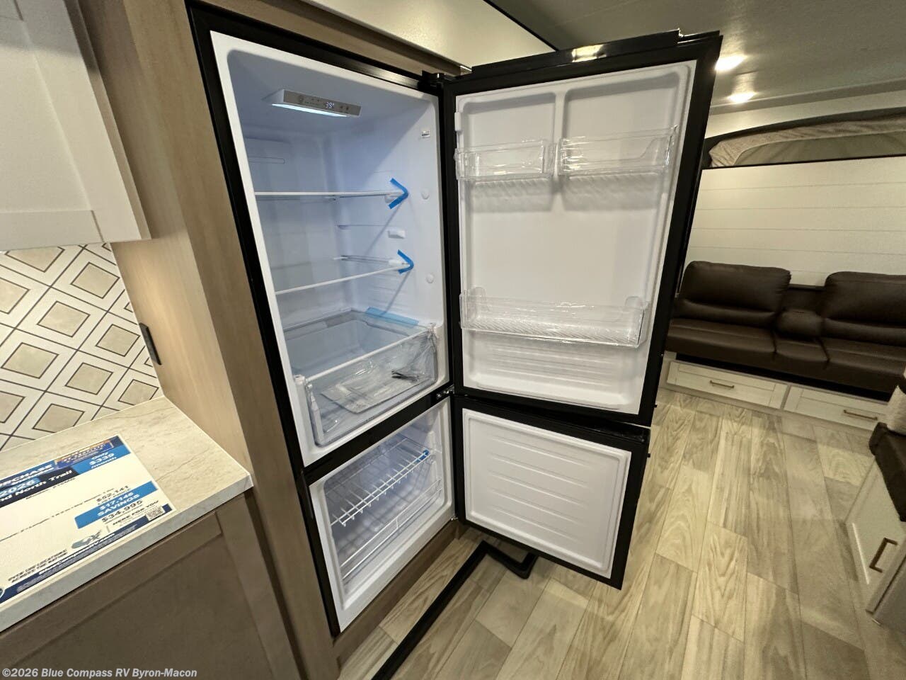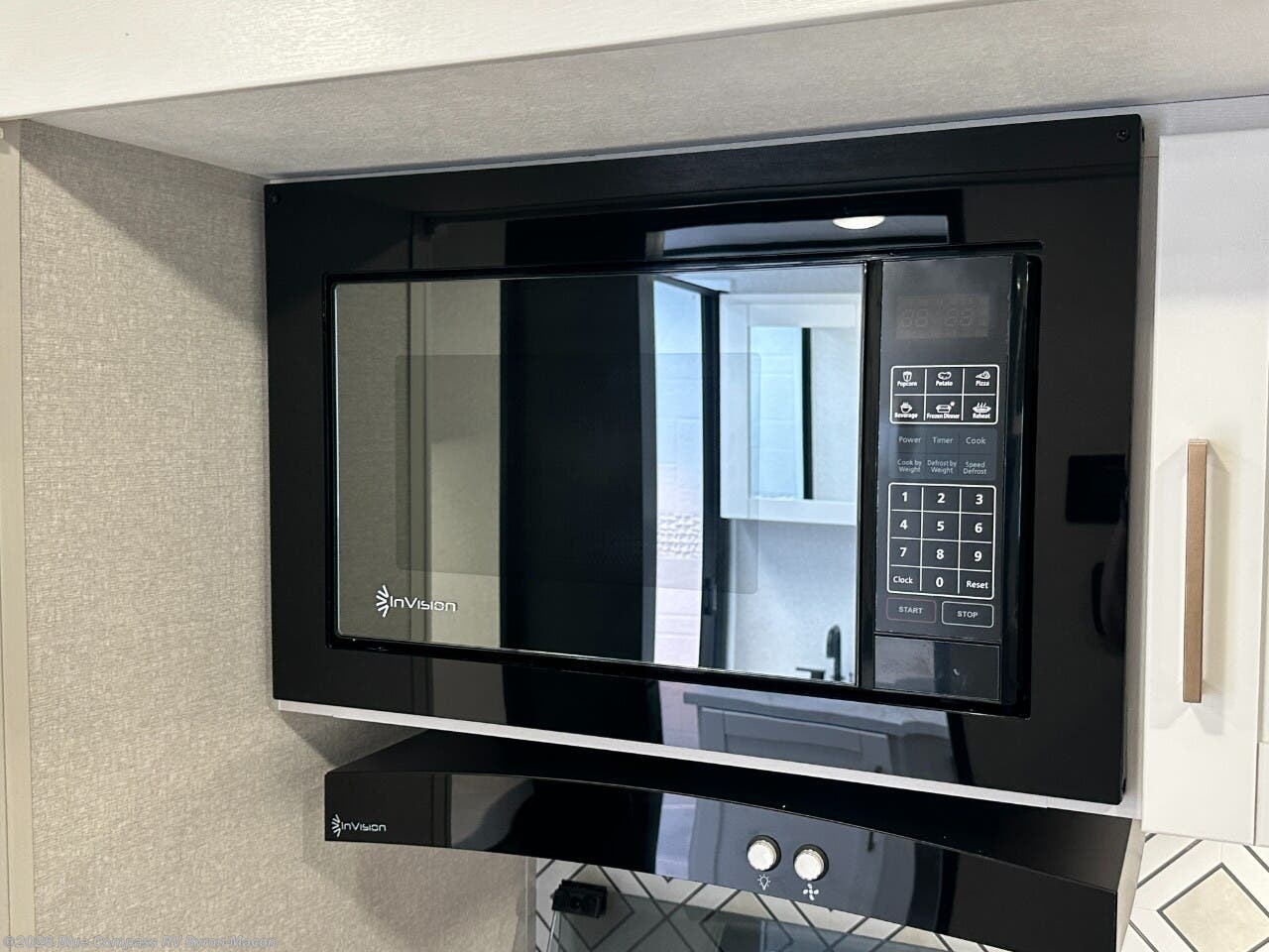 At the front of the trailer, you'll find a versatile 60" x 75" queen Murphy bed that easily converts into a 60" Jack Knife sofa, offering comfortable seating during the day and a cozy sleeping space at night. The slide-out expands the living area with a 60" theater seat, perfect for relaxing, while also housing a fully equipped kitchen with a three-burner range and an 11 cu. ft. refrigerator, making meal prep easy and convenient. Across from the slide, a spacious 38" x 68" dinette provides additional seating for meals, games, or gathering, situated right next to a pantry for storing all your dry goods. In the rear corner, the bathroom includes a roomy 40" shower, a foot-flush toilet, and a linen closet to keep towels and essentials neatly organized and within reach.