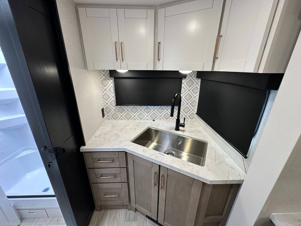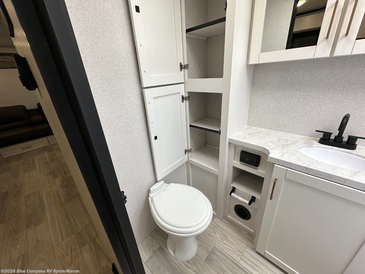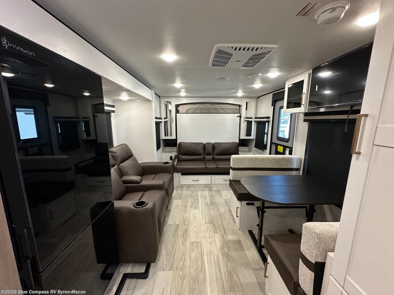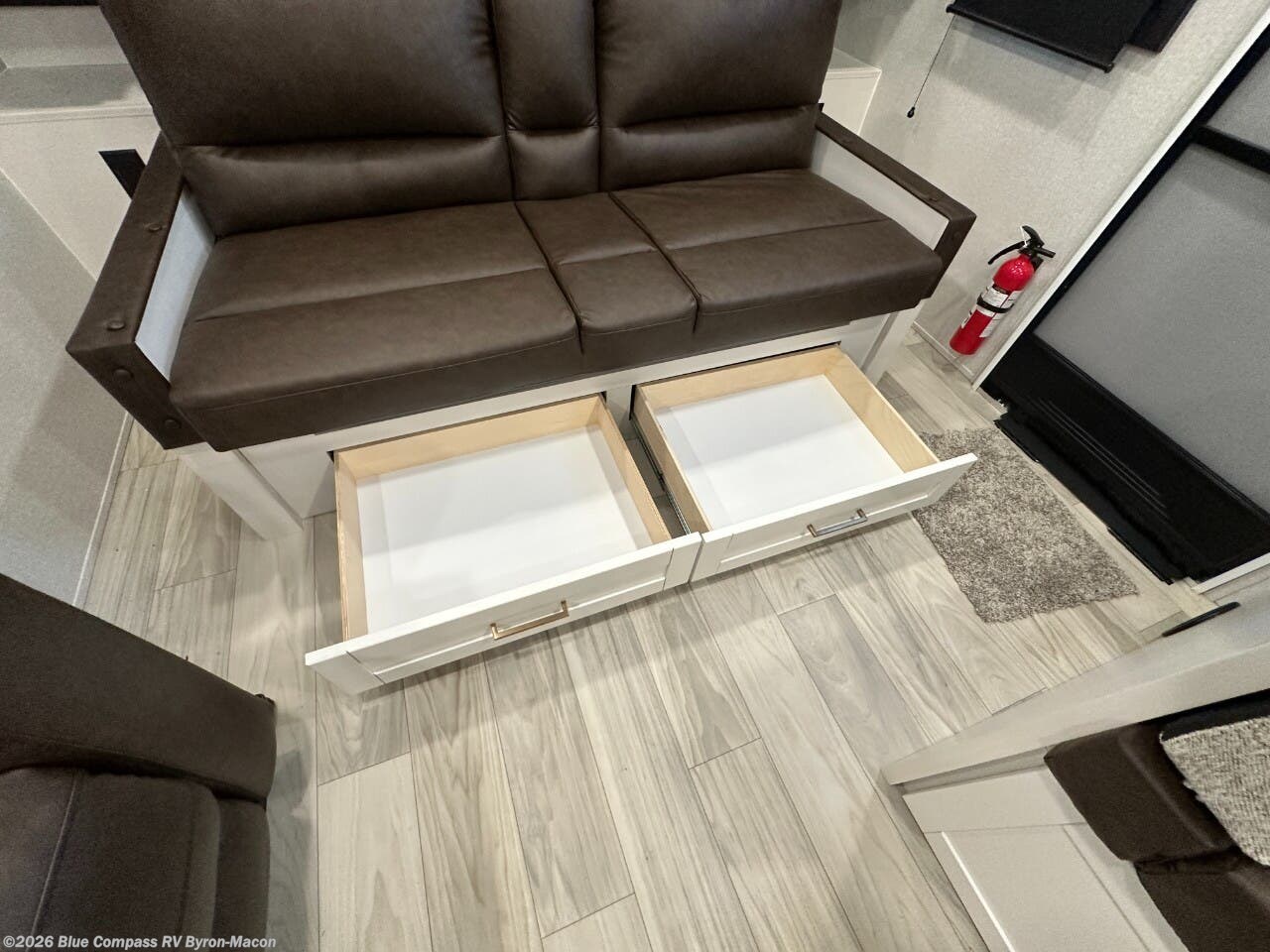 At the front of the trailer, you'll find a versatile 60" x 75" queen Murphy bed that easily converts into a 60" Jack Knife sofa, offering comfortable seating during the day and a cozy sleeping space at night. The slide-out expands the living area with a 60" theater seat, perfect for relaxing, while also housing a fully equipped kitchen with a three-burner range and an 11 cu. ft. refrigerator, making meal prep easy and convenient. Across from the slide, a spacious 38" x 68" dinette provides additional seating for meals, games, or gathering, situated right next to a pantry for storing all your dry goods. In the rear corner, the bathroom includes a roomy 40" shower, a foot-flush toilet, and a linen closet to keep towels and essentials neatly organized and within reach.