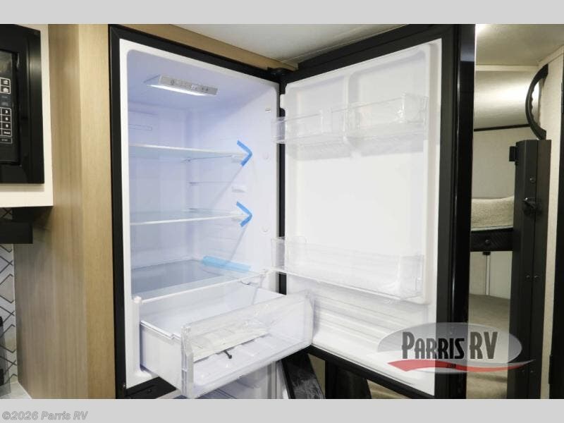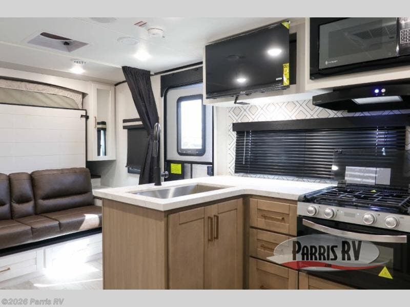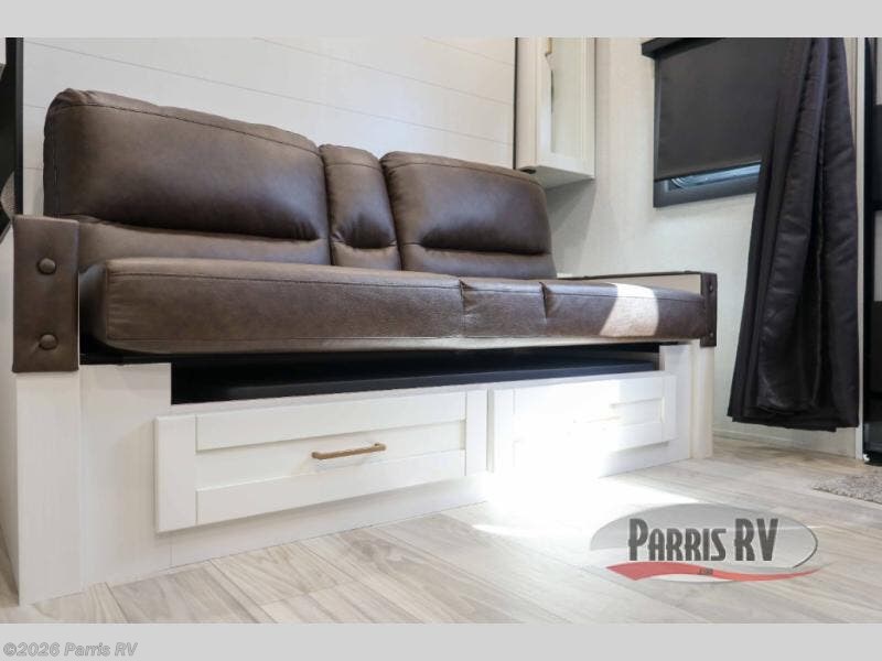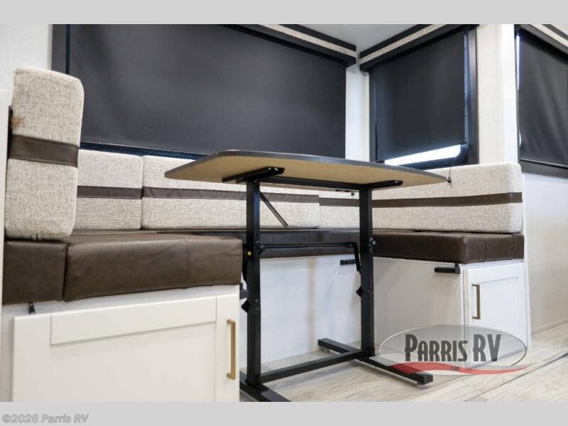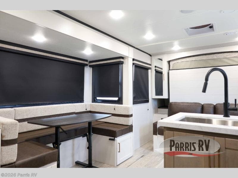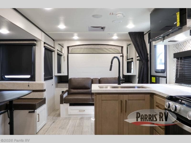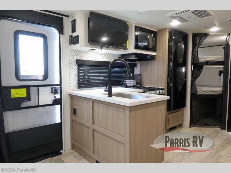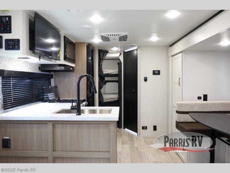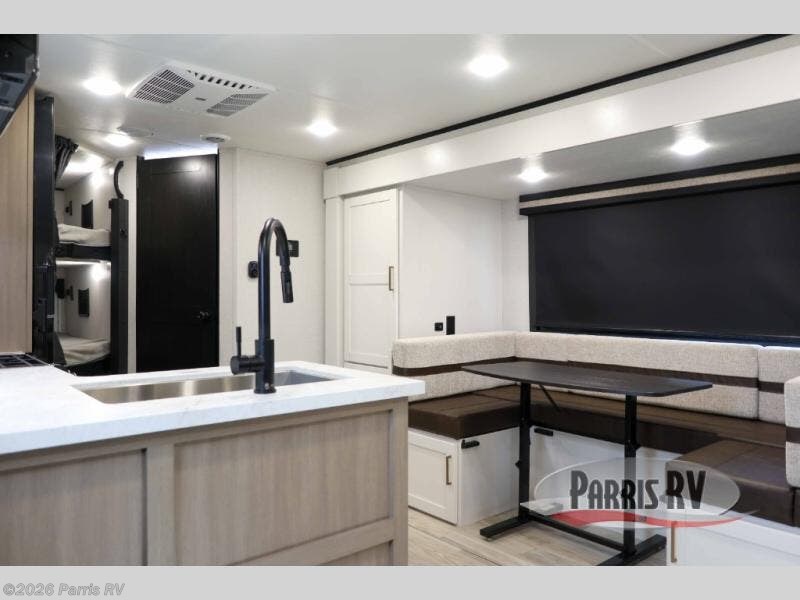 Once you step inside, you'll find a well designed front bedroom area featuring a 60" x 75" Murphy queen bed that transforms into a jack knife sofa, giving you flexible seating during the day. Each side includes a convenient nightstand for your essentials. In the slide-out, there's a combination wardrobe/pantry for added storage, along with a spacious 40" x 82" U-dinette, perfect for sharing meals, playing board games, or relaxing together. The dinette also converts into extra-sleeping space when needed. Across, the L-shaped kitchen offers everything you need, including a stainless-steel sink, microwave, cooktop, and a generous 11 cu. ft. refrigerator. In the rear, one corner houses cozy double bunks with storage below great for sleeping extra guests or stowing your gear. The opposite corner features a full bathroom complete with a 30" x 36" shower, foot-flush toilet, and a corner sink with a medicine cabinet to keep your toiletries organized.