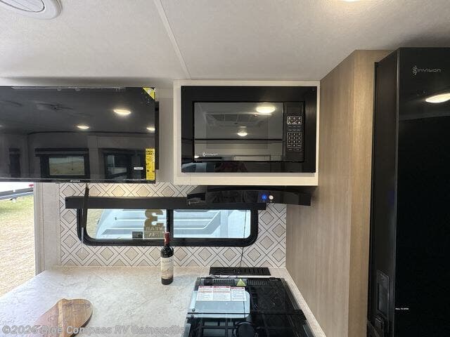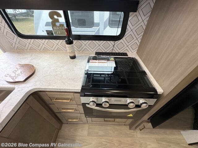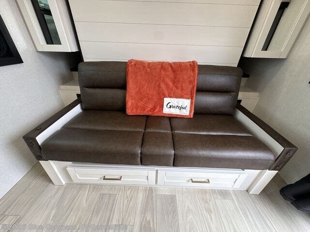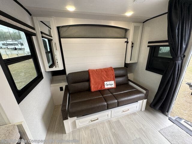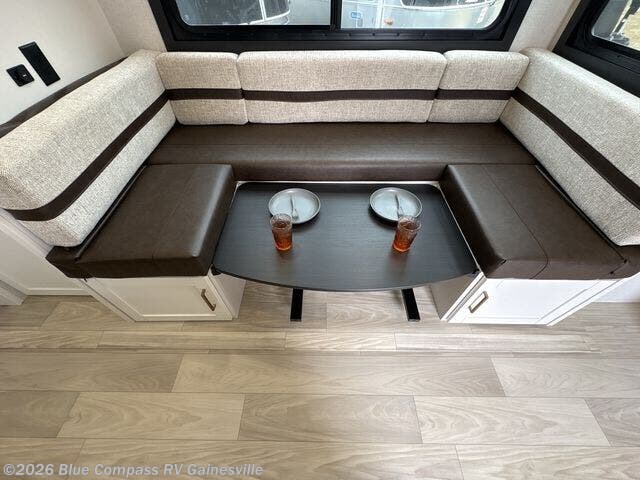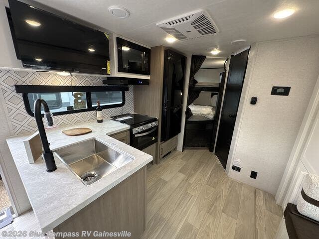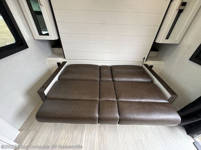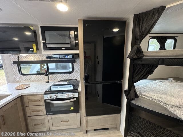 Once you step inside, you'll find a well designed front bedroom area featuring a 60" x 75" Murphy queen bed that transforms into a jack knife sofa, giving you flexible seating during the day. Each side includes a convenient nightstand for your essentials. In the slide-out, there's a combination wardrobe/pantry for added storage, along with a spacious 40" x 82" U-dinette, perfect for sharing meals, playing board games, or relaxing together. The dinette also converts into extra-sleeping space when needed. Across, the L-shaped kitchen offers everything you need, including a stainless-steel sink, microwave, cooktop, and a generous 11 cu. ft. refrigerator. In the rear, one corner houses cozy double bunks with storage below great for sleeping extra guests or stowing your gear. The opposite corner features a full bathroom complete with a 30" x 36" shower, foot-flush toilet, and a corner sink with a medicine cabinet to keep your toiletries organized.