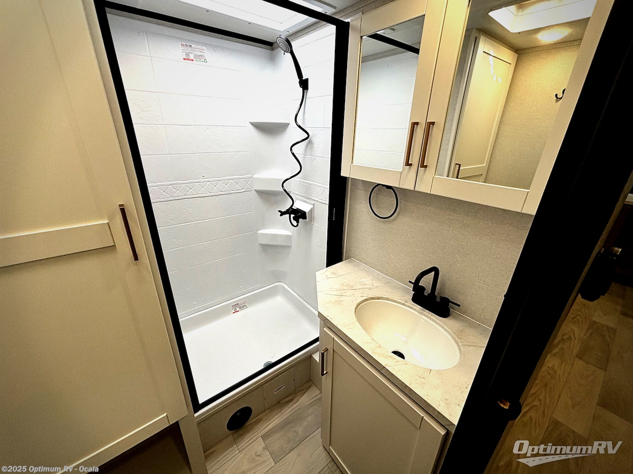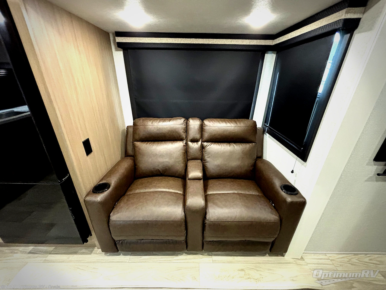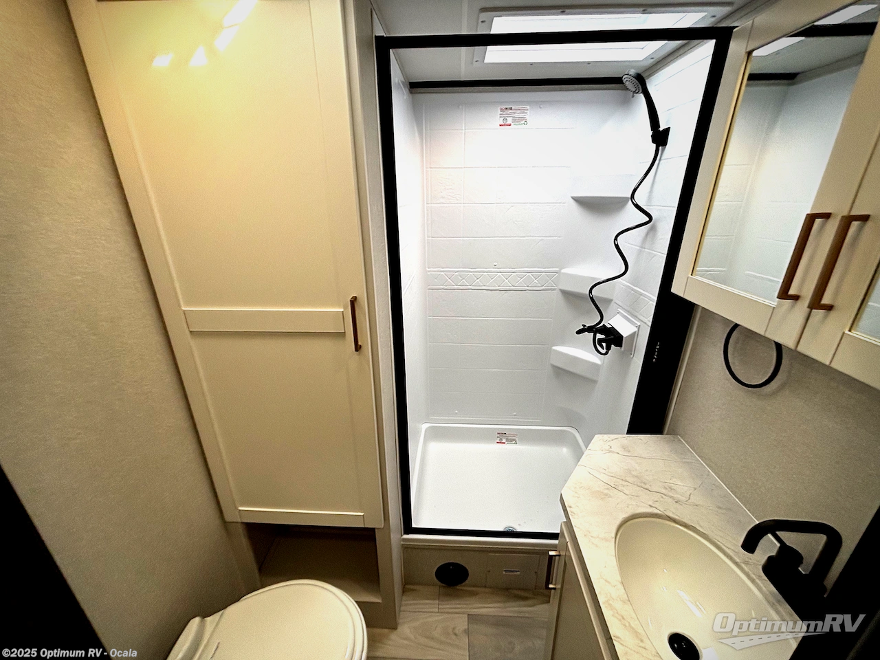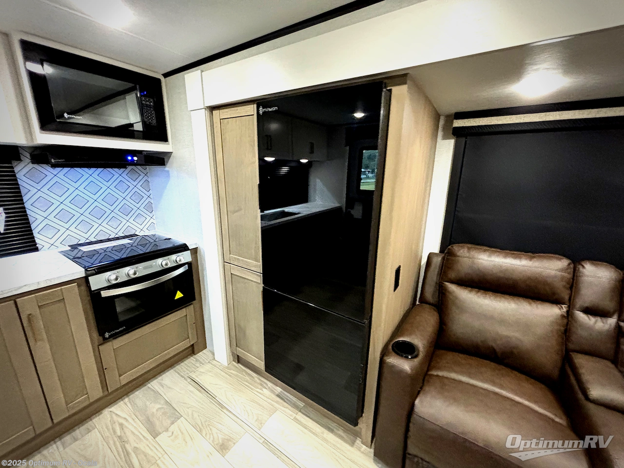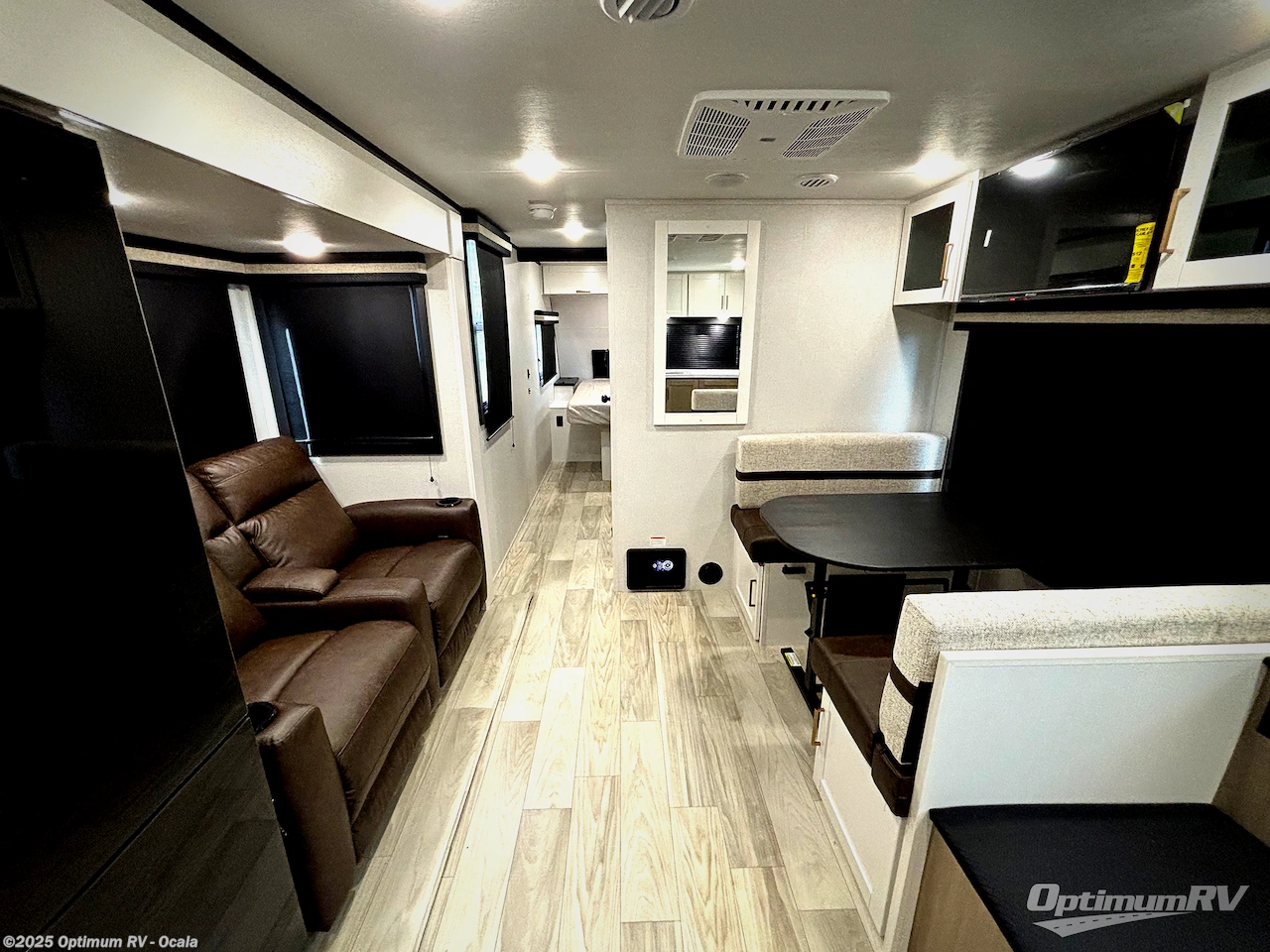 At the front of this travel trailer, you'll find a private bedroom featuring a spacious 60" x 80" queen bed, complete with pull-out nightstands and wardrobes on each side for convenient storage of clothes and essentials. One of the two entry doors is located here, providing added privacy and easy access. Moving down the hall, the full bathroom offers a 30" x 36" shower, a porcelain foot-flush toilet, and a linen cabinet to keep towels and hygiene items neatly organized. In the main living area, you can enjoy meals or game nights at the 38" x 68" booth dinette, while the 60" theater seat in the slide-out provides a cozy spot to relax. At the rear, the kitchen spans the full width of the trailer and includes a stainless-steel single-basin sink with a high-rise pullout faucet and butcher block cutting board, a three-burner range, and generous seamless countertops. Also, in the slide-out are a pantry and an 11-cu. ft. refrigerator, giving you plenty of room to store food, snacks, and leftovers for the whole trip. The second entry door is located in between the kitchen and dinette for your convenience.