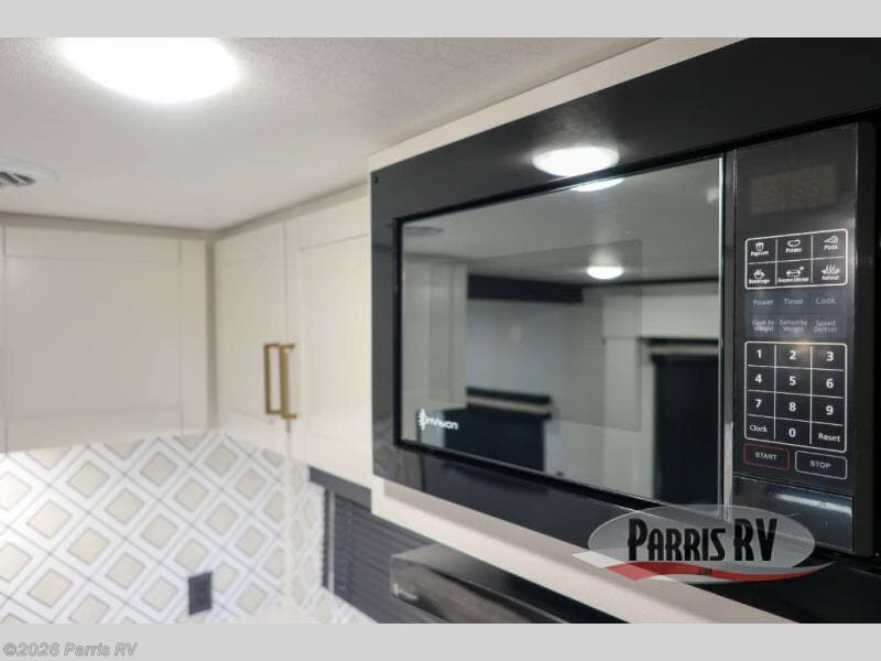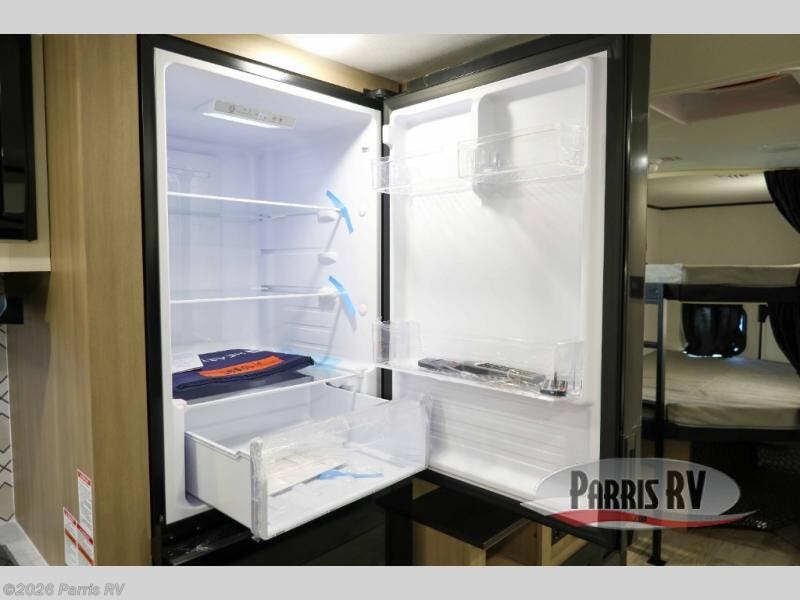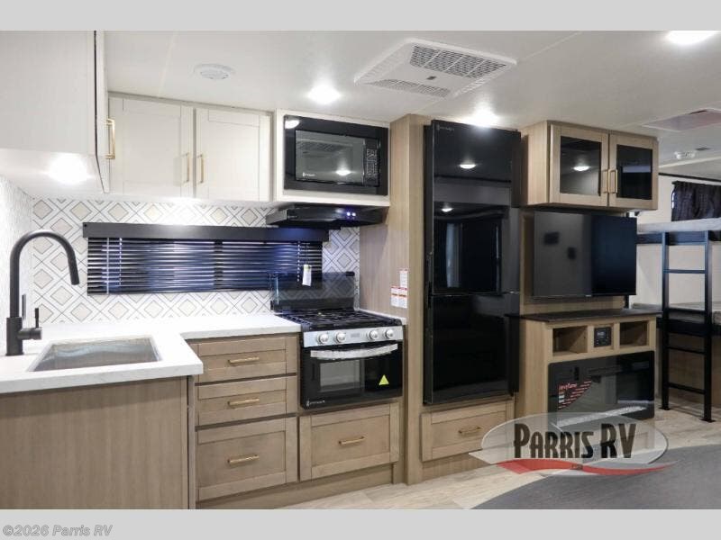 At the front of this trailer, you'll find a private bedroom featuring a 60" x 80" queen bed, complete with pull-out nightstands on each side for storing your essentials. This bedroom also includes one of the two convenient entry doors. In the center of the trailer, a spacious slide-out houses a 60" tri-fold sofa for relaxing, along with a roomy 40" x 82" U-dinette perfect for dining, game nights, or gathering with friends and family. Both the sofa and dinette convert into additional sleeping space when needed. Across from the slide is a fully equipped kitchen with a stainless-steel sink, 11 cu. ft. refrigerator, microwave, and overhead cabinets, plus a walk-in pantry offering plenty of room for snacks and dry goods. In the rear, one corner features two bunks with flip-up storage and a handy kayak door for easy gear access. The opposite corner holds a full bathroom with a 30" x 36" shower, foot-flush toilet, and corner sink. Just next the bunks is the second entry door, adding extra convenience for busy camping days.