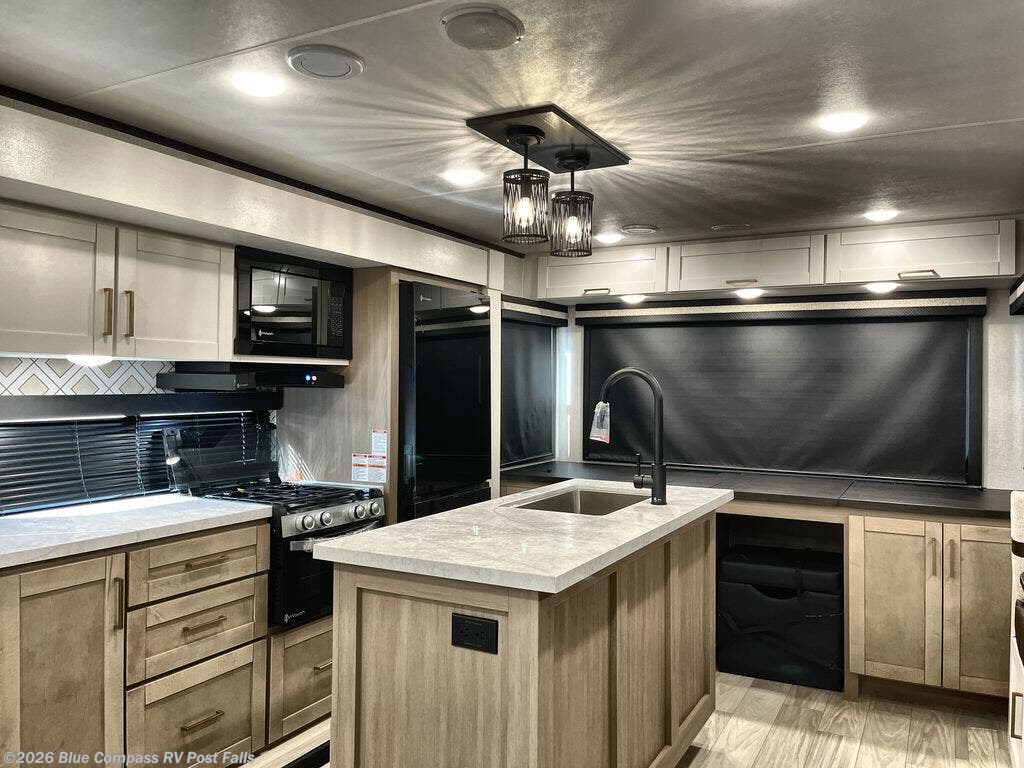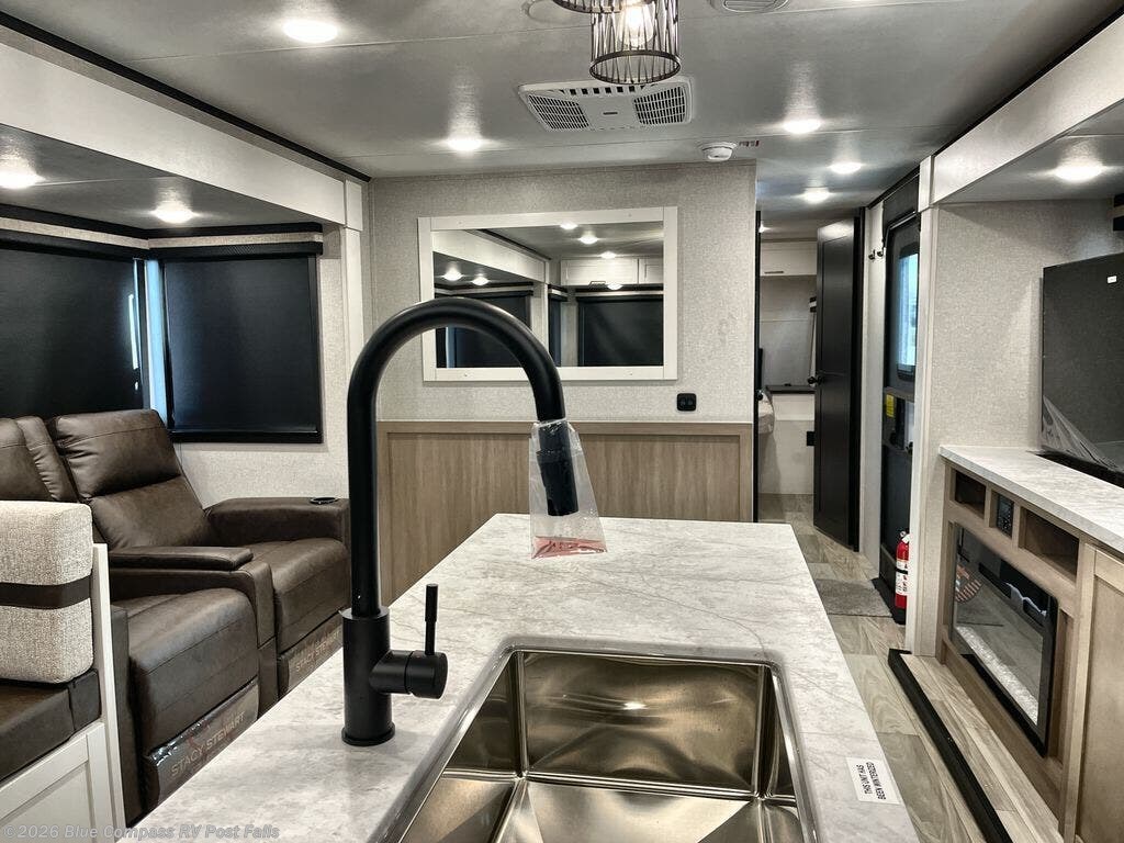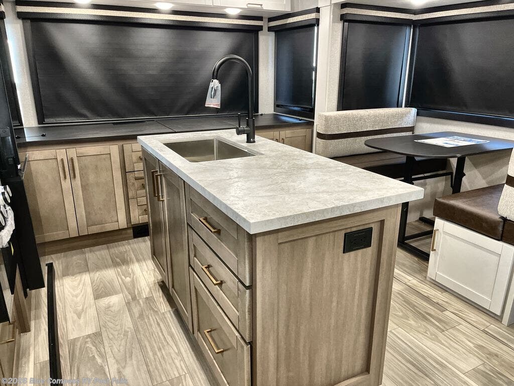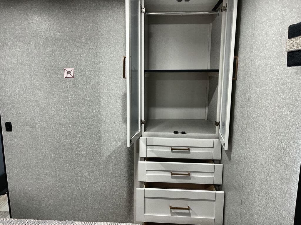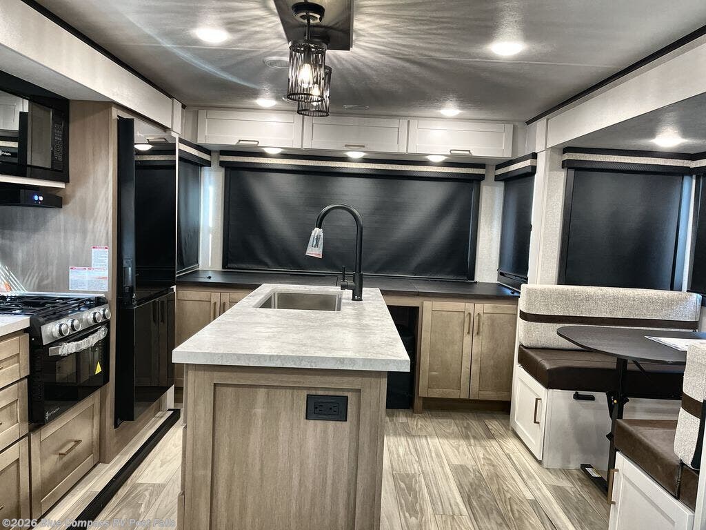 At the front, you'll find a private bedroom featuring a spacious 60" x 80" queen bed, in between nightstands on each side and overhead cabinets for convenient storage of your essentials. Moving down the hall, the full bathroom offers a 30" x 36" shower, a linen closet, and a medicine cabinet, perfect for keeping towels and skincare neatly organized. In the center of the space lies the kitchen and living area, enhanced by dual opposing slides that significantly open up the room for added comfort and functionality. One slide houses a 40" x 70" dinette ideal for meals or game nights, while a 60" tri-fold sofa provides a cozy lounging area, with both converting into additional sleeping space when needed. Centrally located, the kitchen island includes a sleek stainless-steel sink, while the opposing slide features a fully equipped kitchen with a three-burner cooktop, microwave, seamless countertops, and overhead cabinets for ample storage. For entertainment, a pop-up TV in the entertainment center ensures you can enjoy movie nights from the comfort of the sofa. At the rear, a dedicated desk with an ottoman creates a perfect nook for studying or working from home.