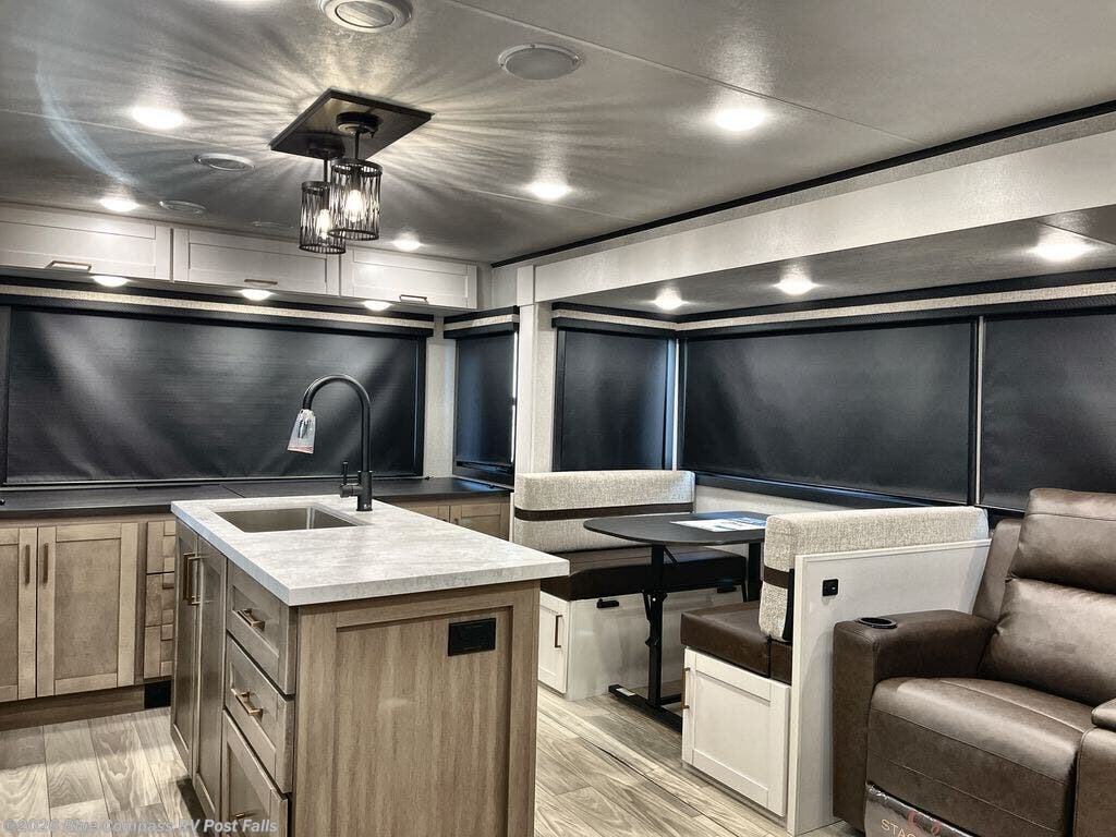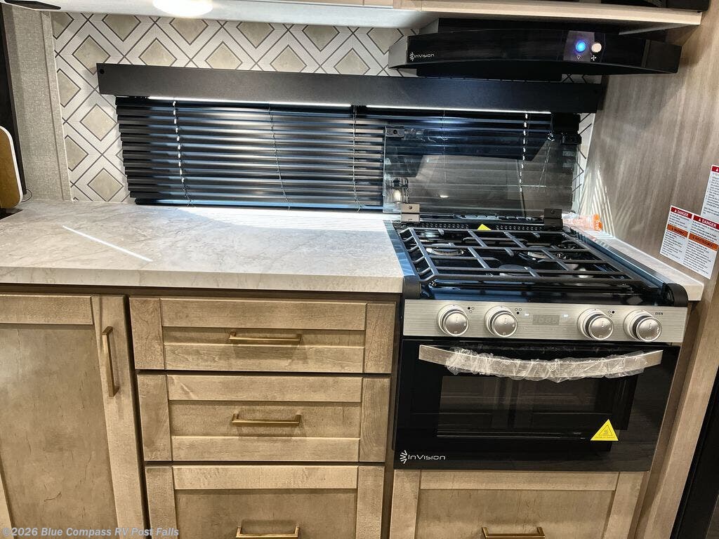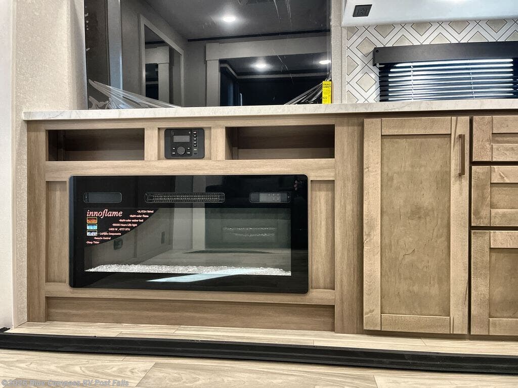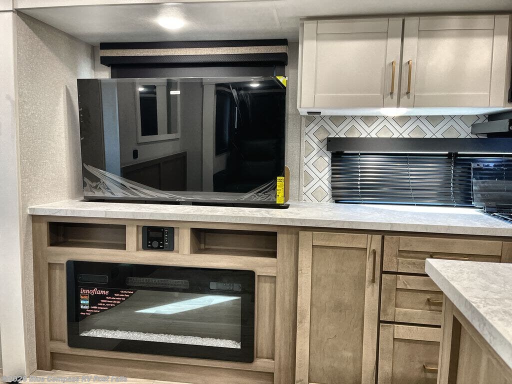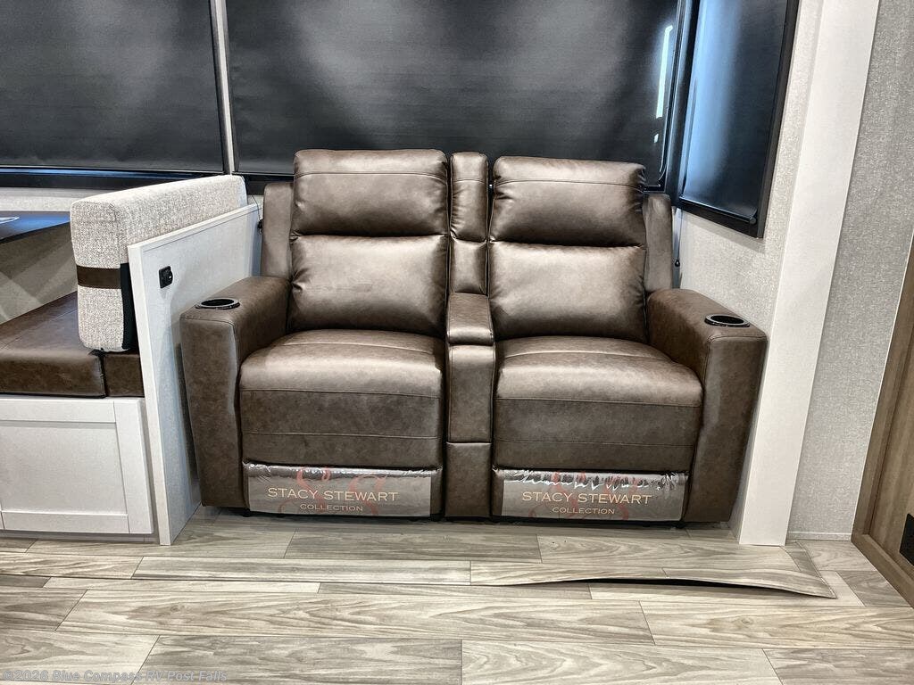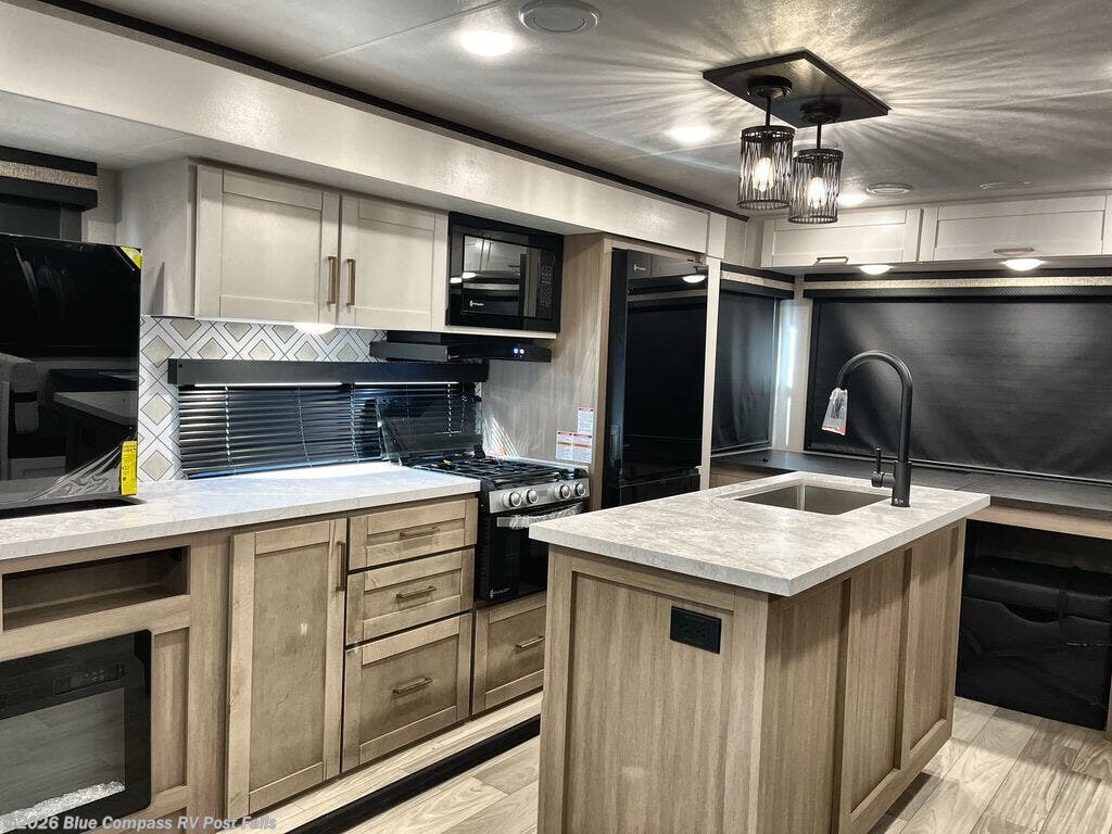 At the front, you'll find a private bedroom featuring a spacious 60" x 80" queen bed, in between nightstands on each side and overhead cabinets for convenient storage of your essentials. Moving down the hall, the full bathroom offers a 30" x 36" shower, a linen closet, and a medicine cabinet, perfect for keeping towels and skincare neatly organized. In the center of the space lies the kitchen and living area, enhanced by dual opposing slides that significantly open up the room for added comfort and functionality. One slide houses a 40" x 70" dinette ideal for meals or game nights, while a 60" tri-fold sofa provides a cozy lounging area, with both converting into additional sleeping space when needed. Centrally located, the kitchen island includes a sleek stainless-steel sink, while the opposing slide features a fully equipped kitchen with a three-burner cooktop, microwave, seamless countertops, and overhead cabinets for ample storage. For entertainment, a pop-up TV in the entertainment center ensures you can enjoy movie nights from the comfort of the sofa. At the rear, a dedicated desk with an ottoman creates a perfect nook for studying or working from home.