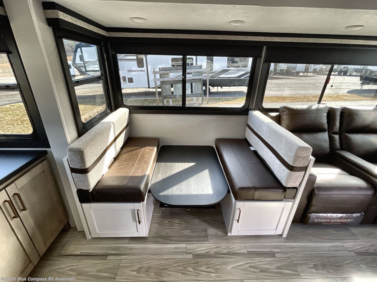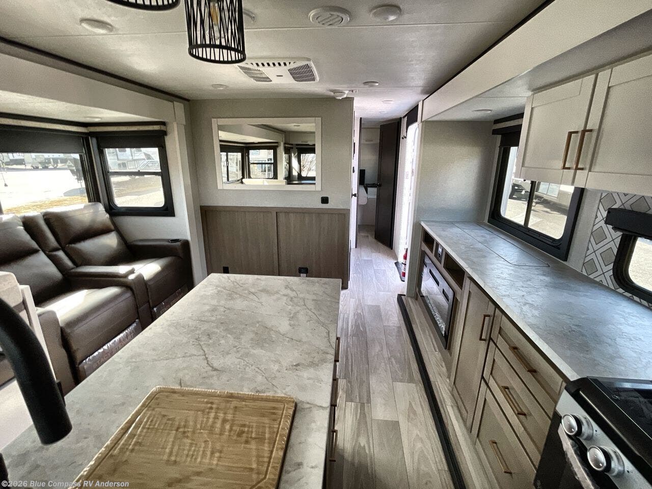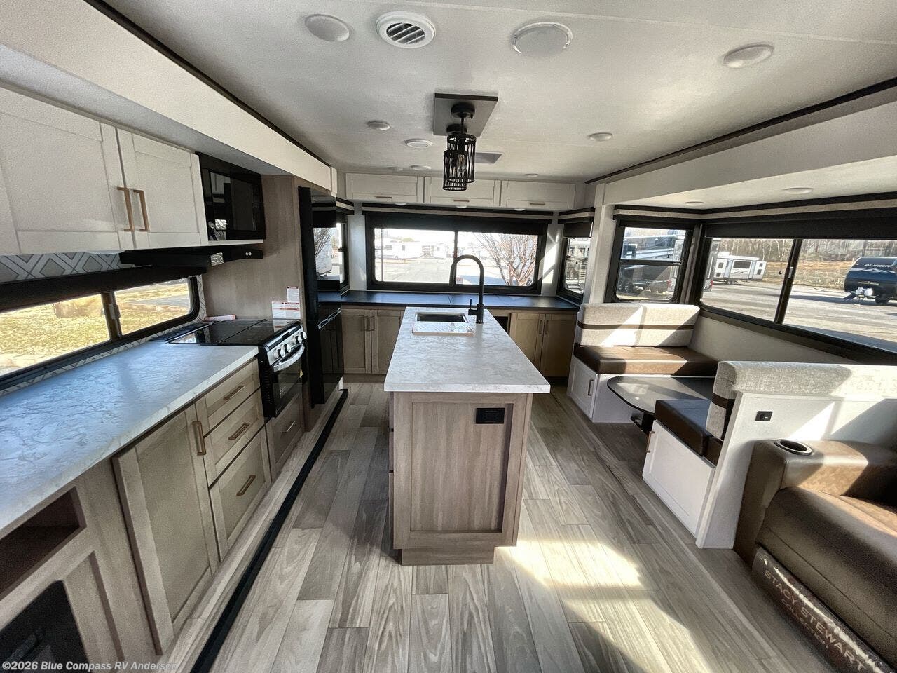 At the front, you'll find a private bedroom featuring a spacious 60" x 80" queen bed, in between nightstands on each side and overhead cabinets for convenient storage of your essentials. Moving down the hall, the full bathroom offers a 30" x 36" shower, a linen closet, and a medicine cabinet, perfect for keeping towels and skincare neatly organized. In the center of the space lies the kitchen and living area, enhanced by dual opposing slides that significantly open up the room for added comfort and functionality. One slide houses a 40" x 70" dinette ideal for meals or game nights, while a 60" tri-fold sofa provides a cozy lounging area, with both converting into additional sleeping space when needed. Centrally located, the kitchen island includes a sleek stainless-steel sink, while the opposing slide features a fully equipped kitchen with a three-burner cooktop, microwave, seamless countertops, and overhead cabinets for ample storage. For entertainment, a pop-up TV in the entertainment center ensures you can enjoy movie nights from the comfort of the sofa. At the rear, a dedicated desk with an ottoman creates a perfect nook for studying or working from home.