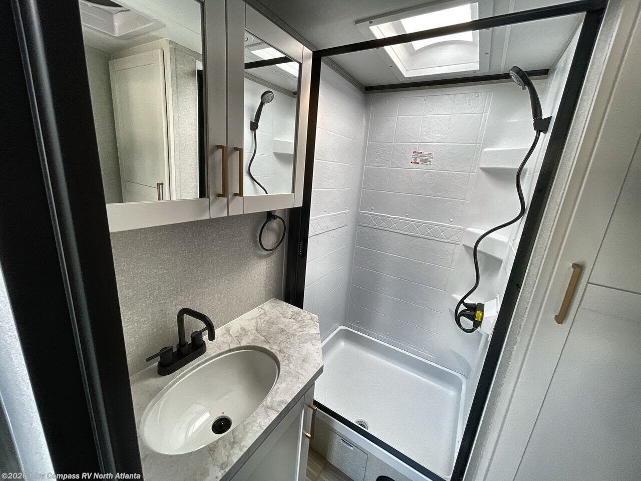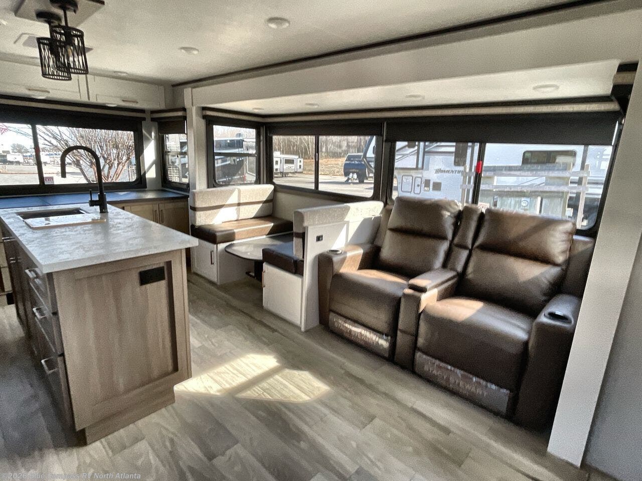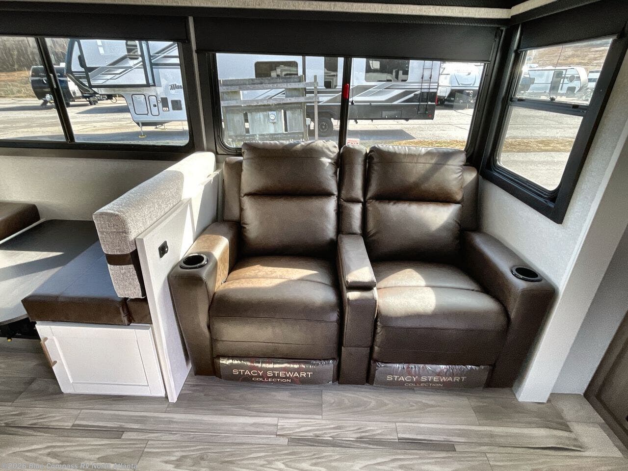 At the front, you'll find a private bedroom featuring a spacious 60" x 80" queen bed, in between nightstands on each side and overhead cabinets for convenient storage of your essentials. Moving down the hall, the full bathroom offers a 30" x 36" shower, a linen closet, and a medicine cabinet, perfect for keeping towels and skincare neatly organized. In the center of the space lies the kitchen and living area, enhanced by dual opposing slides that significantly open up the room for added comfort and functionality. One slide houses a 40" x 70" dinette ideal for meals or game nights, while a 60" tri-fold sofa provides a cozy lounging area, with both converting into additional sleeping space when needed. Centrally located, the kitchen island includes a sleek stainless-steel sink, while the opposing slide features a fully equipped kitchen with a three-burner cooktop, microwave, seamless countertops, and overhead cabinets for ample storage. For entertainment, a pop-up TV in the entertainment center ensures you can enjoy movie nights from the comfort of the sofa. At the rear, a dedicated desk with an ottoman creates a perfect nook for studying or working from home.