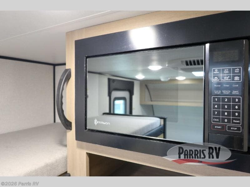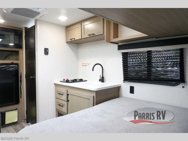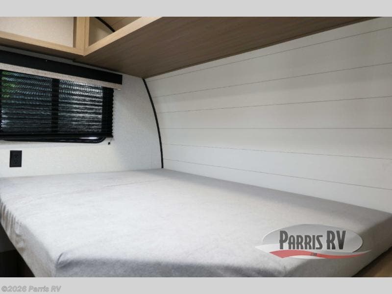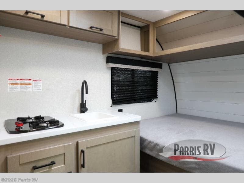 This lightweight travel trailer is easy to tow and easy to love! Once you arrive at your campsite and unload your things, you can make lunch on the two-burner cooktop or in the microwave oven, and there is a 12V refrigerator to keep cold drinks stocked. A private bath includes a shower and toilet, which will allow you to freshen up each day, and the bunk beds provide compact sleeping space for guests! You can take the front 54" x 74" full-size bed with a wardrobe/nightstand at the foot of the bed to keep your things tidy.
