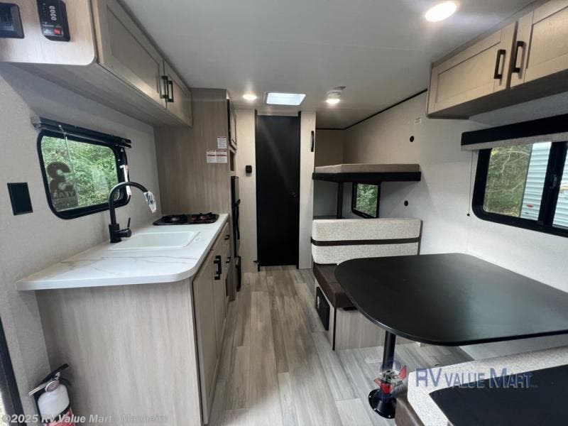 Camping trips are made easy in this Lynx Edition travel trailer with bunk beds for guests or little ones. You'll find the front queen bed for a great night's rest, along with a nightstand and wardrobe to keep your things tidy. The rear corner private bath includes a foot-flush toilet and a 24" x 36" shower, so you won't have to leave the camper in the middle of the night. A two-burner cooktop and microwave oven will let you make meals each day, and a 12V refrigerator will keep your food fresh!