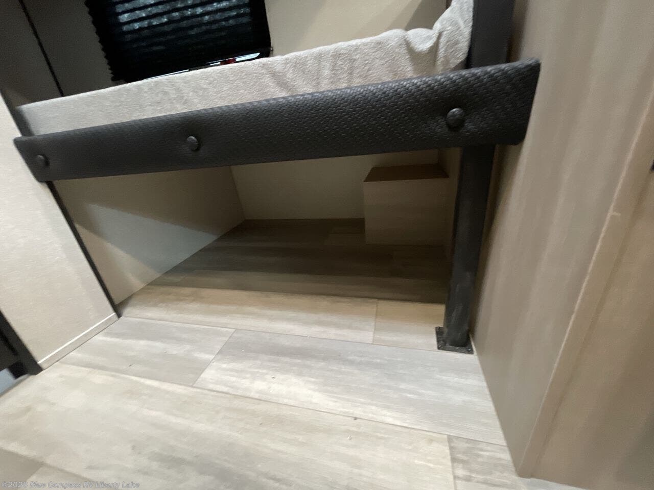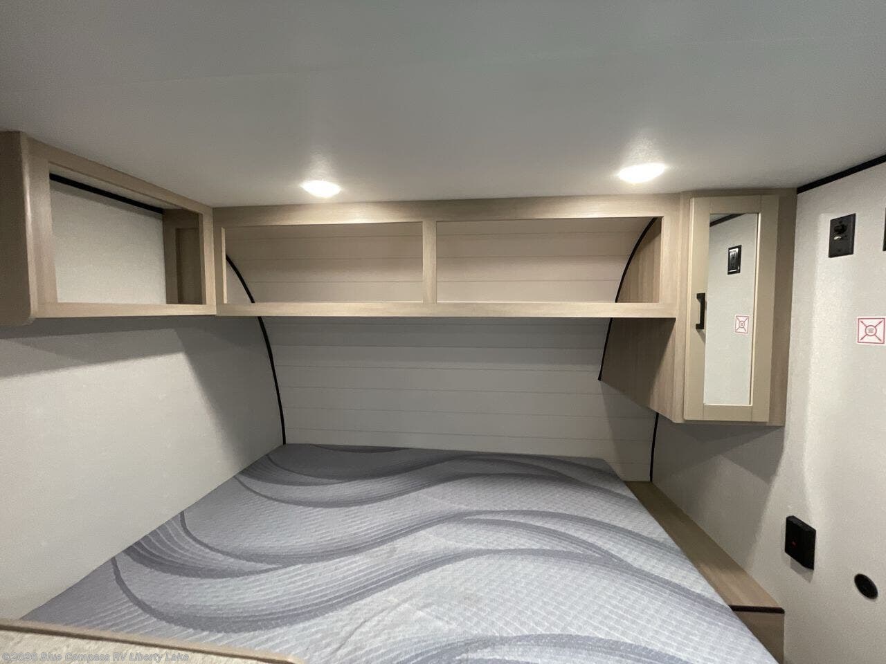 Camping trips are made easy in this Lynx Edition travel trailer with bunk beds for guests or little ones. You'll find the front queen bed for a great night's rest, along with a nightstand and wardrobe to keep your things tidy. The rear corner private bath includes a foot-flush toilet and a 24" x 36" shower, so you won't have to leave the camper in the middle of the night. A two-burner cooktop and microwave oven will let you make meals each day, and a 12V refrigerator will keep your food fresh!
