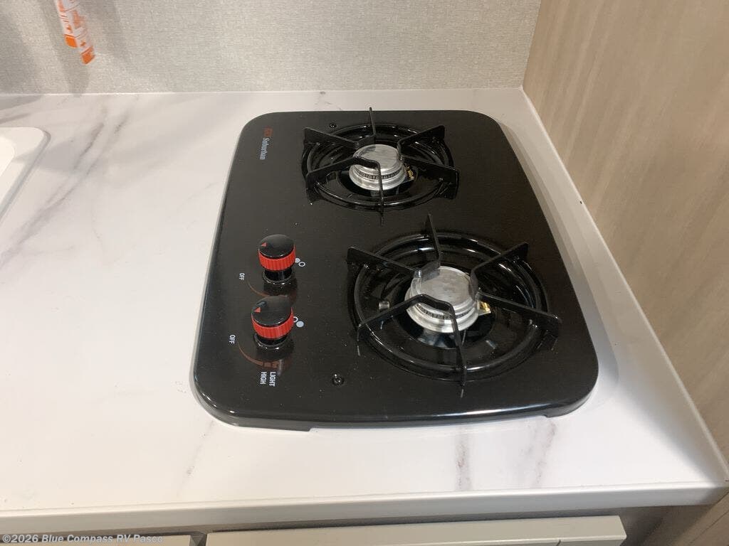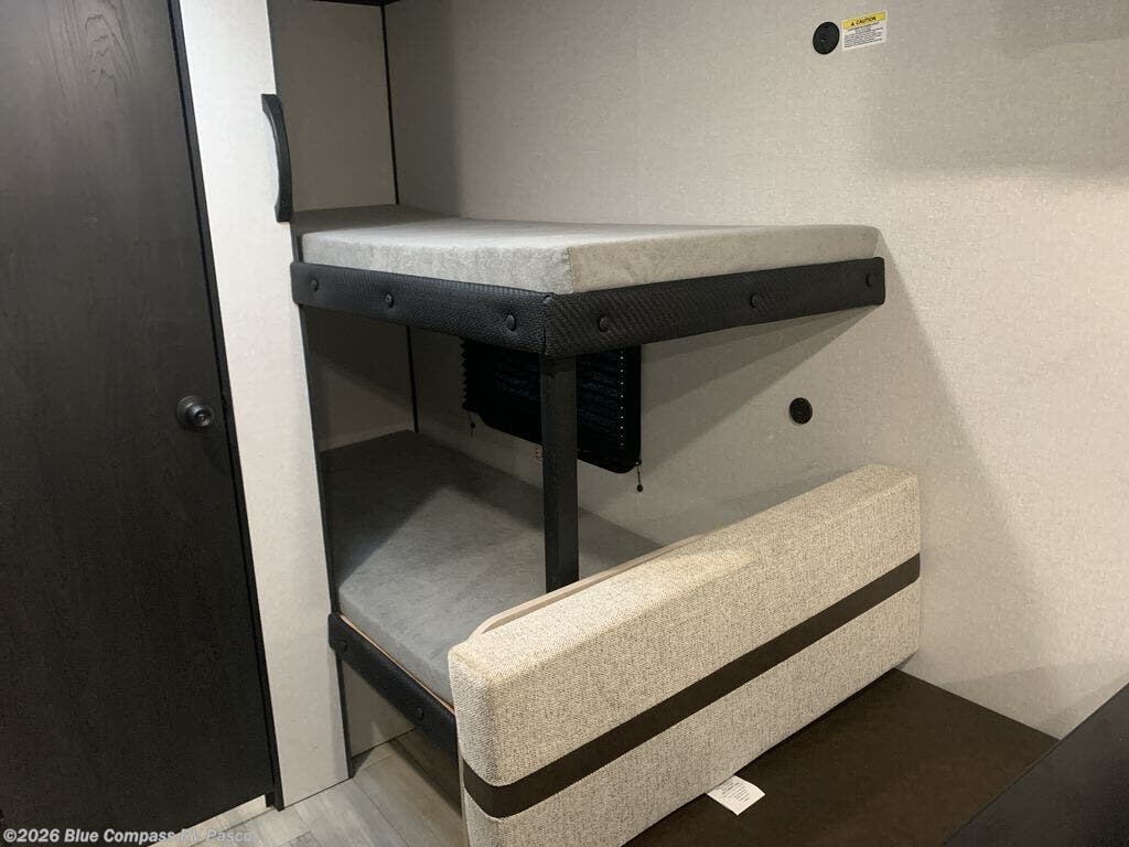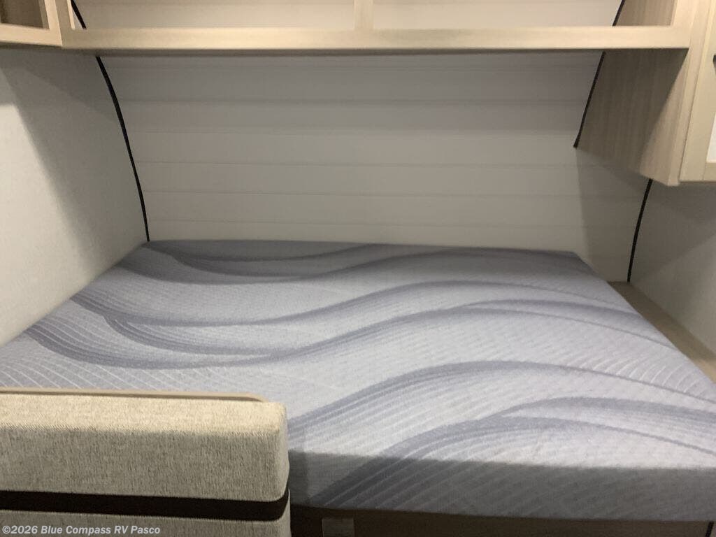 Camping trips are made easy in this Lynx Edition travel trailer with bunk beds for guests or little ones. You'll find the front queen bed for a great night's rest, along with a nightstand and wardrobe to keep your things tidy. The rear corner private bath includes a foot-flush toilet and a 24" x 36" shower, so you won't have to leave the camper in the middle of the night. A two-burner cooktop and microwave oven will let you make meals each day, and a 12V refrigerator will keep your food fresh!