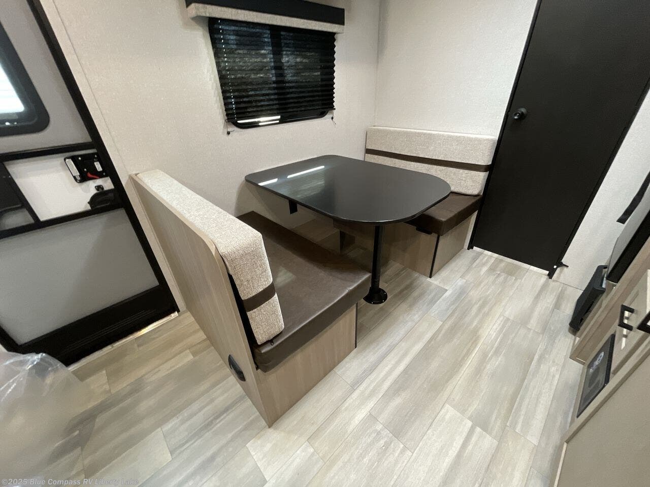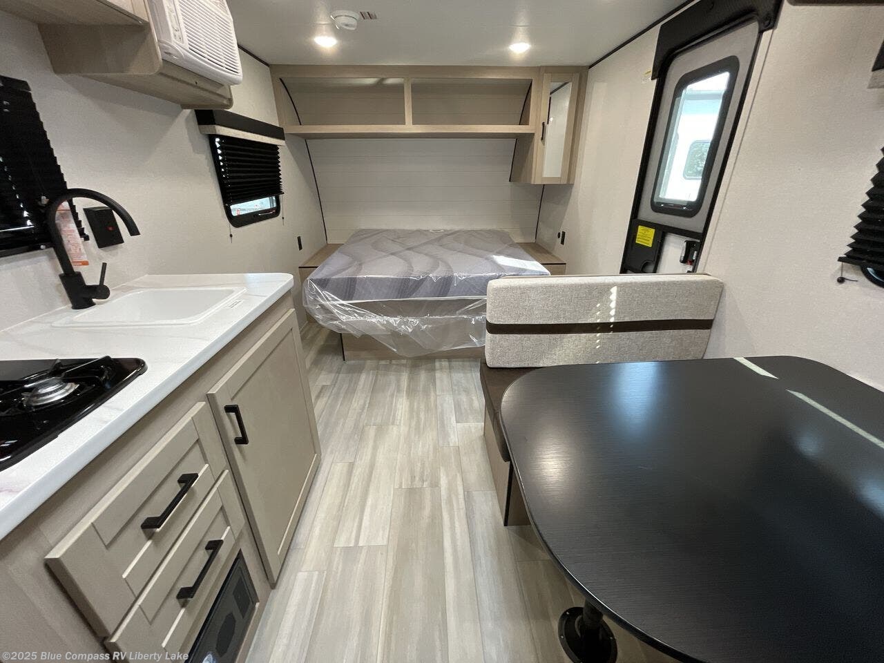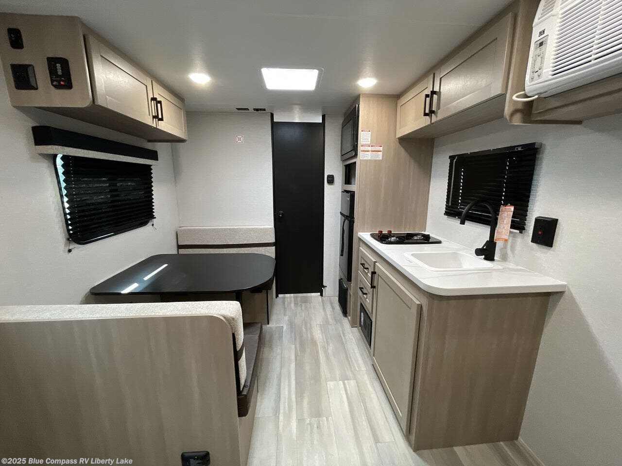 This travel trailer provides you with a little more privacy thanks to the rear bath, which also includes a bath linen closet and shelves for extra storage. The front bedroom includes a walk-around RV queen bed to make it easier to make the bed, and you'll find an overhead shelf for books or games. Once you've made lunch on the two-burner cooktop or in the microwave oven, you can dine at the booth dinette or take your plate outdoors to sit under the 10' power awning.