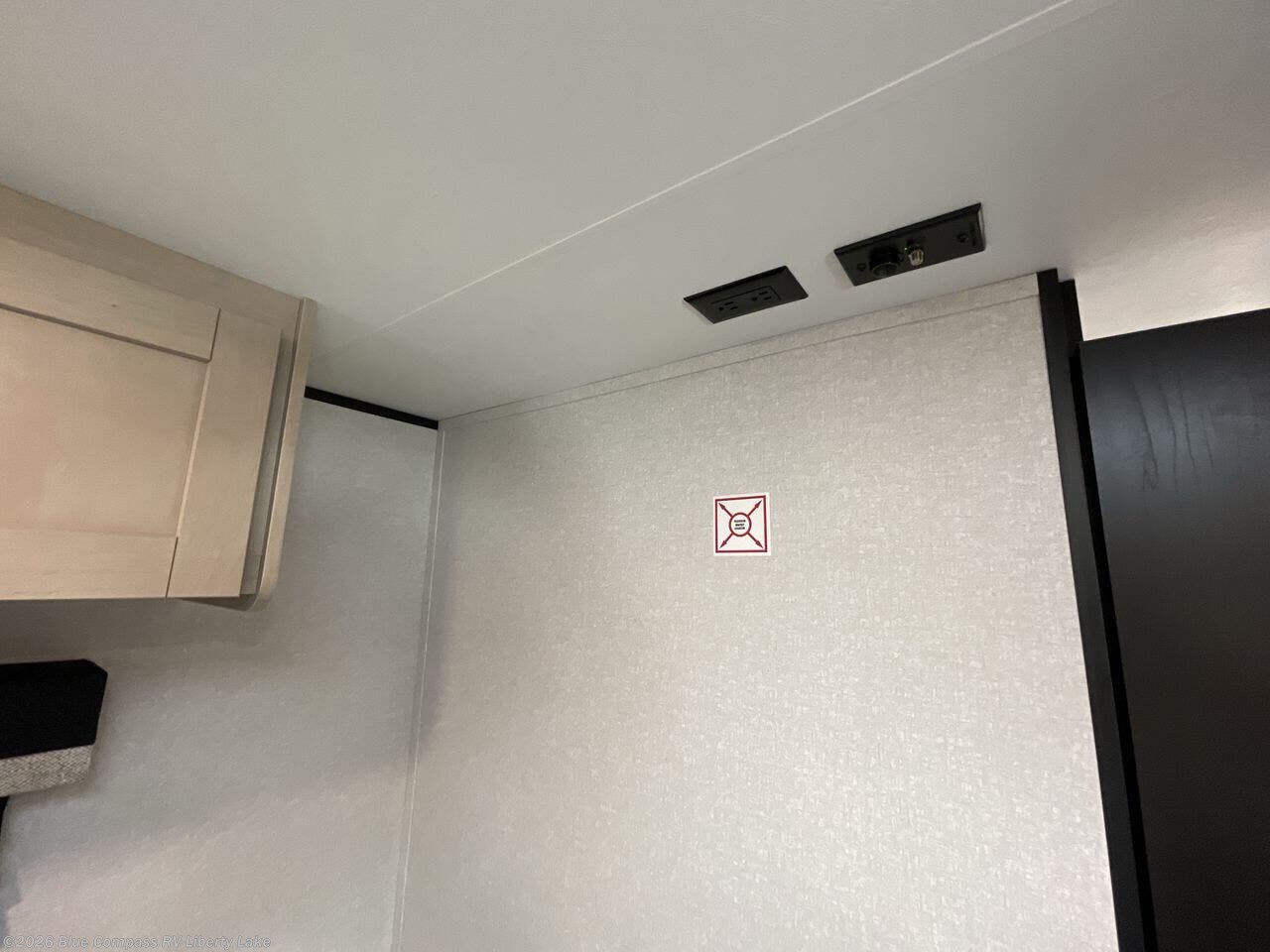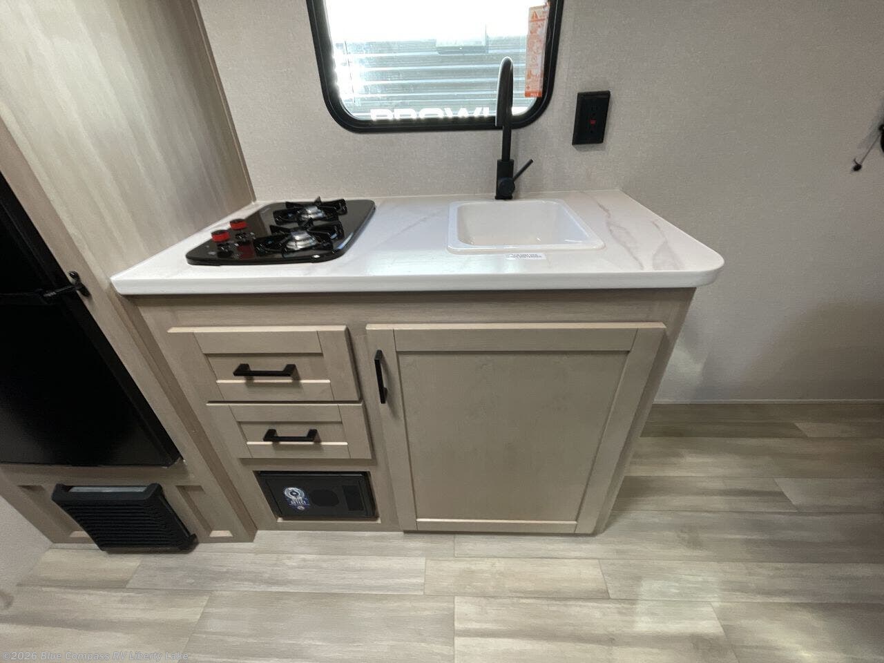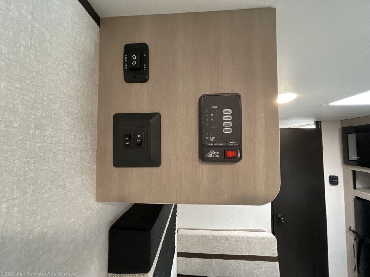 This travel trailer provides you with a little more privacy thanks to the rear bath, which also includes a bath linen closet and shelves for extra storage. The front bedroom includes a walk-around RV queen bed to make it easier to make the bed, and you'll find an overhead shelf for books or games. Once you've made lunch on the two-burner cooktop or in the microwave oven, you can dine at the booth dinette or take your plate outdoors to sit under the 10' power awning.
