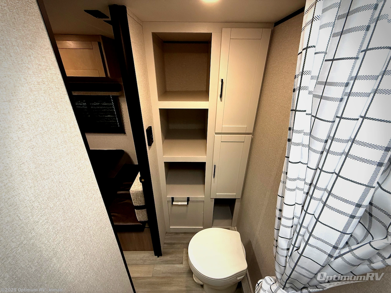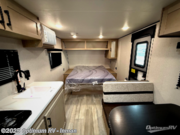 This travel trailer provides you with a little more privacy thanks to the rear bath, which also includes a bath linen closet and shelves for extra storage. The front bedroom includes a walk-around RV queen bed to make it easier to make the bed, and you'll find an overhead shelf for books or games. Once you've made lunch on the two-burner cooktop or in the microwave oven, you can dine at the booth dinette or take your plate outdoors to sit under the 10' power awning.