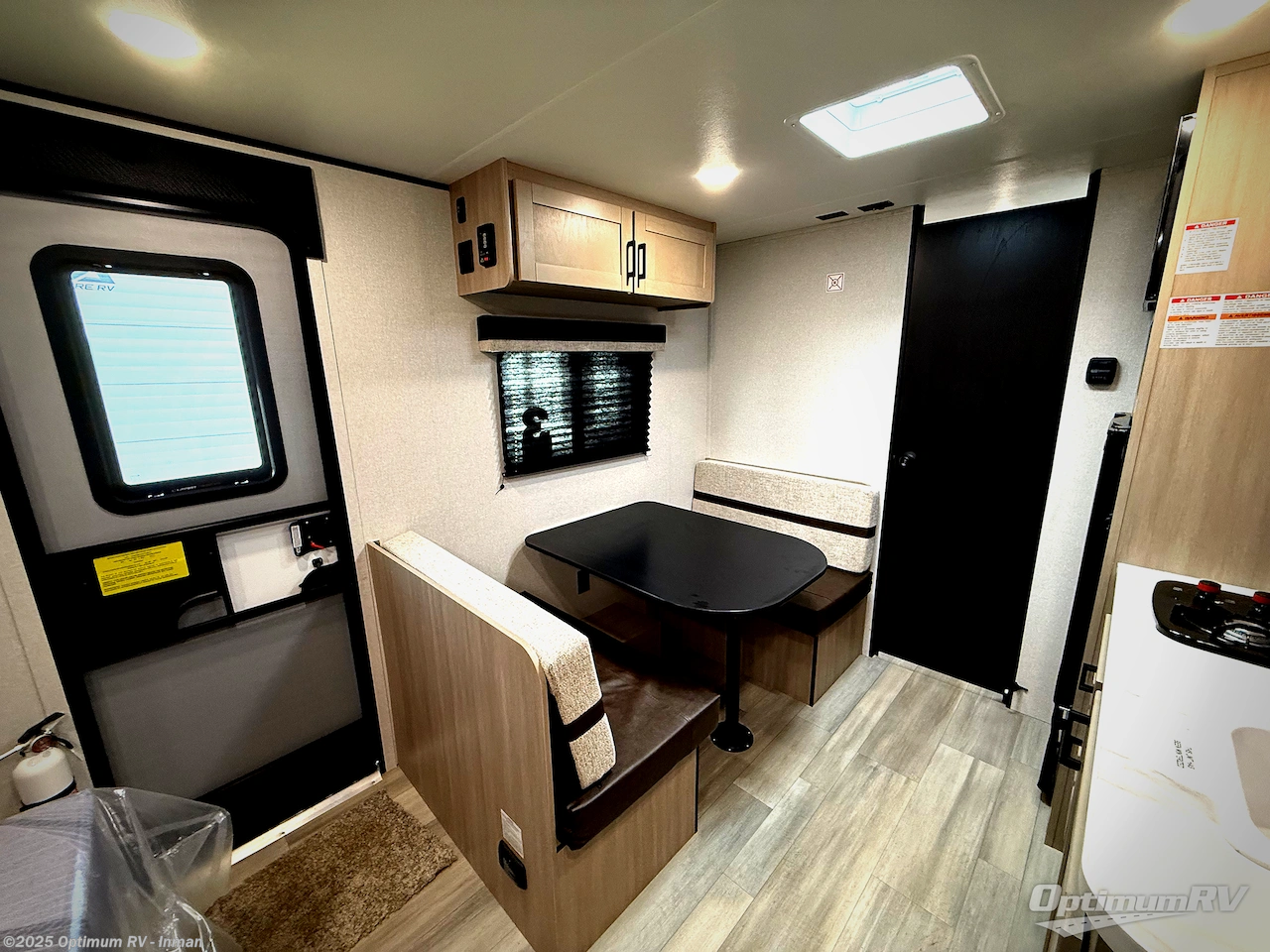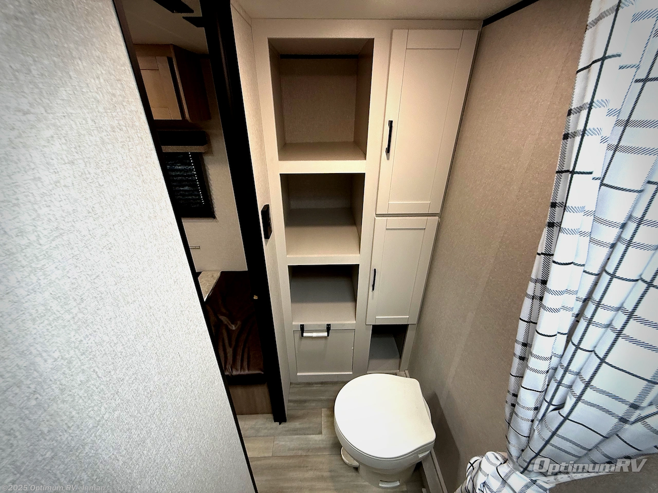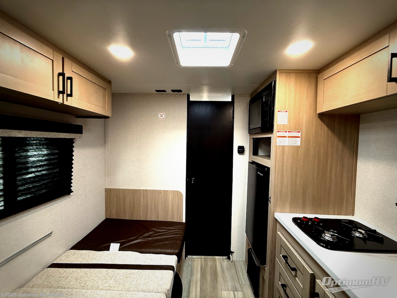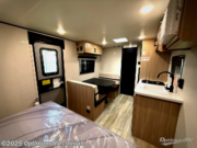 This travel trailer provides you with a little more privacy thanks to the rear bath, which also includes a bath linen closet and shelves for extra storage. The front bedroom includes a walk-around RV queen bed to make it easier to make the bed, and you'll find an overhead shelf for books or games. Once you've made lunch on the two-burner cooktop or in the microwave oven, you can dine at the booth dinette or take your plate outdoors to sit under the 10' power awning.
