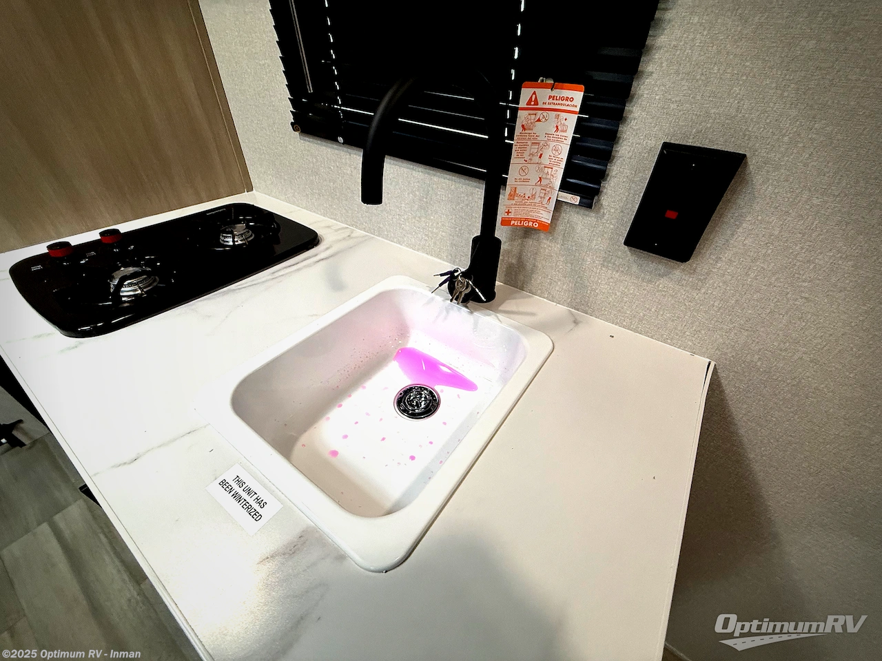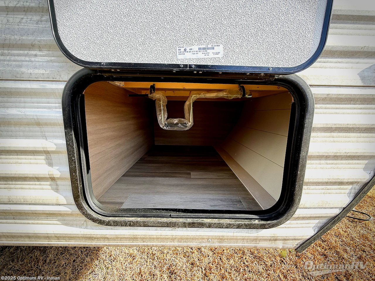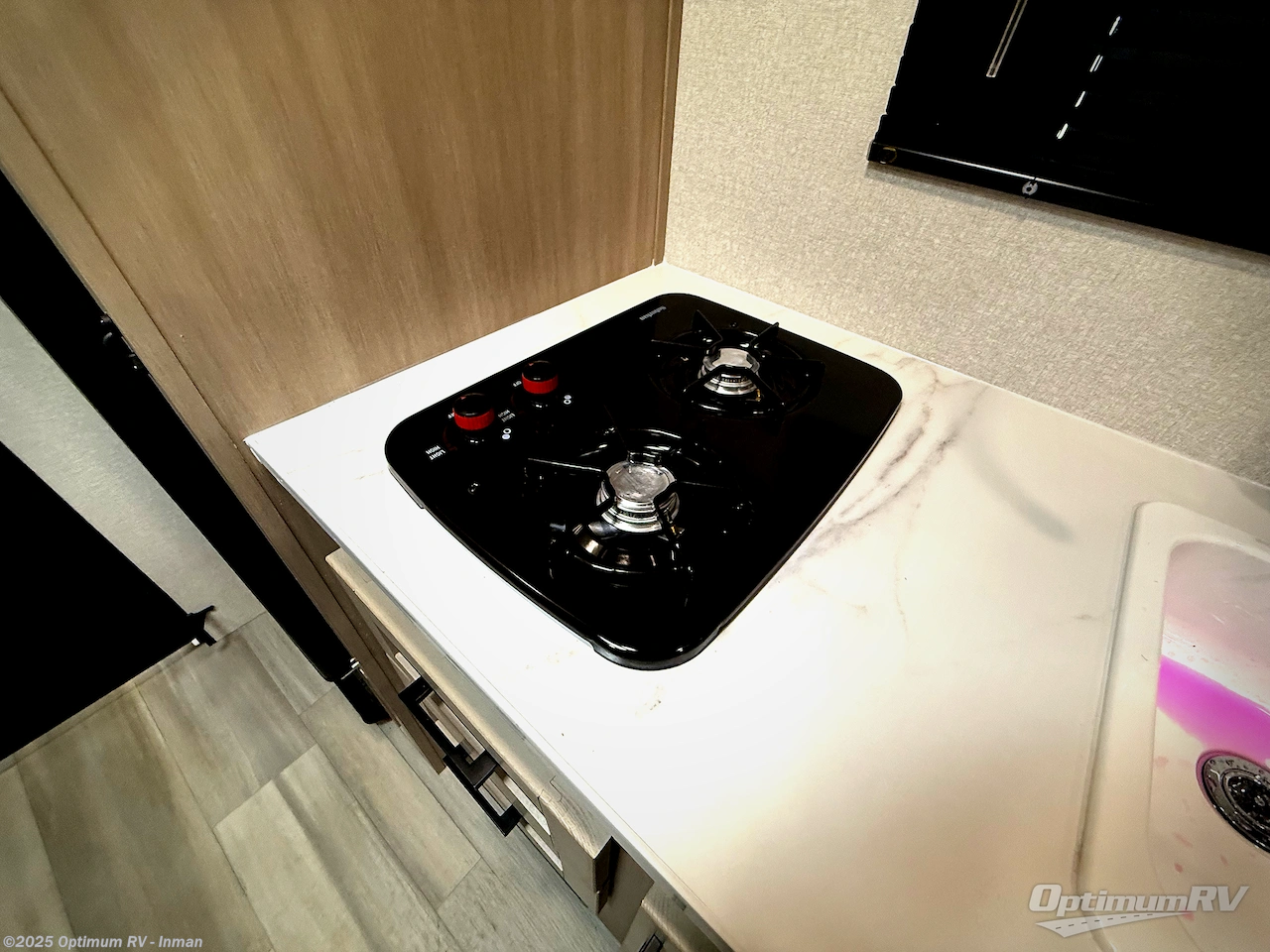 This travel trailer provides you with a little more privacy thanks to the rear bath, which also includes a bath linen closet and shelves for extra storage. The front bedroom includes a walk-around RV queen bed to make it easier to make the bed, and you'll find an overhead shelf for books or games. Once you've made lunch on the two-burner cooktop or in the microwave oven, you can dine at the booth dinette or take your plate outdoors to sit under the 10' power awning.