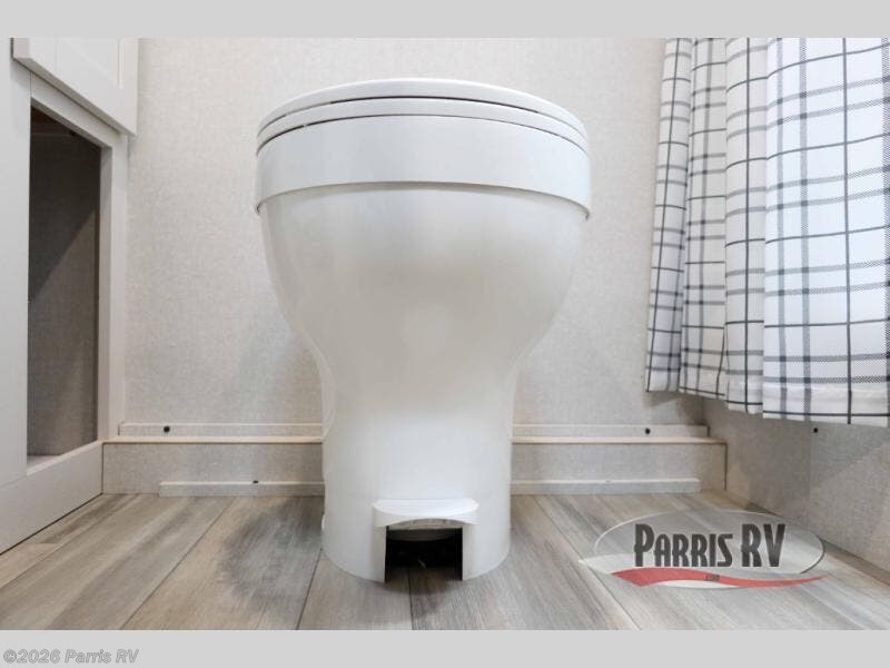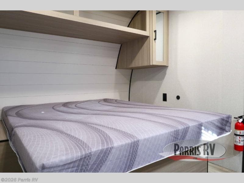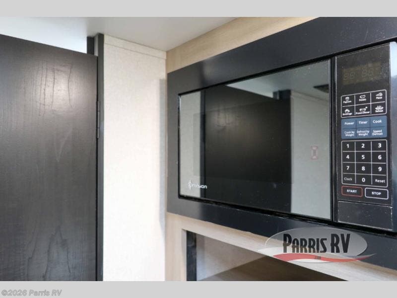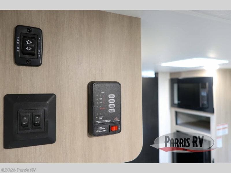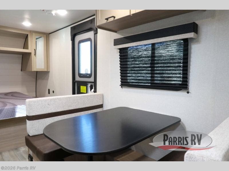 This travel trailer provides you with a little more privacy thanks to the rear bath, which also includes a bath linen closet and shelves for extra storage. The front bedroom includes a walk-around RV queen bed to make it easier to make the bed, and you'll find an overhead shelf for books or games. Once you've made lunch on the two-burner cooktop or in the microwave oven, you can dine at the booth dinette or take your plate outdoors to sit under the 10' power awning.