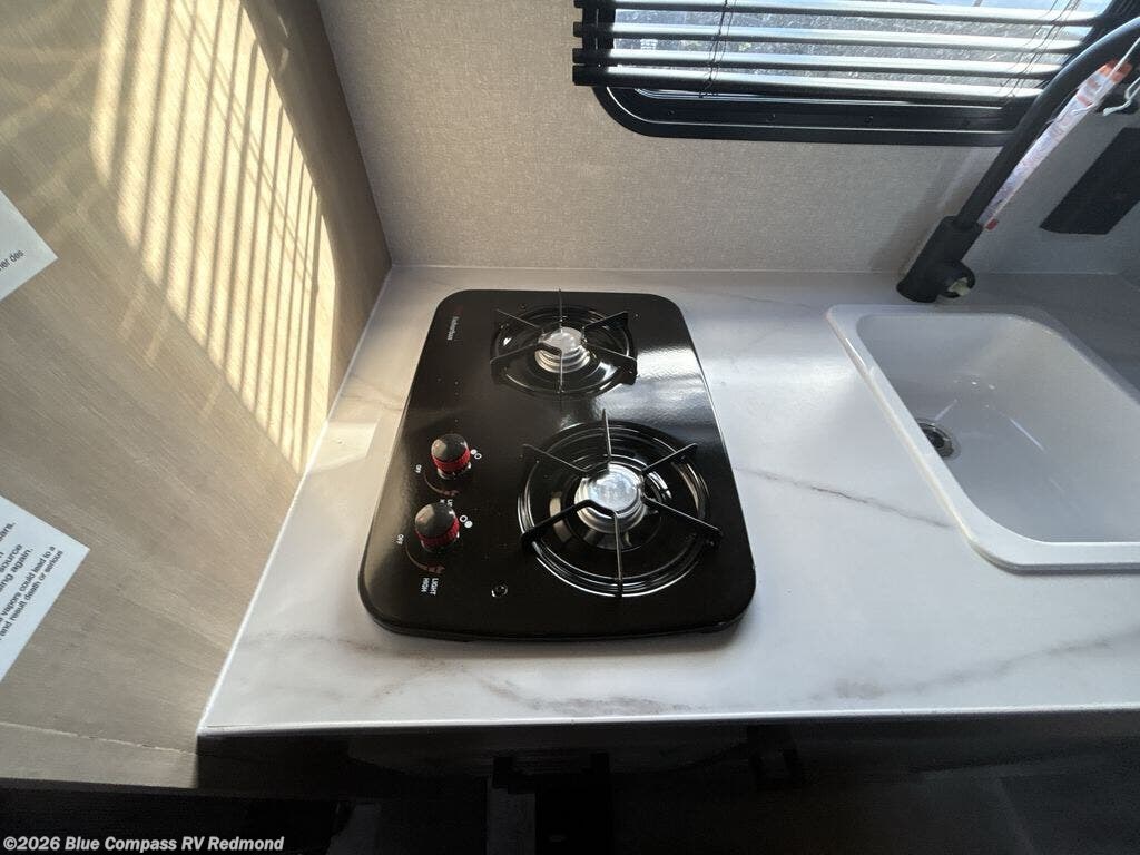This travel trailer provides you with a little more privacy thanks to the rear bath, which also includes a bath linen closet and shelves for extra storage. The front bedroom includes a walk-around RV queen bed to make it easier to make the bed, and you'll find an overhead shelf for books or games. Once you've made lunch on the two-burner cooktop or in the microwave oven, you can dine at the booth dinette or take your plate outdoors to sit under the 10' power awning.