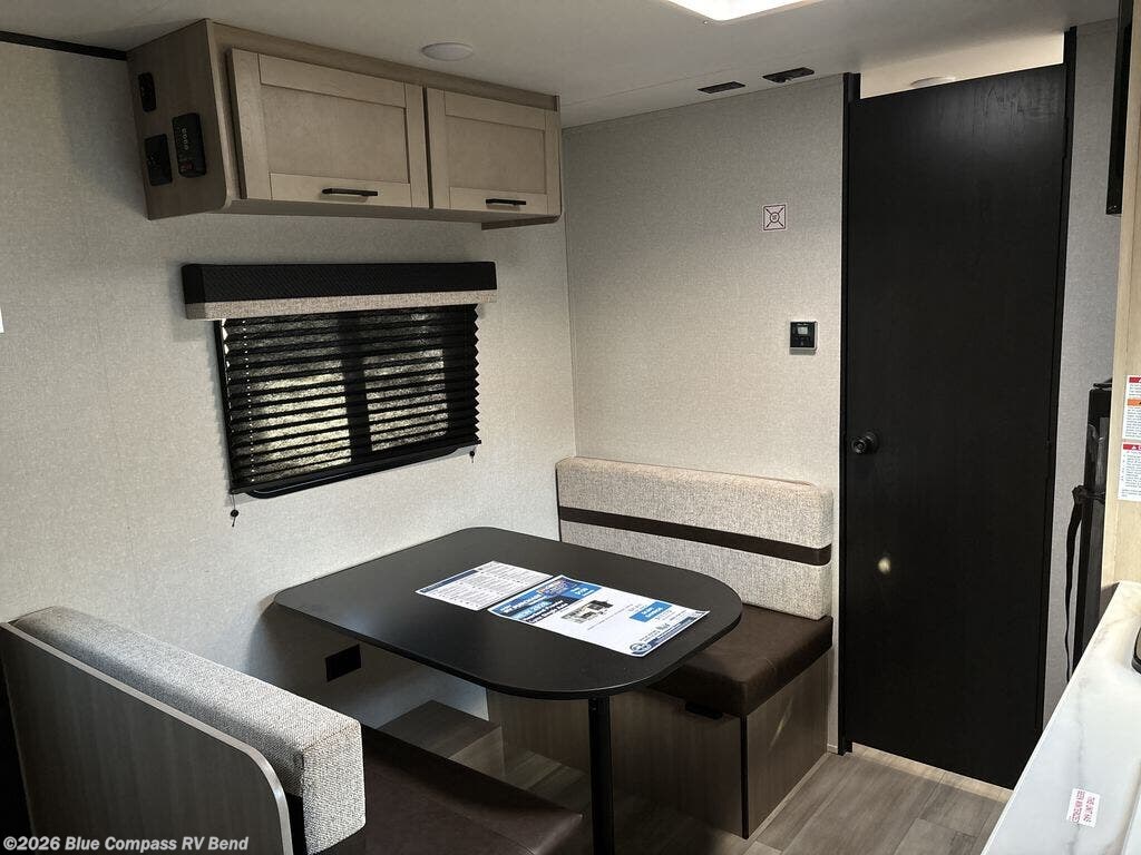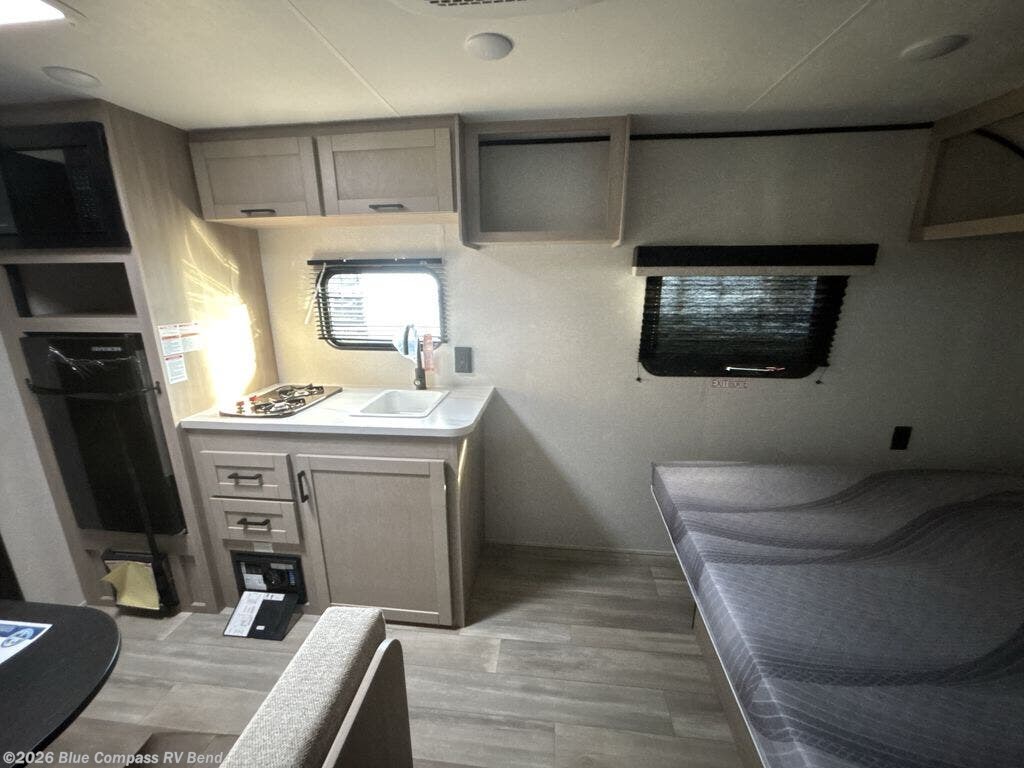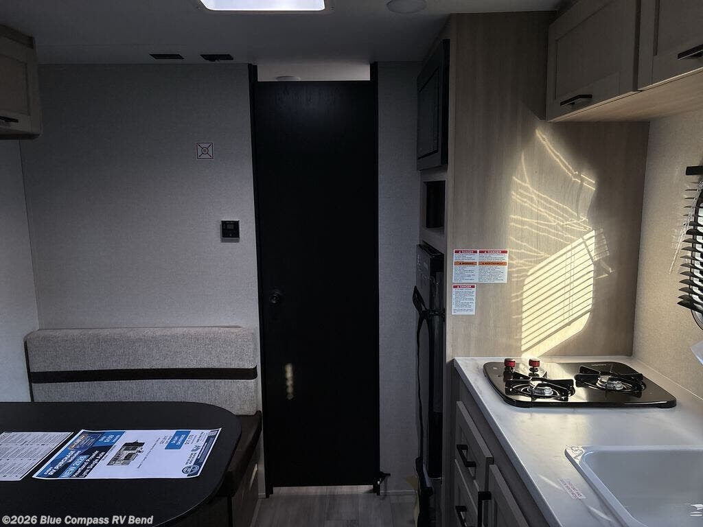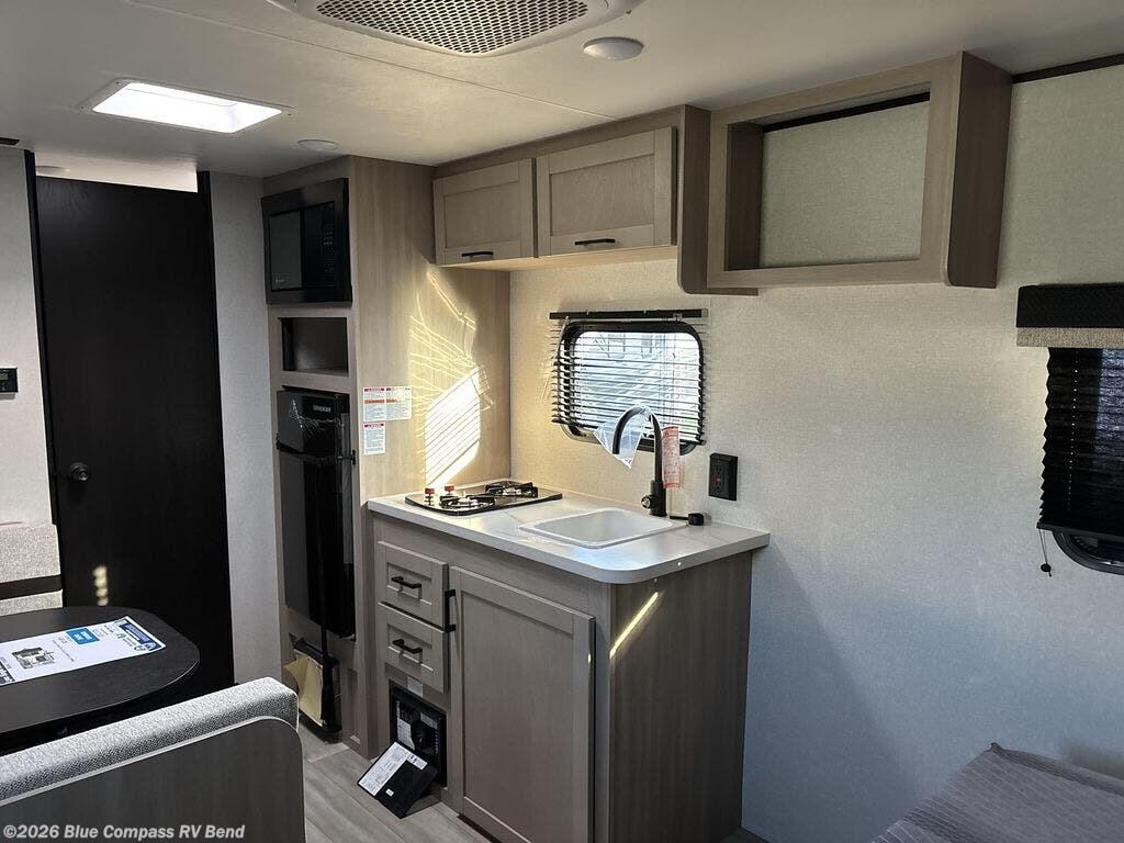 This travel trailer provides you with a little more privacy thanks to the rear bath, which also includes a bath linen closet and shelves for extra storage. The front bedroom includes a walk-around RV queen bed to make it easier to make the bed, and you'll find an overhead shelf for books or games. Once you've made lunch on the two-burner cooktop or in the microwave oven, you can dine at the booth dinette or take your plate outdoors to sit under the 10' power awning.