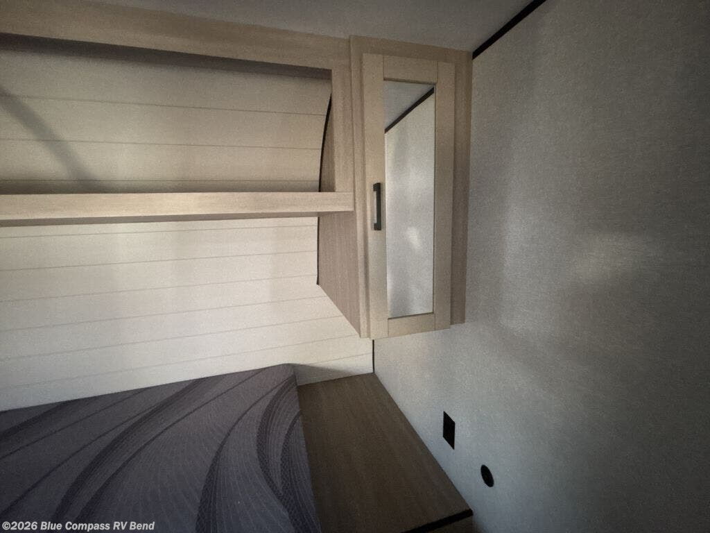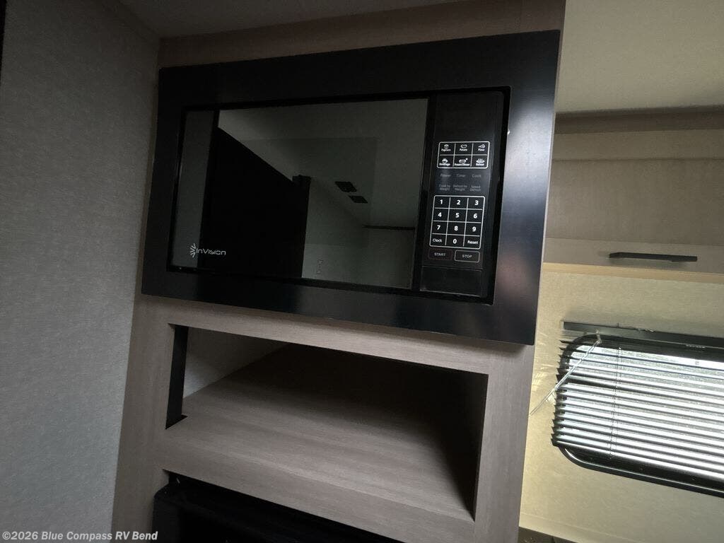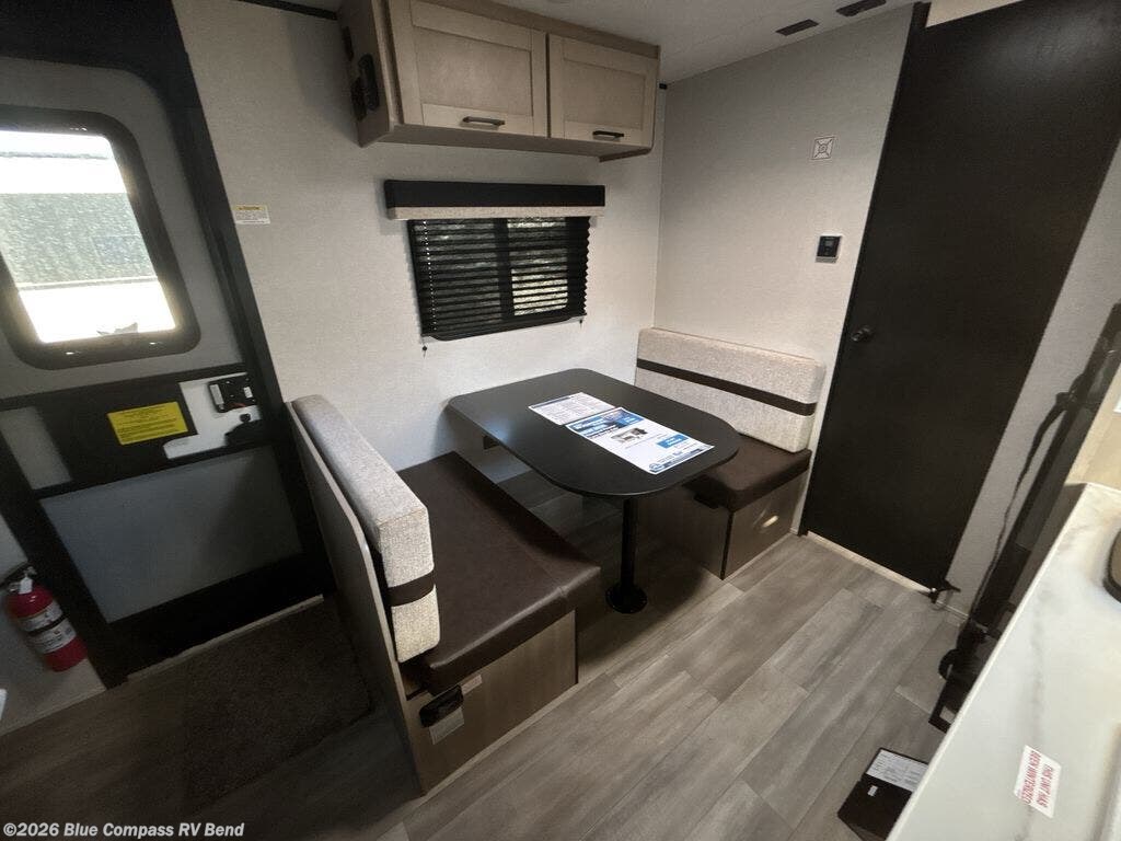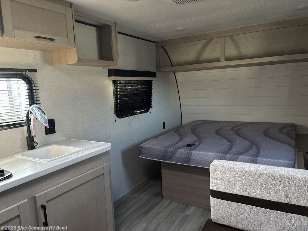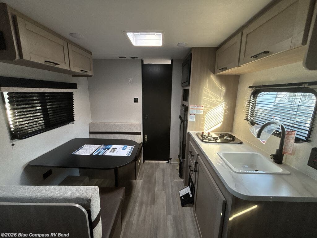 This travel trailer provides you with a little more privacy thanks to the rear bath, which also includes a bath linen closet and shelves for extra storage. The front bedroom includes a walk-around RV queen bed to make it easier to make the bed, and you'll find an overhead shelf for books or games. Once you've made lunch on the two-burner cooktop or in the microwave oven, you can dine at the booth dinette or take your plate outdoors to sit under the 10' power awning.