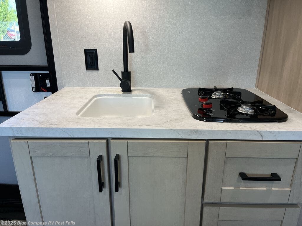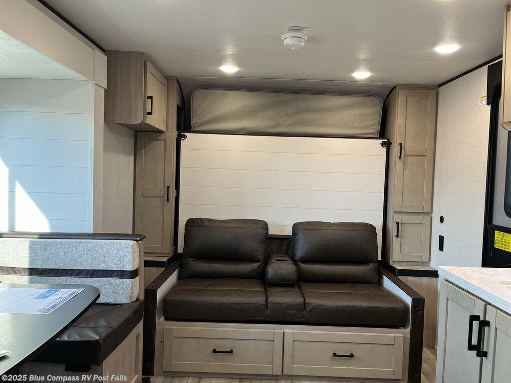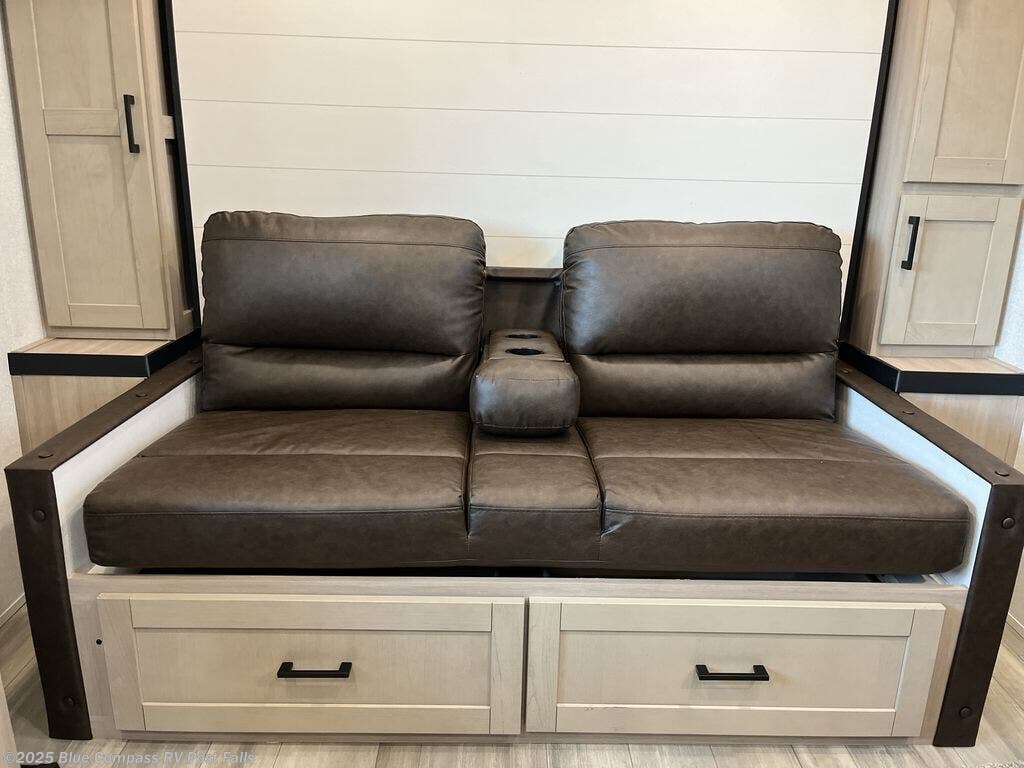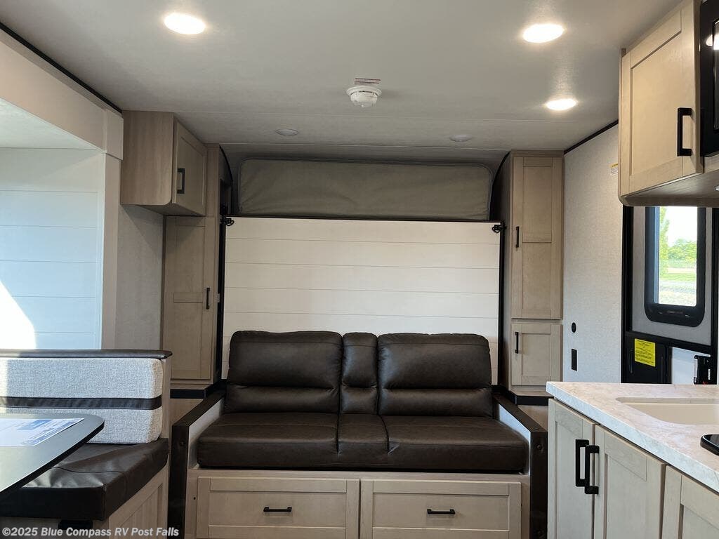 Camping trips are made easy in this travel trailer with double-size bunk beds for guests or little ones. There is a front Murphy bed that will provide you with more space during the day when you put it away to reveal the jack knife sofa. The rear corner full bath includes a foot-flush toilet, a 30" x 36" shower and a sink, so you won't have to leave the camper in the middle of the night. A two-burner cooktop and microwave oven will let you make meals each day, and you can dine around the U-shaped dinette, which is also within a slide out for more space!