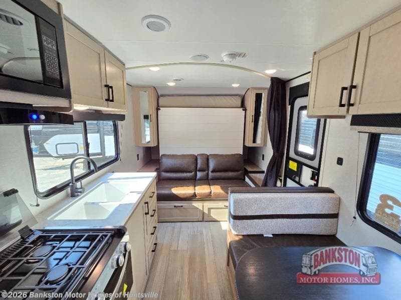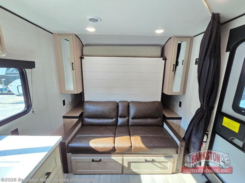 Camping trips are made easy in this travel trailer with double-size bunk beds for guests or little ones. There is a front Murphy bed that will provide you with more space during the day when you put it away to reveal the jack knife sofa. The rear corner full bath includes a foot-flush toilet, a 24" x 40" shower, so you won't have to leave the camper in the middle of the night. A three-burner cooktop and microwave oven will let you make meals each day, and you can dine at the booth dinette or take your plate outdoors to sit under the 16' power awning with LED lights!