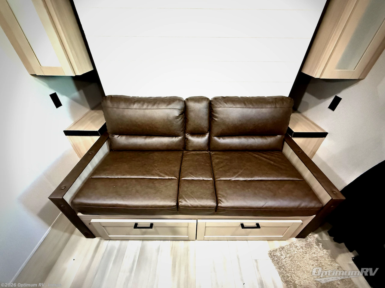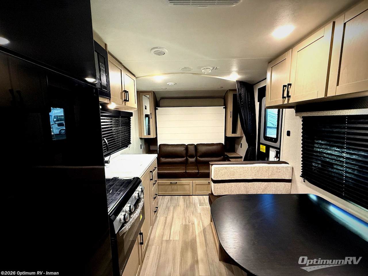 Camping trips are made easy in this travel trailer with double-size bunk beds for guests or little ones. There is a front Murphy bed that will provide you with more space during the day when you put it away to reveal the jack knife sofa. The rear corner full bath includes a foot-flush toilet, a 24" x 40" shower, so you won't have to leave the camper in the middle of the night. A three-burner cooktop and microwave oven will let you make meals each day, and you can dine at the booth dinette or take your plate outdoors to sit under the 16' power awning with LED lights!