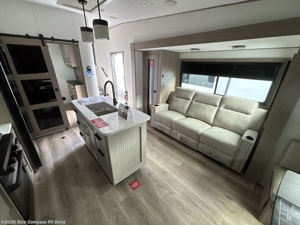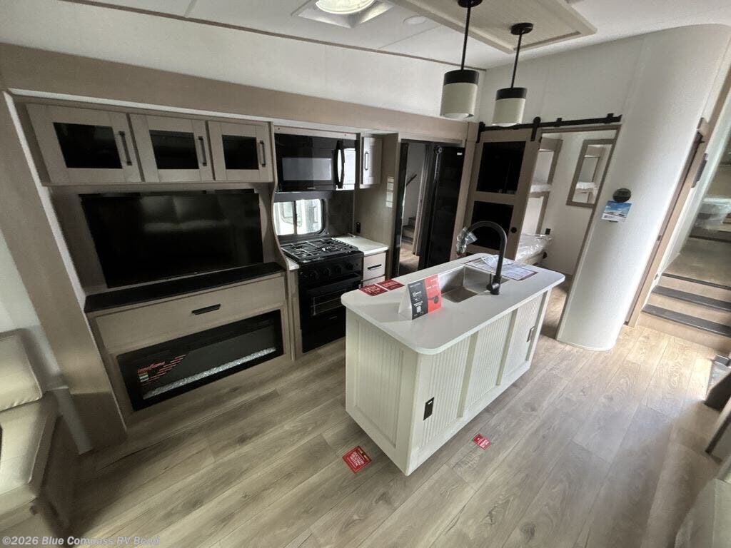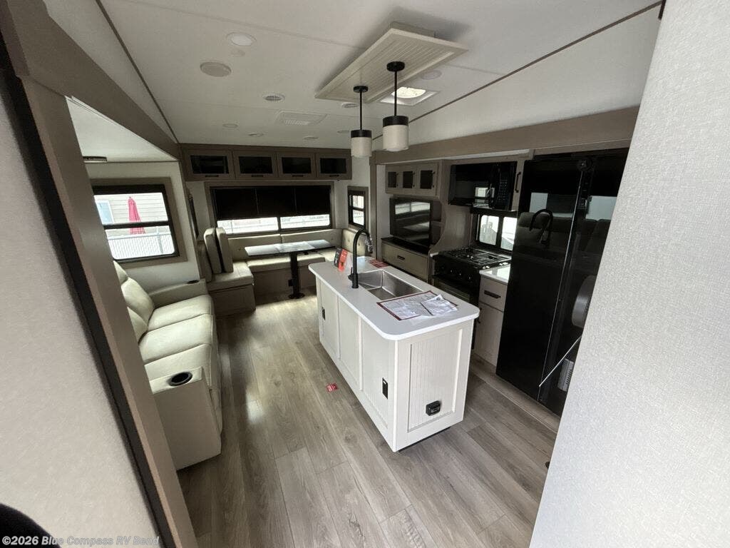 Weekend trips to the campground will be made unforgettable in this travel trailer for five to six. You will enjoy your own space in the front bedroom with a privacy curtain, RV queen bed and dual bedside wardrobes to keep your things tidy. If you have any guests staying over, then can convert the jack knife sofa and booth dinette back into seating spaces for breakfast in the morning. Speaking of breakfast, you'll have a three-burner cooktop and microwave oven to cook eggs and bacon, plus an 8-cu. ft. 12V refrigerator and pantry for food storage.