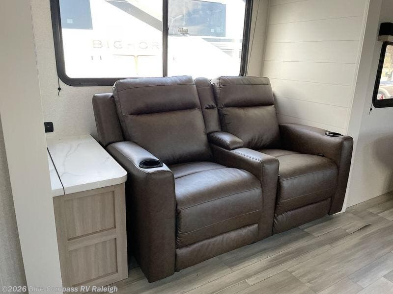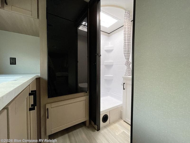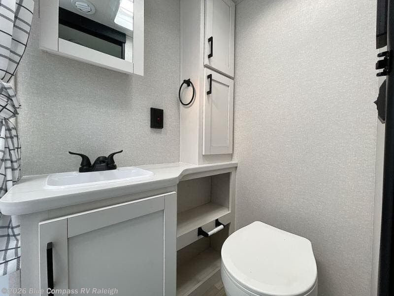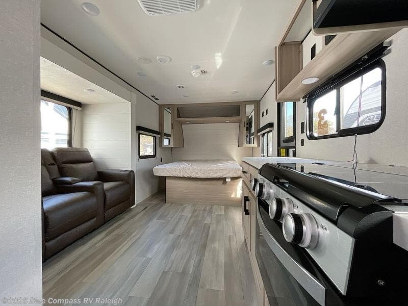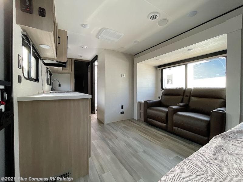 This is the perfect couple's trailer to take to the woods or lake! You can wake up each morning on the front queen bed, which also includes dual bedside wardrobes and overhead storage for your things. The rear corner kitchen includes a three-burner cooktop and microwave oven to make breakfast, and you can relax on the theater seating slide with cup holders and your coffee. And the full bath with a foot-flush toilet, sink, and 30" x 36" shower will let you clean up daily!