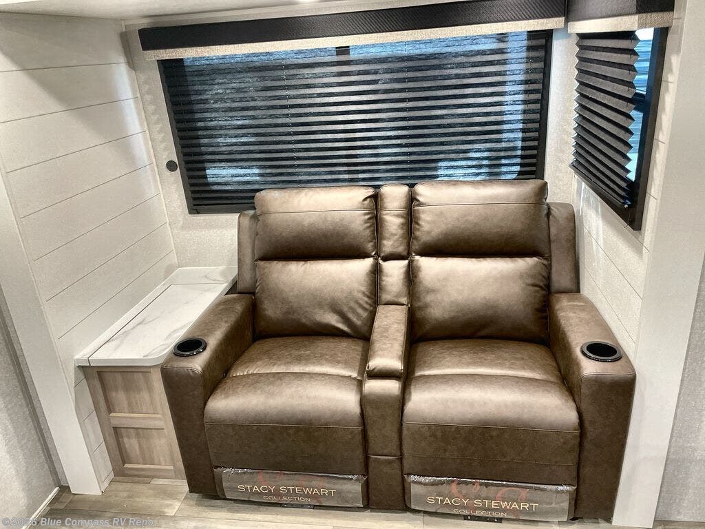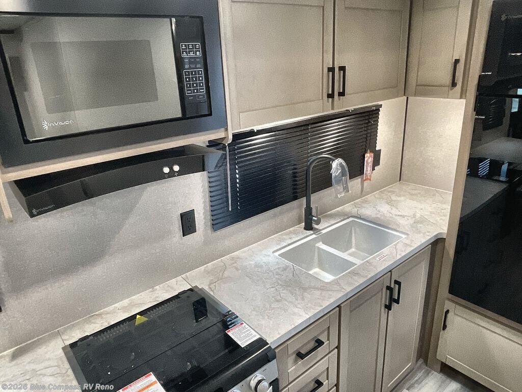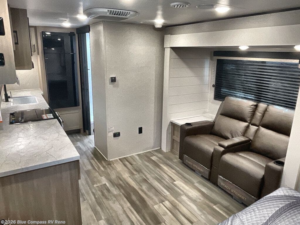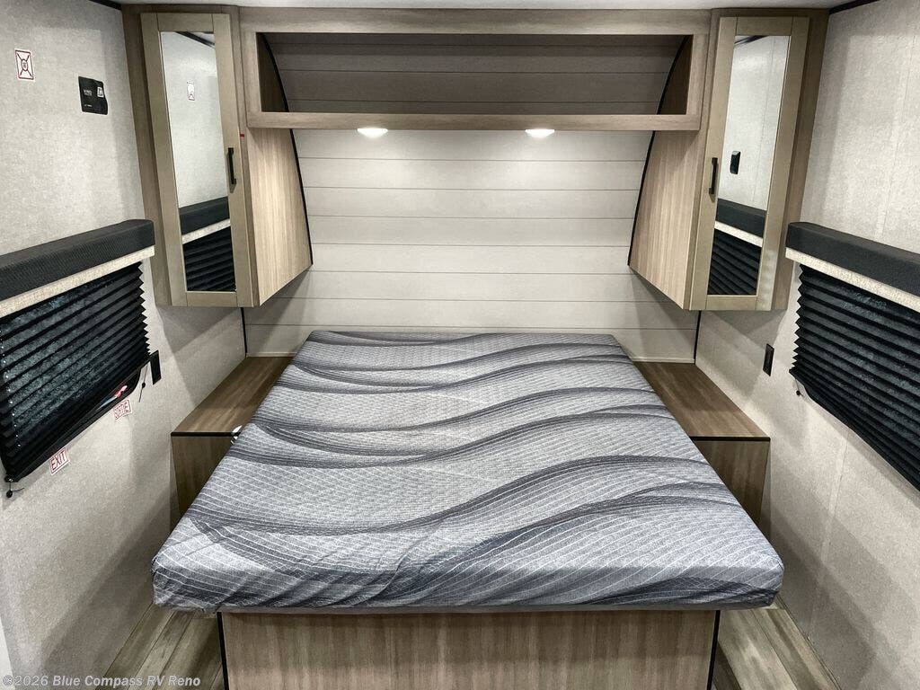 This is the perfect couple's trailer to take to the woods or lake! You can wake up each morning on the front queen bed, which also includes dual bedside wardrobes and overhead storage for your things. The rear corner kitchen includes a three-burner cooktop and microwave oven to make breakfast, and you can relax on the theater seating slide with cup holders and your coffee. And the full bath with a foot-flush toilet, sink, and 30" x 36" shower will let you clean up daily!