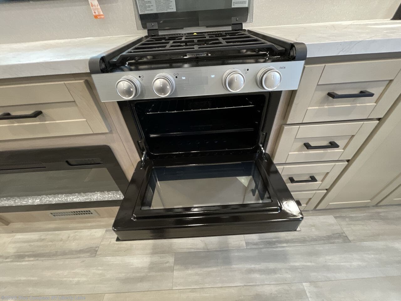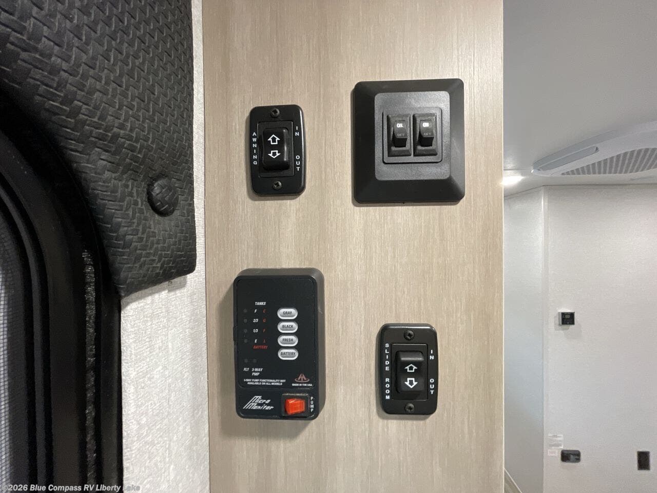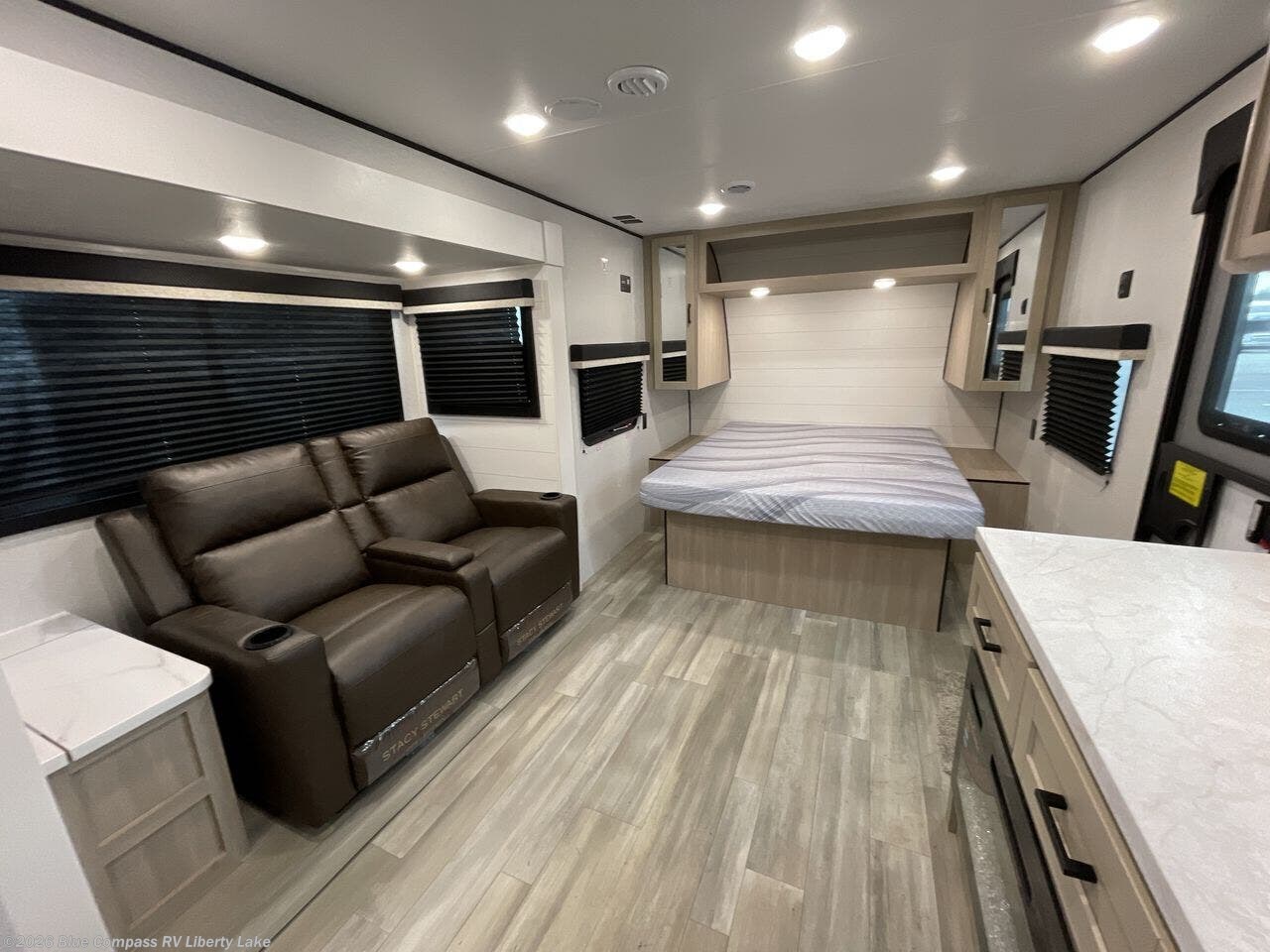 This is the perfect couple's trailer to take to the woods or lake! You can wake up each morning on the front queen bed, which also includes dual bedside wardrobes and overhead storage for your things. The rear corner kitchen includes a three-burner cooktop and microwave oven to make breakfast, and you can relax on the theater seating slide with cup holders and your coffee. And the full bath with a foot-flush toilet, sink, and 30" x 36" shower will let you clean up daily!