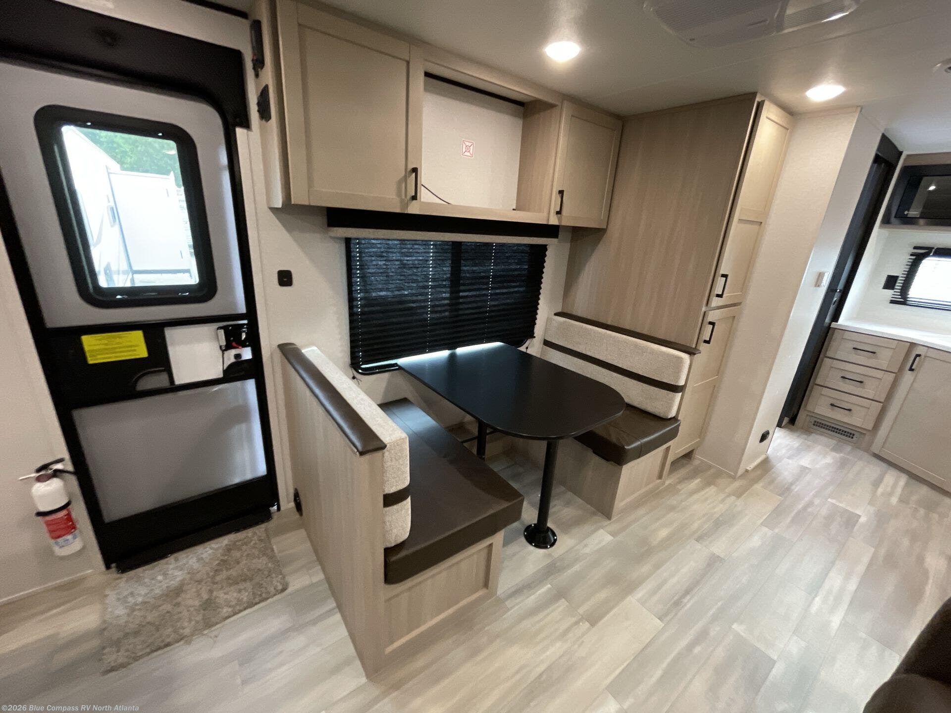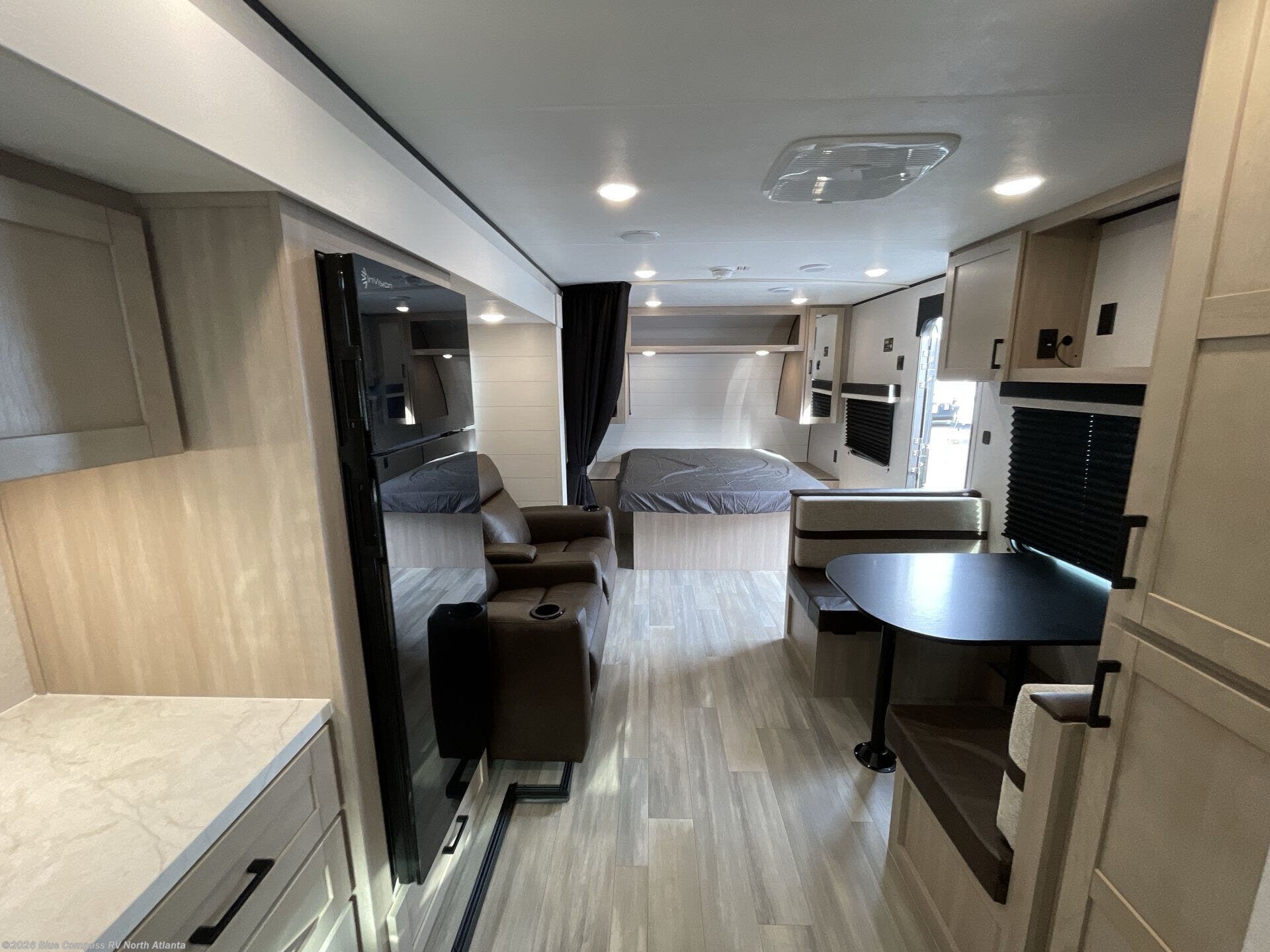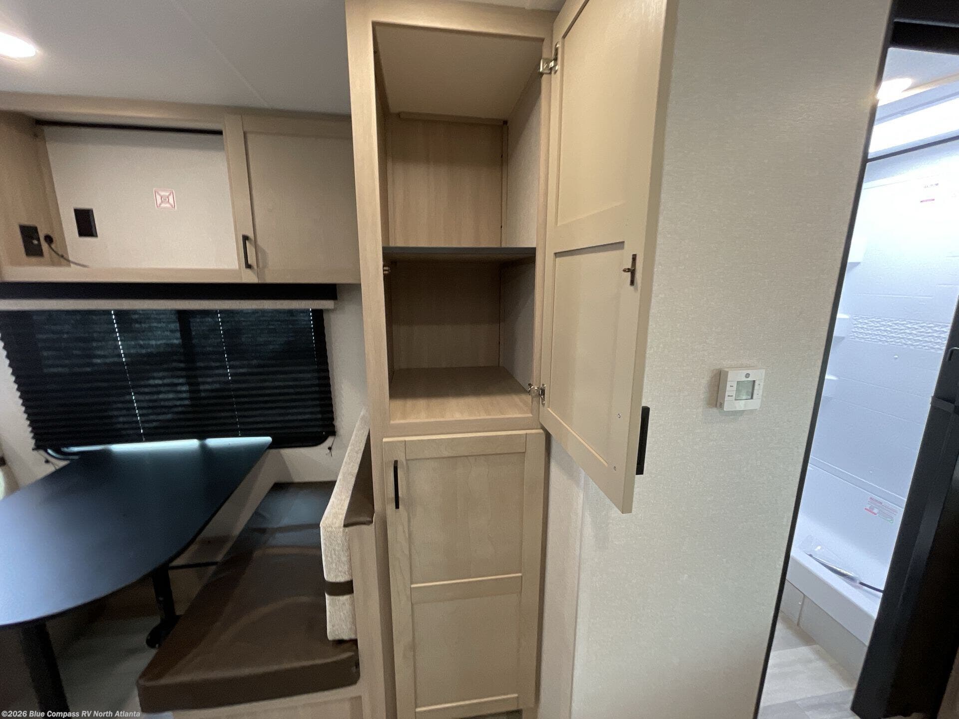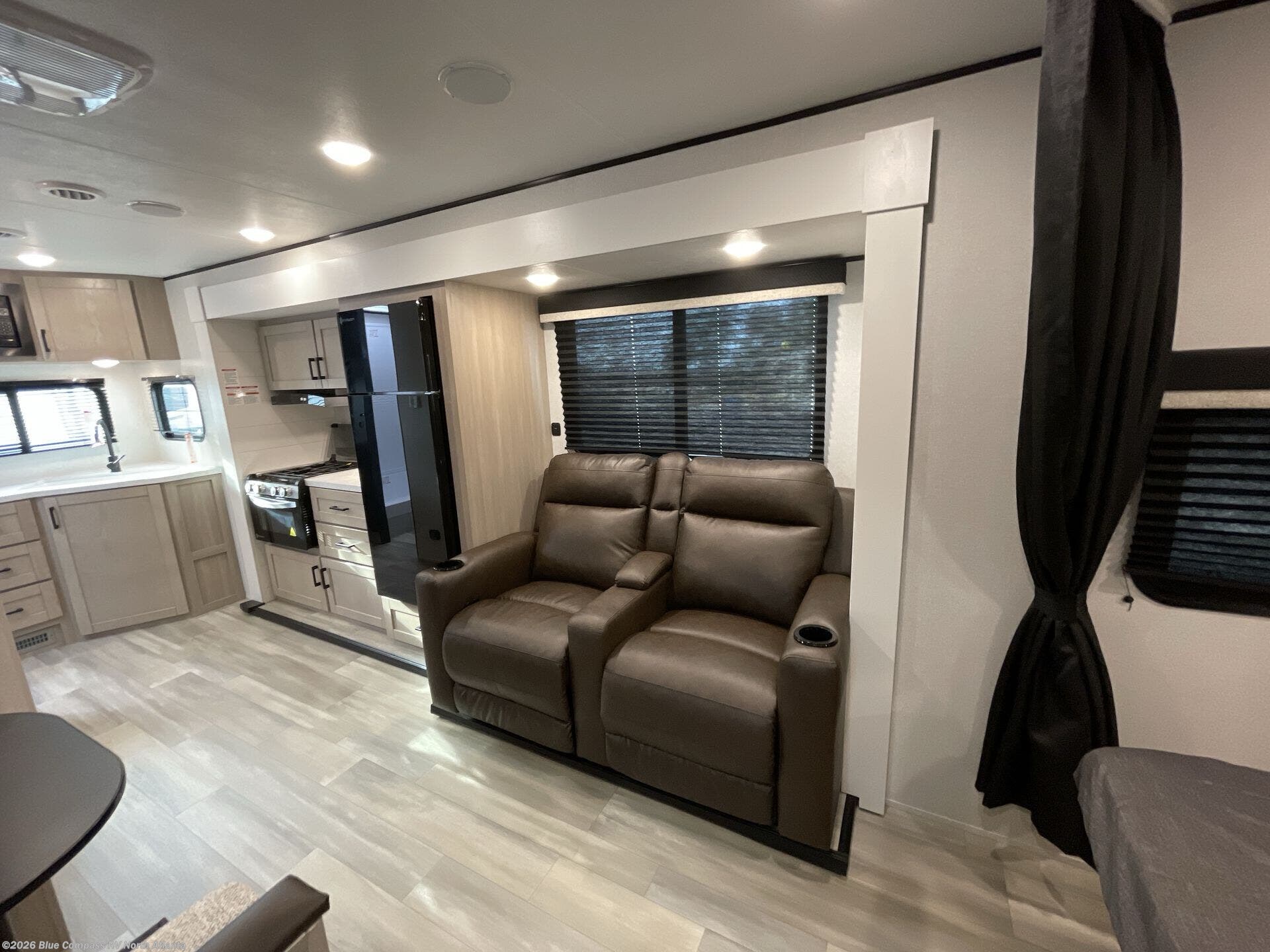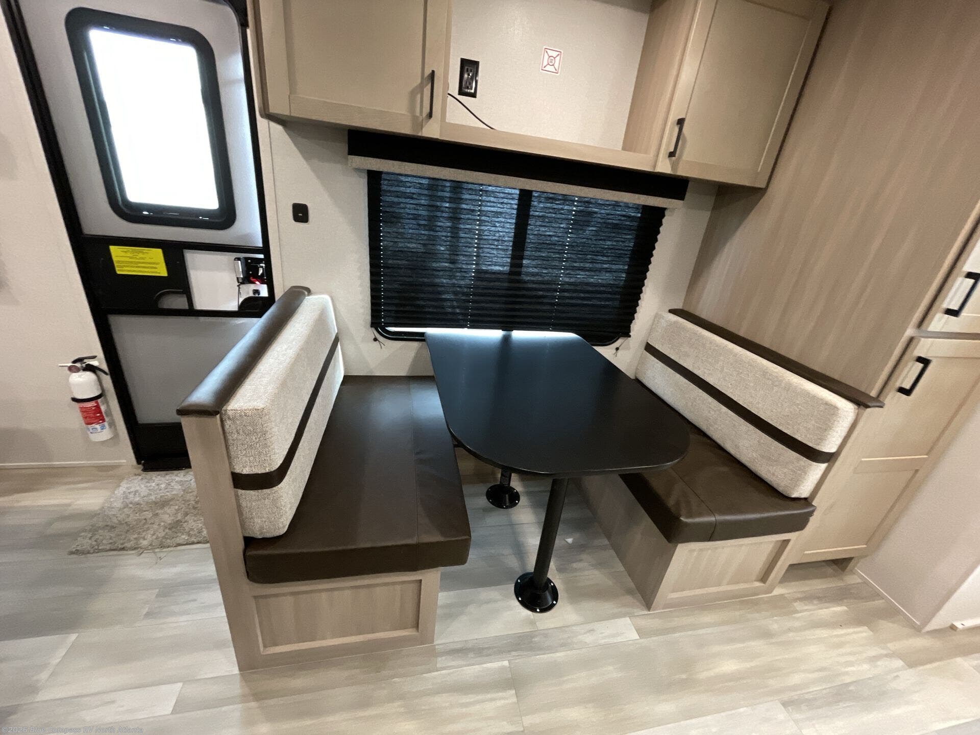 You'll love having your own space in this travel trailer thanks to the front bedroom with a queen bed, dual bedside wardrobes, and privacy curtain. A large slide out provides more space to move about, and there is theater seating here to relax in the evenings. You can make meals on the three-burner cooktop or in the microwave oven, and you can dine at the booth dinette. This unit also includes a 12V refrigerator and pantry for food storge plus ample overhead cabinets for your personal belongings.