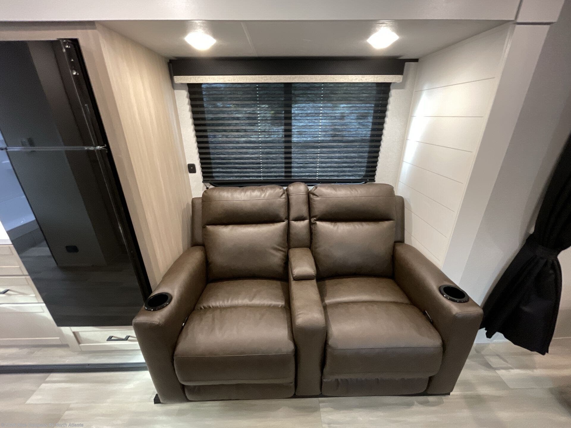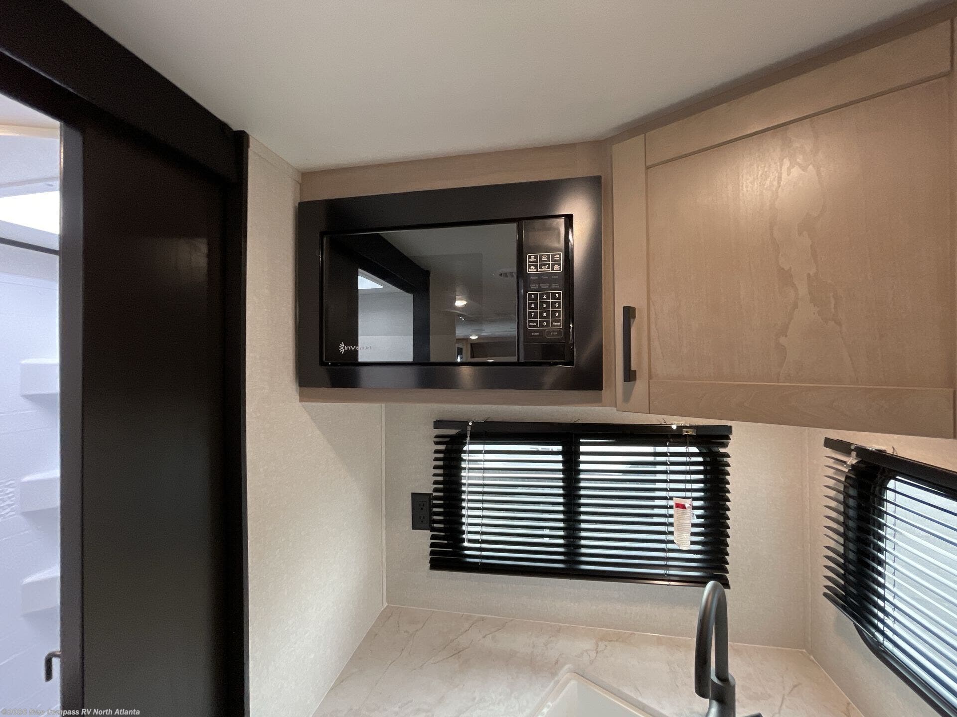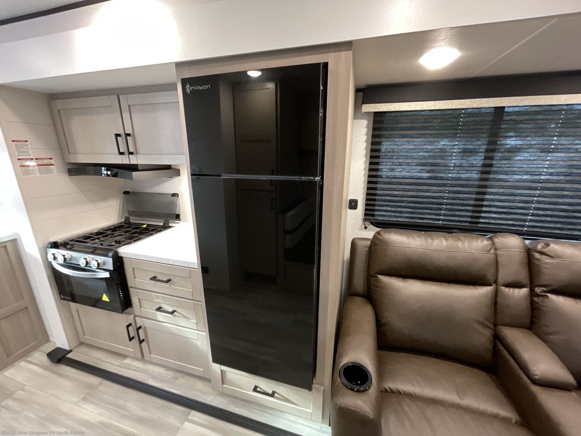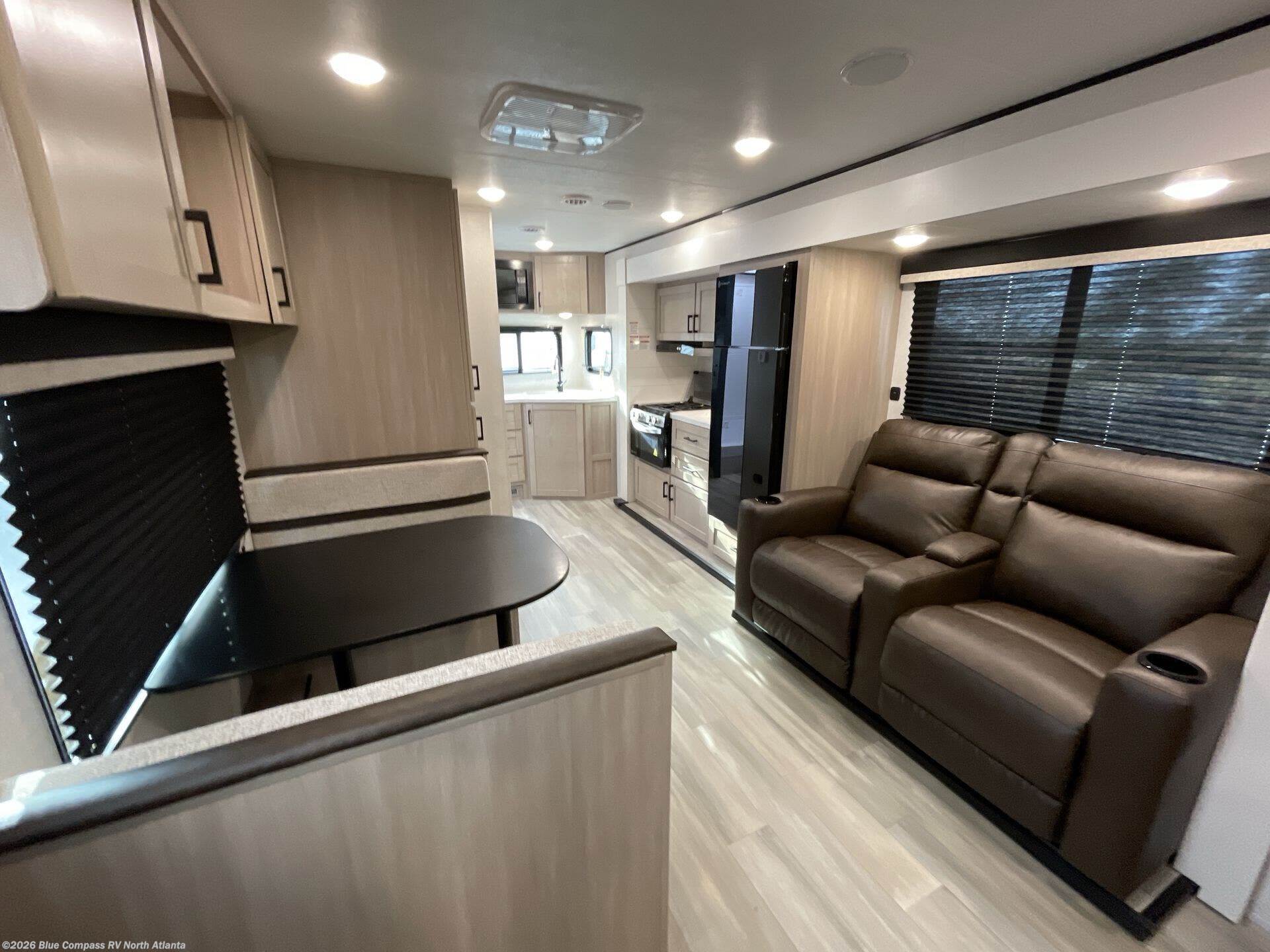 You'll love having your own space in this travel trailer thanks to the front bedroom with a queen bed, dual bedside wardrobes, and privacy curtain. A large slide out provides more space to move about, and there is theater seating here to relax in the evenings. You can make meals on the three-burner cooktop or in the microwave oven, and you can dine at the booth dinette. This unit also includes a 12V refrigerator and pantry for food storge plus ample overhead cabinets for your personal belongings.