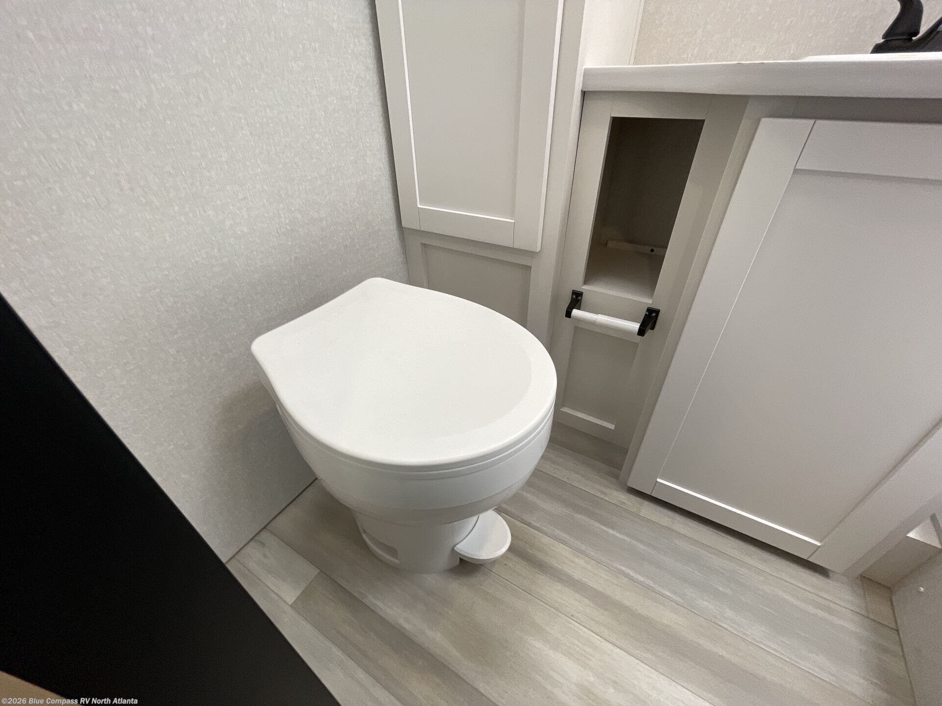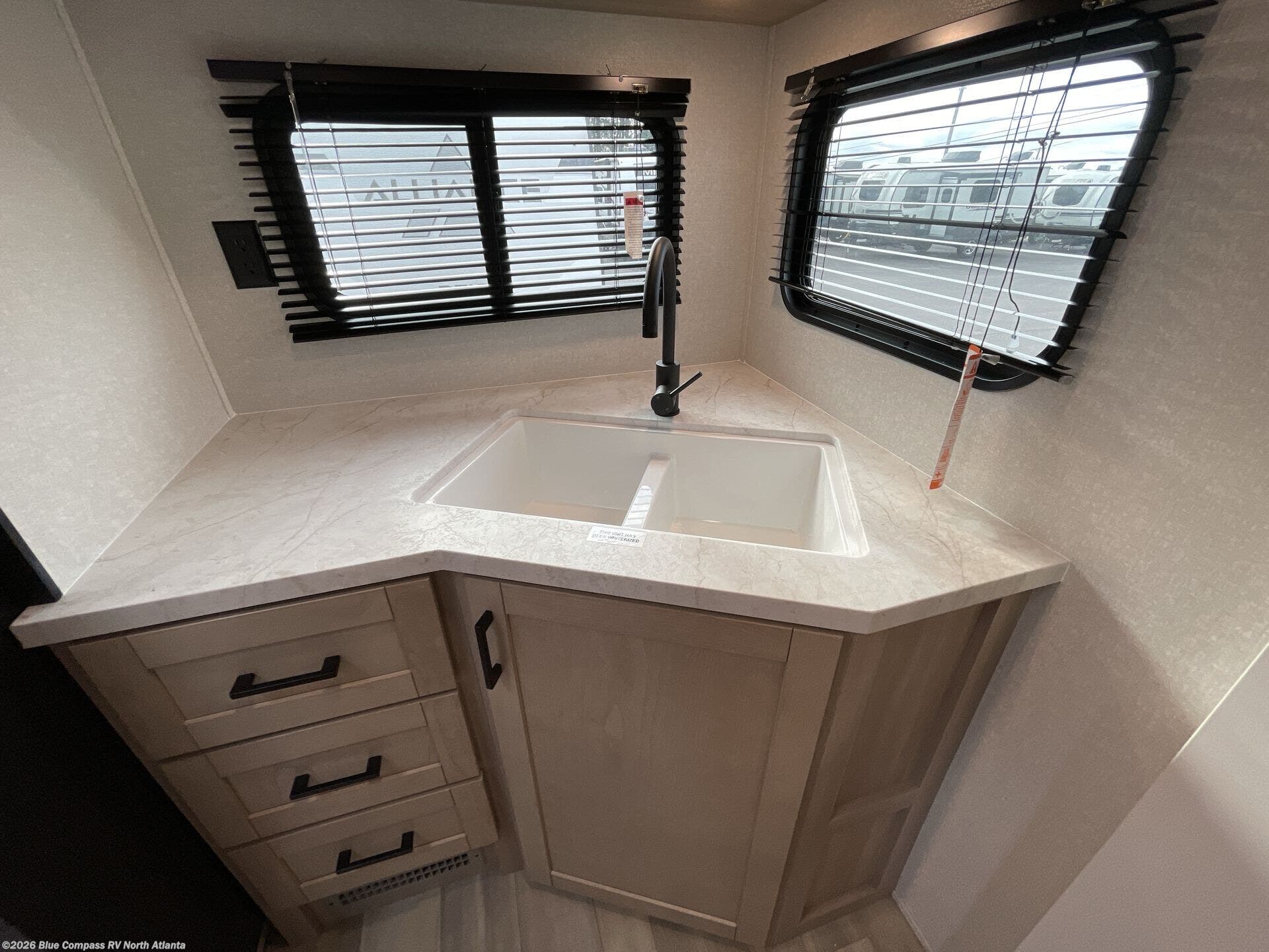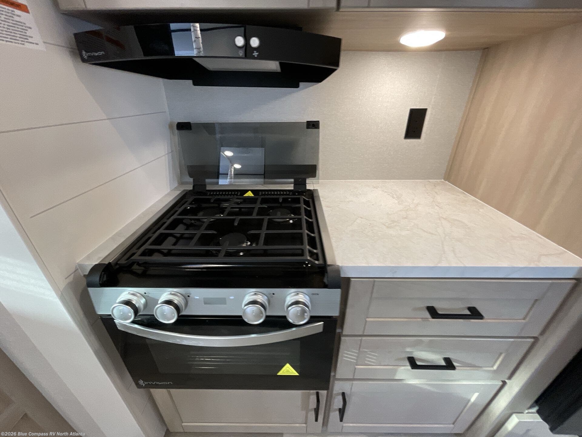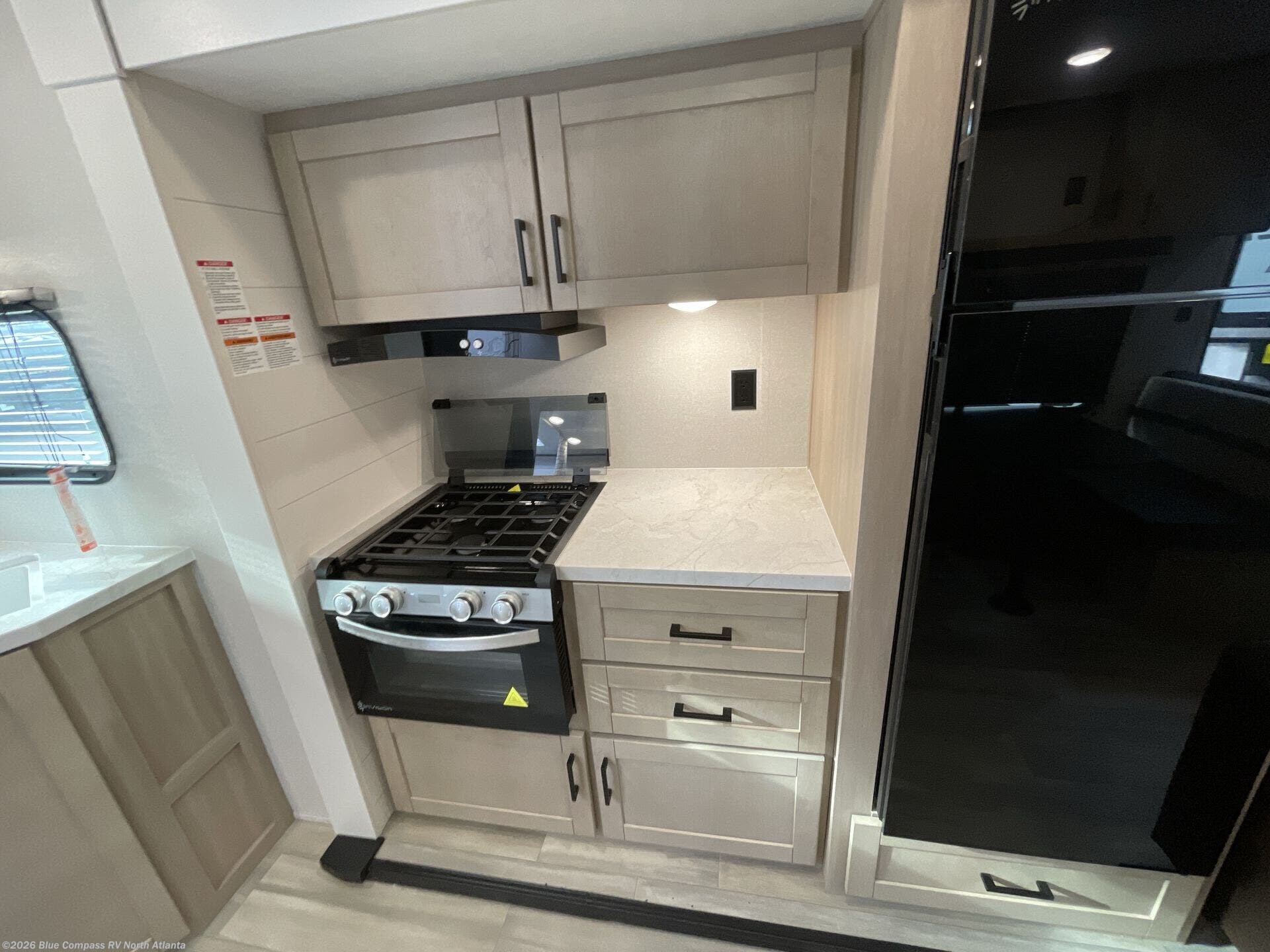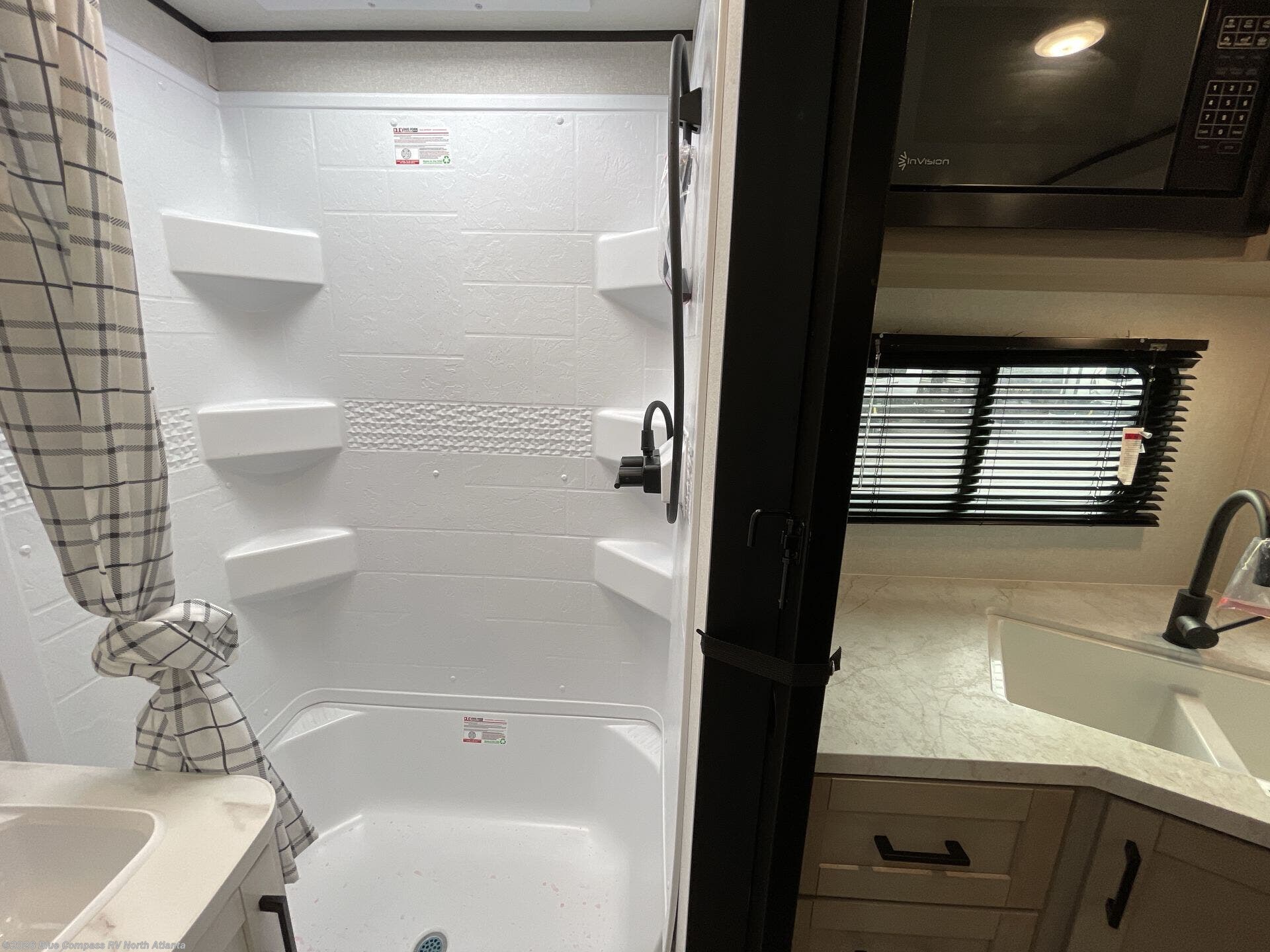 You'll love having your own space in this travel trailer thanks to the front bedroom with a queen bed, dual bedside wardrobes, and privacy curtain. A large slide out provides more space to move about, and there is theater seating here to relax in the evenings. You can make meals on the three-burner cooktop or in the microwave oven, and you can dine at the booth dinette. This unit also includes a 12V refrigerator and pantry for food storge plus ample overhead cabinets for your personal belongings.