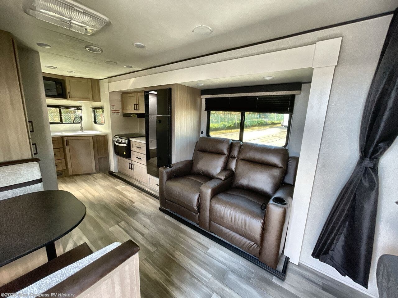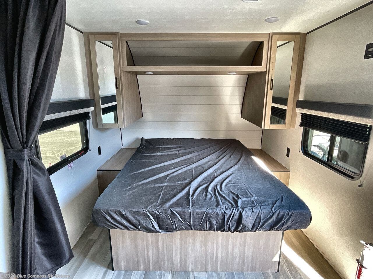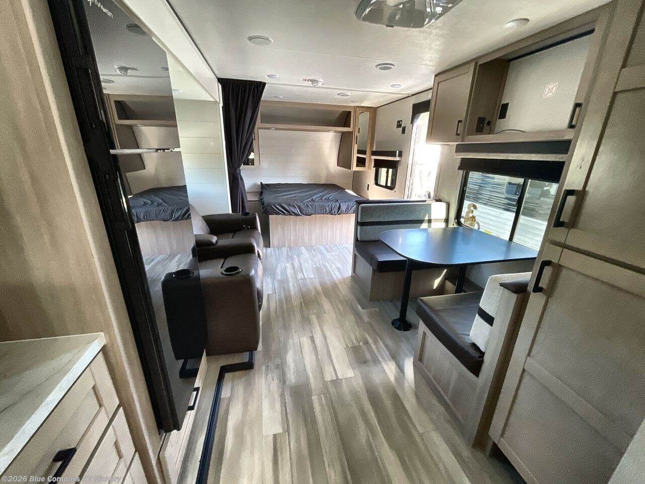 You'll love having your own space in this travel trailer thanks to the front bedroom with a queen bed, dual bedside wardrobes, and privacy curtain. A large slide out provides more space to move about, and there is theater seating here to relax in the evenings. You can make meals on the three-burner cooktop or in the microwave oven, and you can dine at the booth dinette. This unit also includes a 12V refrigerator and pantry for food storge plus ample overhead cabinets for your personal belongings.