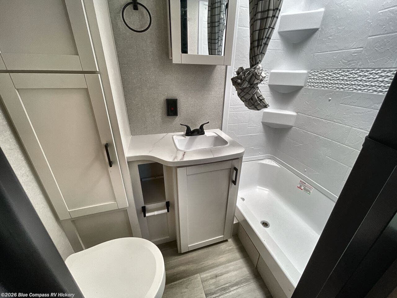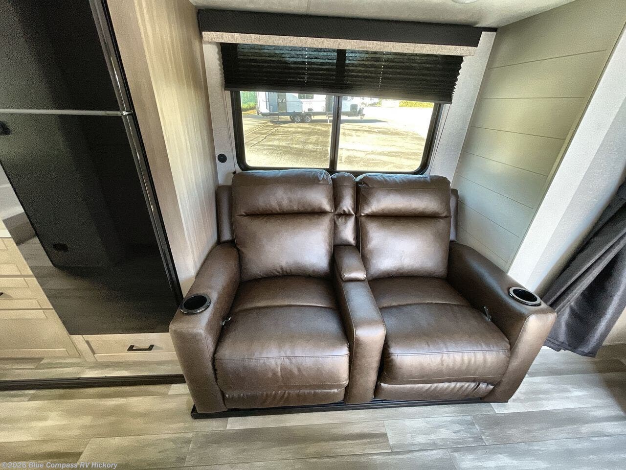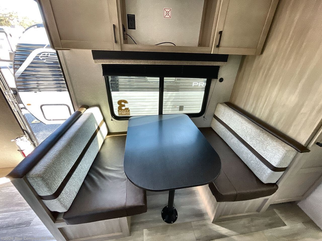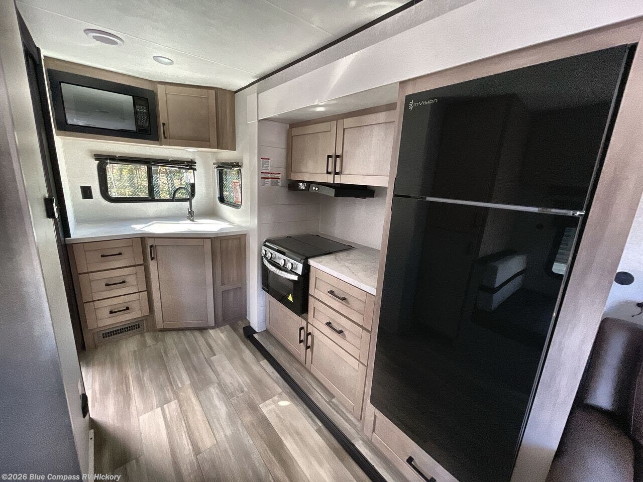 You'll love having your own space in this travel trailer thanks to the front bedroom with a queen bed, dual bedside wardrobes, and privacy curtain. A large slide out provides more space to move about, and there is theater seating here to relax in the evenings. You can make meals on the three-burner cooktop or in the microwave oven, and you can dine at the booth dinette. This unit also includes a 12V refrigerator and pantry for food storge plus ample overhead cabinets for your personal belongings.