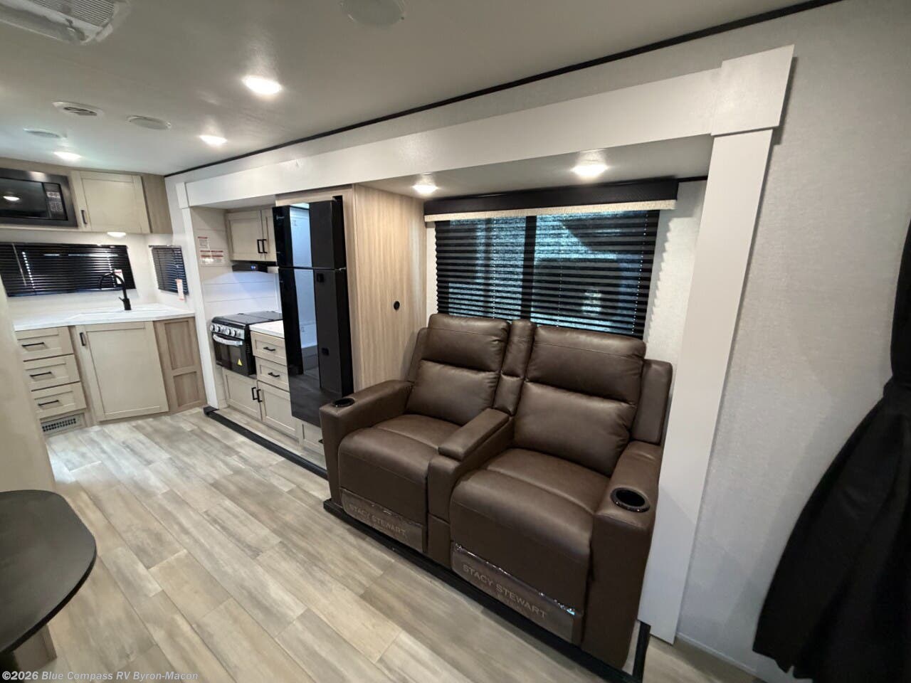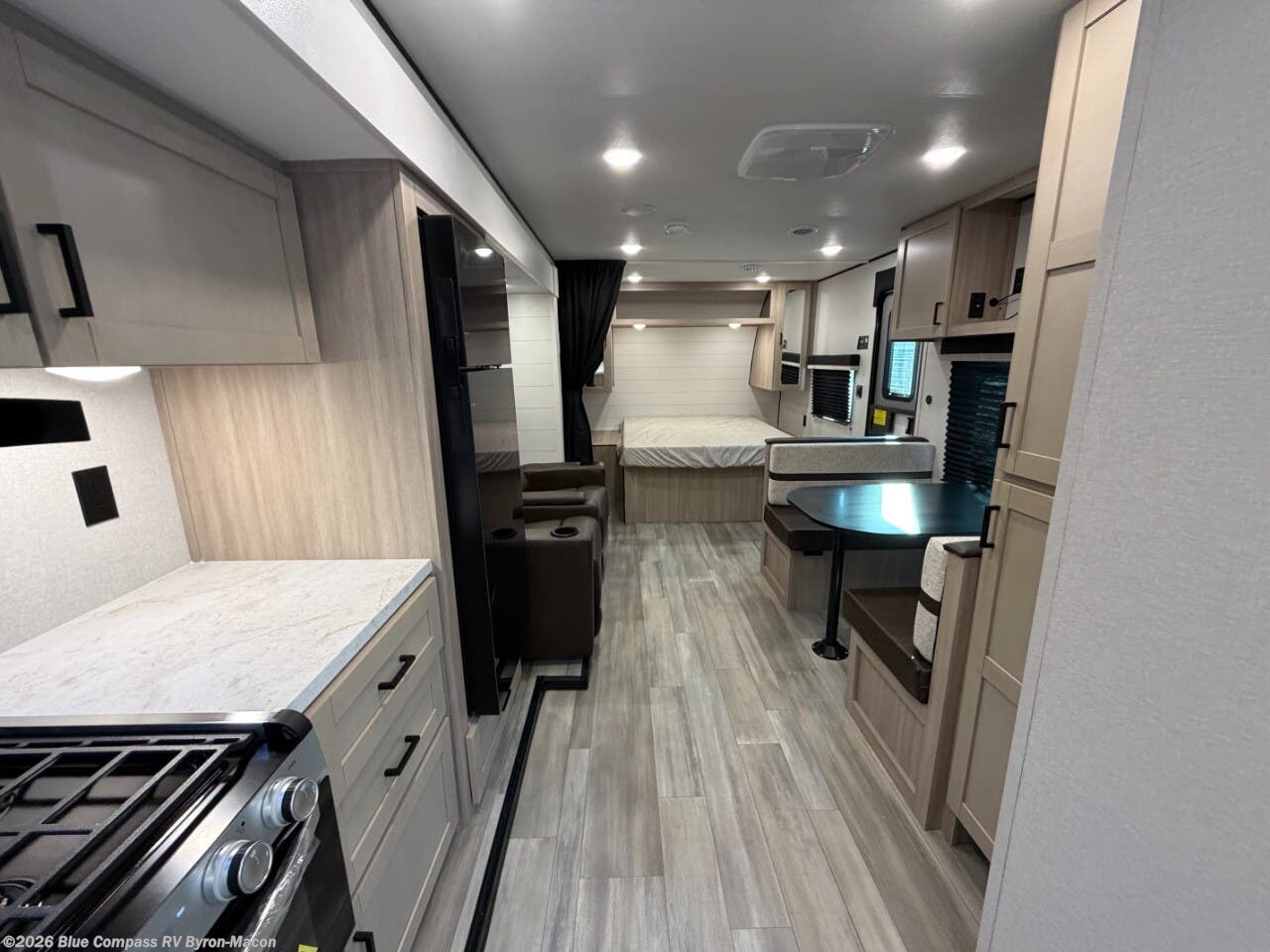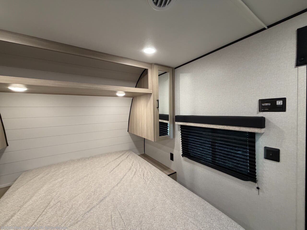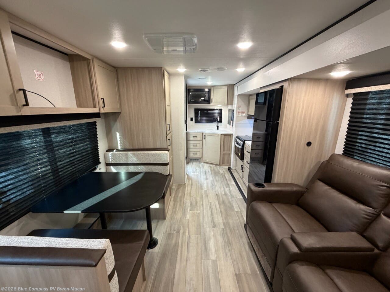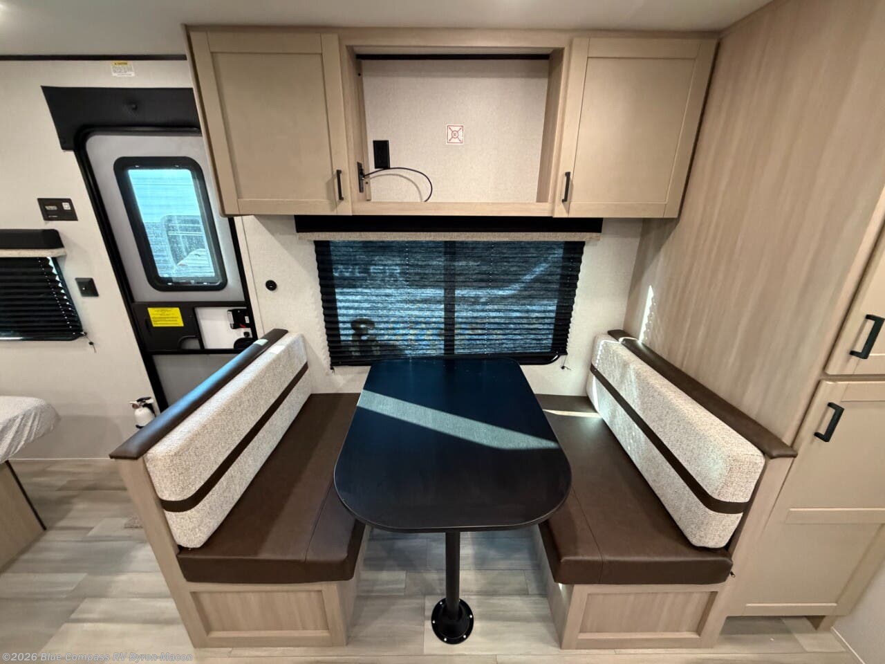You'll love having your own space in this travel trailer thanks to the front bedroom with a queen bed, dual bedside wardrobes, and privacy curtain. A large slide out provides more space to move about, and there is theater seating here to relax in the evenings. You can make meals on the three-burner cooktop or in the microwave oven, and you can dine at the booth dinette. This unit also includes a 12V refrigerator and pantry for food storge plus ample overhead cabinets for your personal belongings.