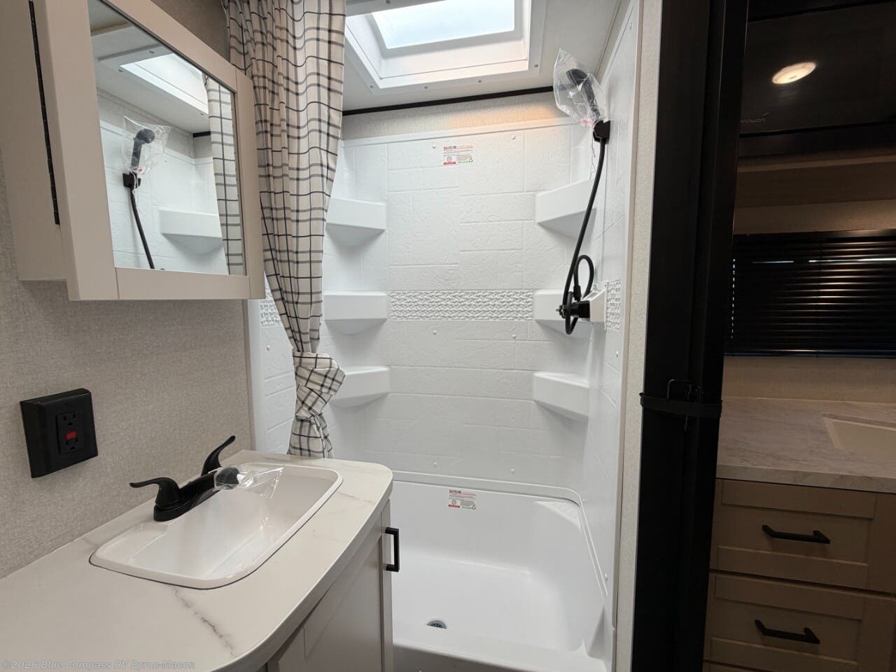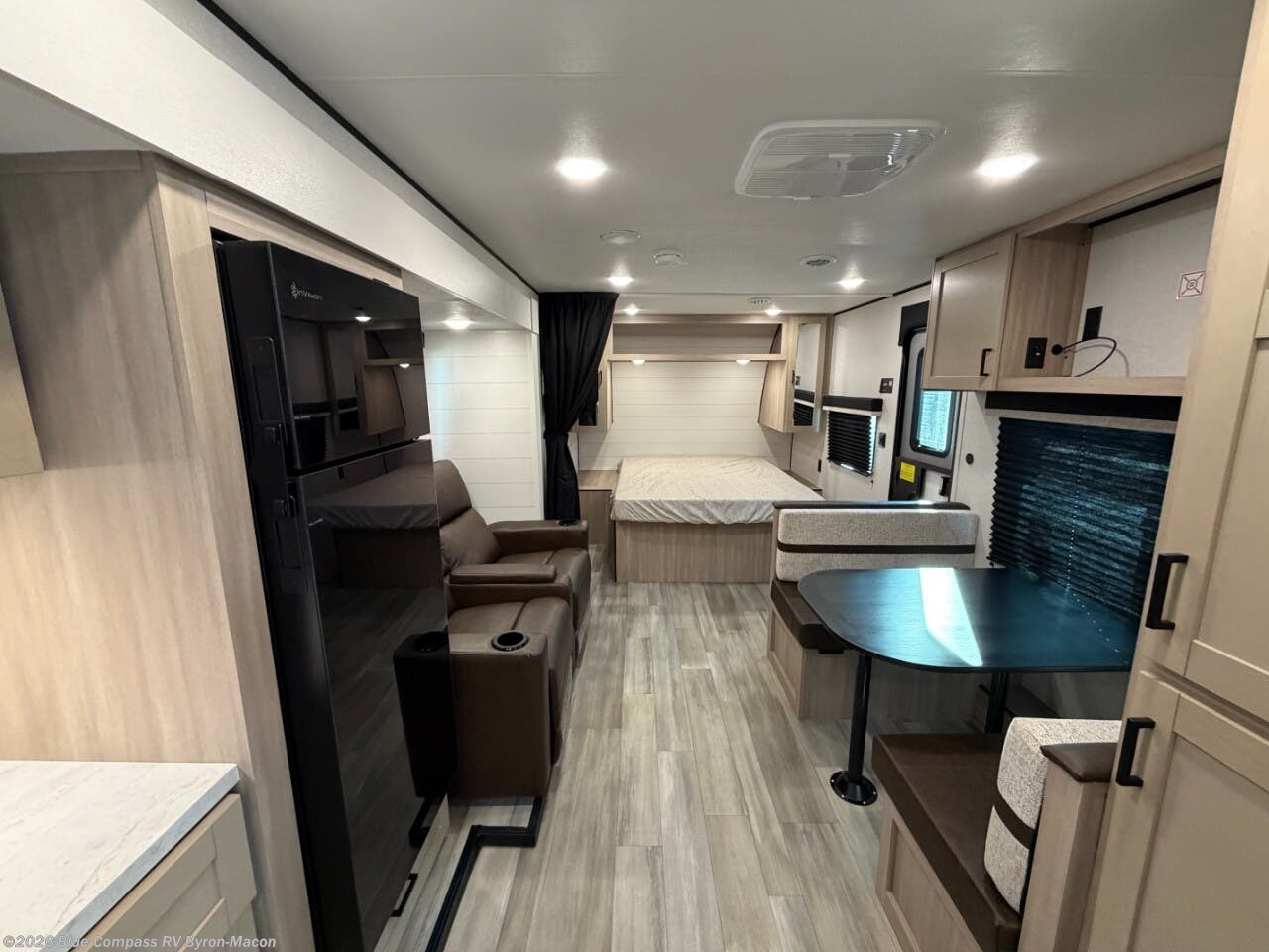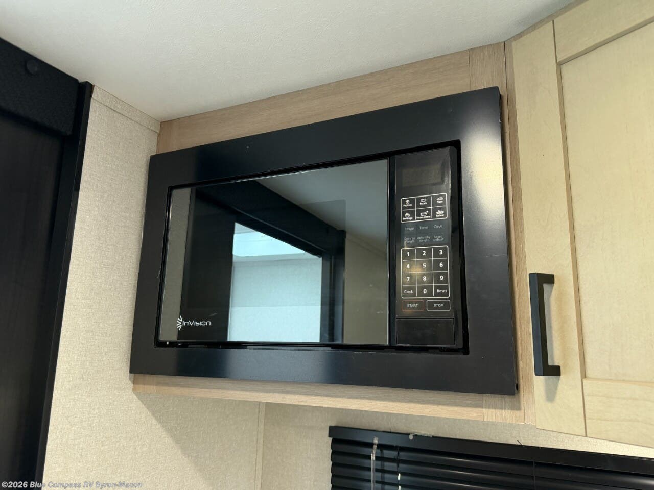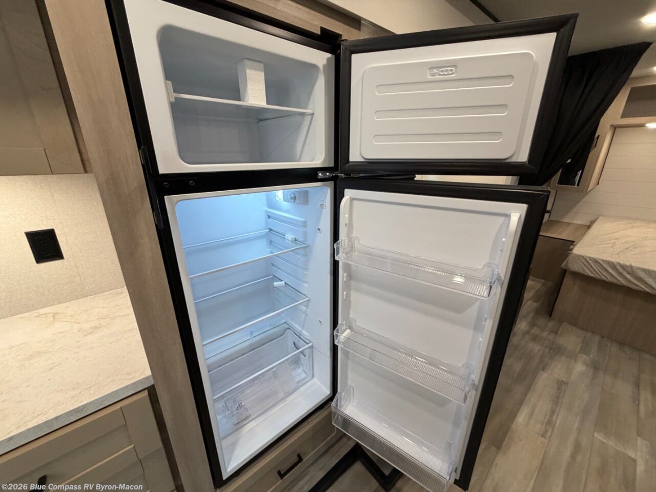 You'll love having your own space in this travel trailer thanks to the front bedroom with a queen bed, dual bedside wardrobes, and privacy curtain. A large slide out provides more space to move about, and there is theater seating here to relax in the evenings. You can make meals on the three-burner cooktop or in the microwave oven, and you can dine at the booth dinette. This unit also includes a 12V refrigerator and pantry for food storge plus ample overhead cabinets for your personal belongings.