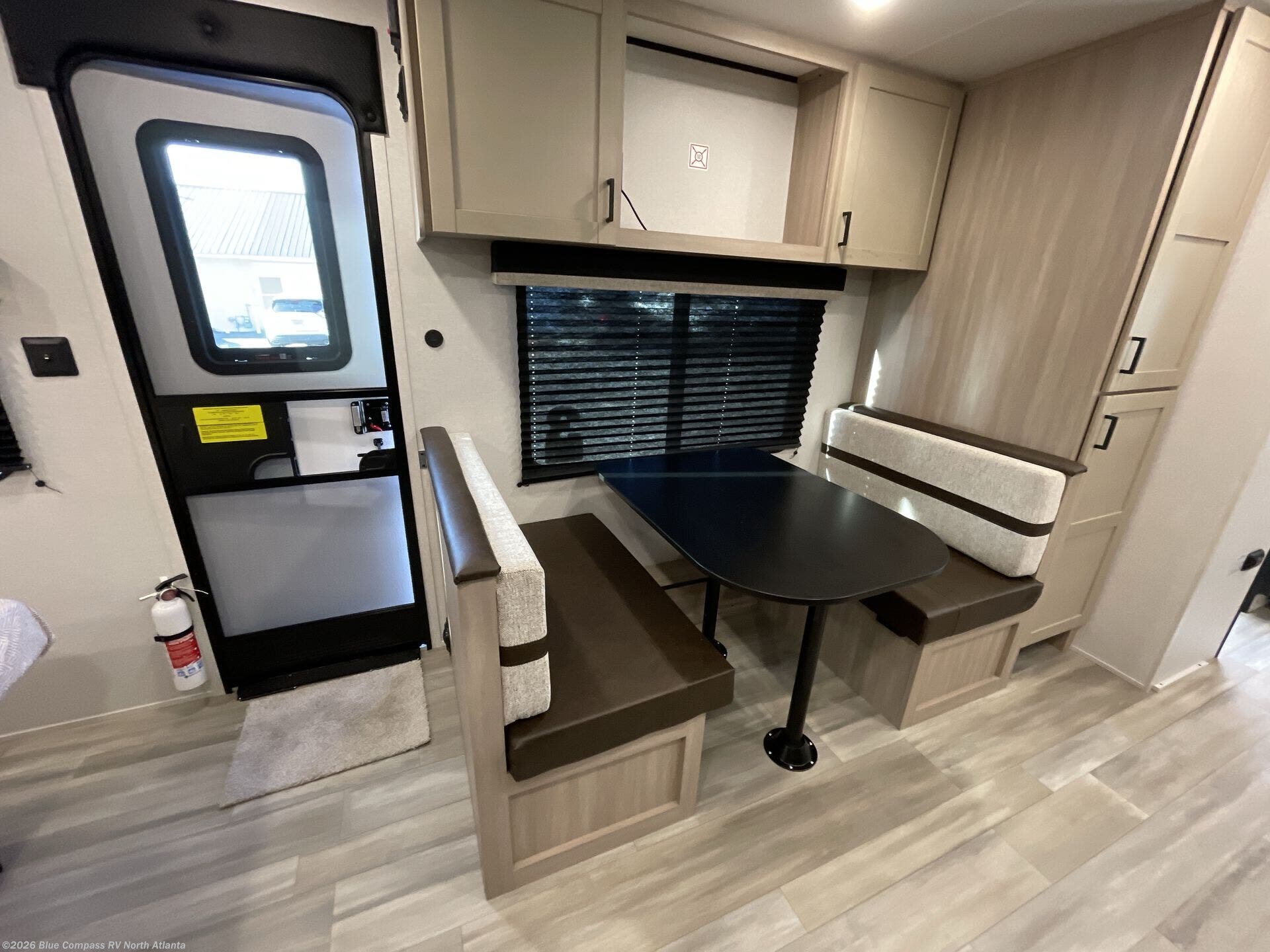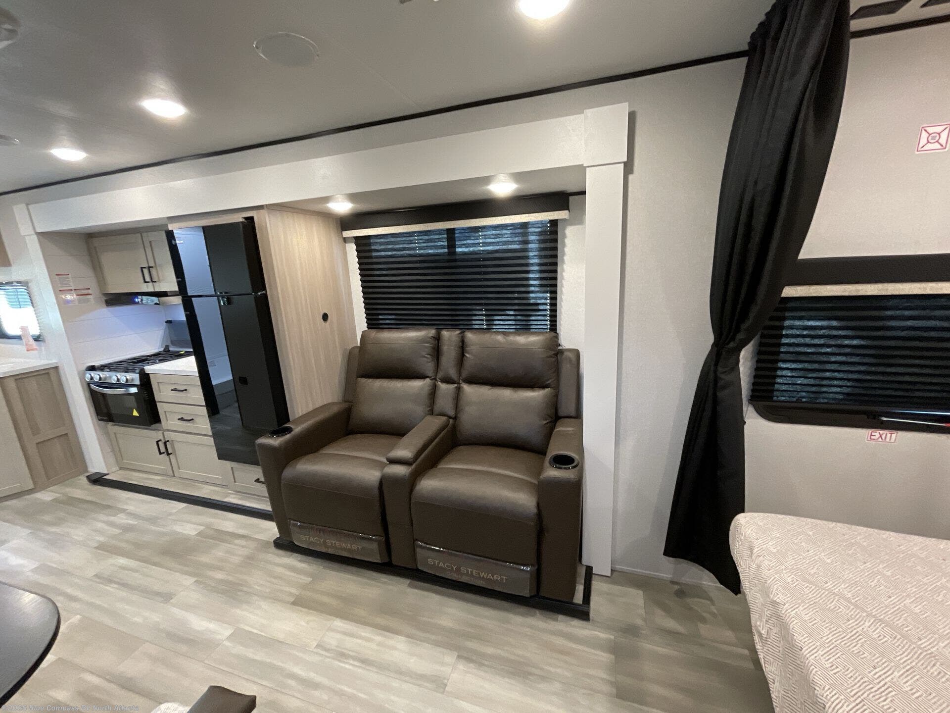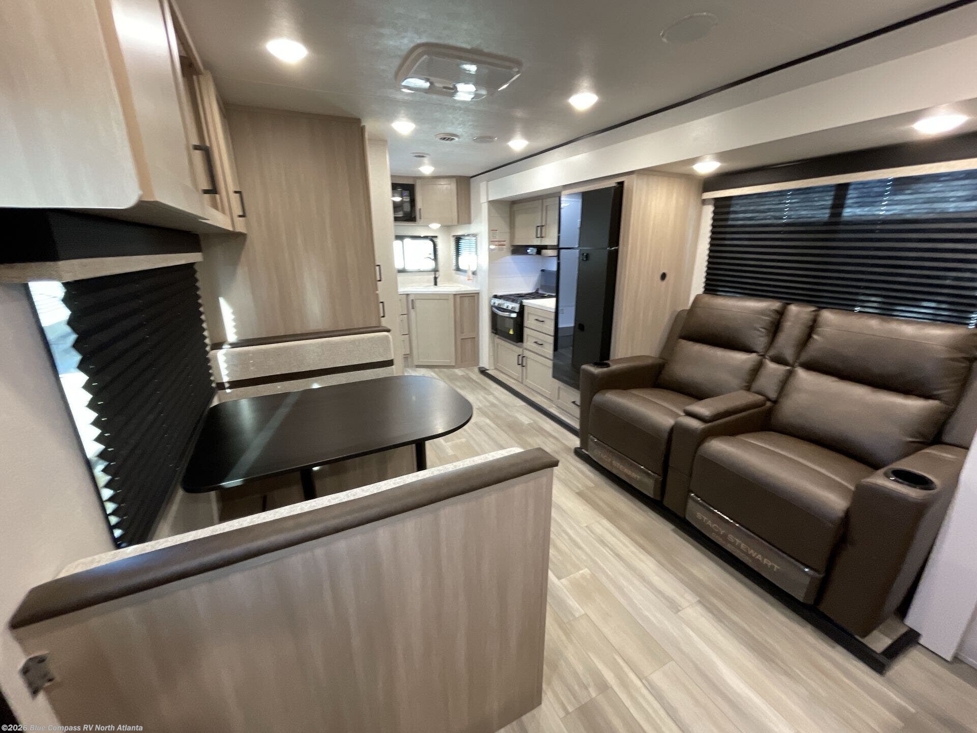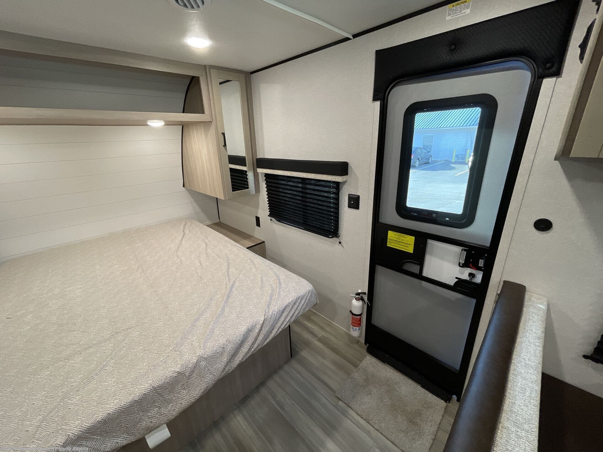 You'll love having your own space in this travel trailer thanks to the front bedroom with a queen bed, dual bedside wardrobes, and privacy curtain. A large slide out provides more space to move about, and there is theater seating here to relax in the evenings. You can make meals on the three-burner cooktop or in the microwave oven, and you can dine at the booth dinette. This unit also includes a 12V refrigerator and pantry for food storge plus ample overhead cabinets for your personal belongings.