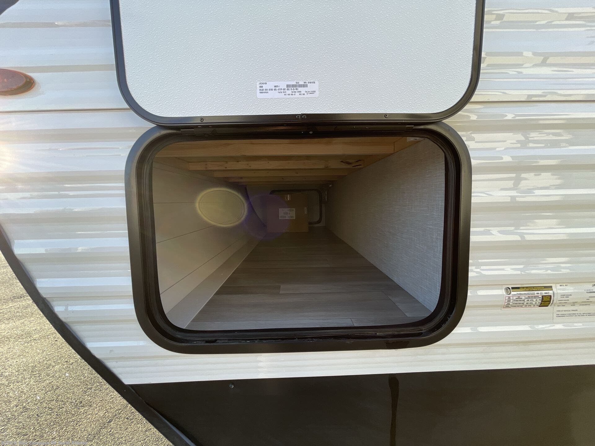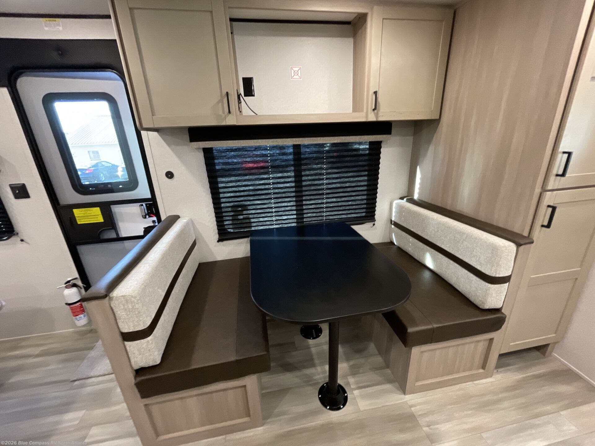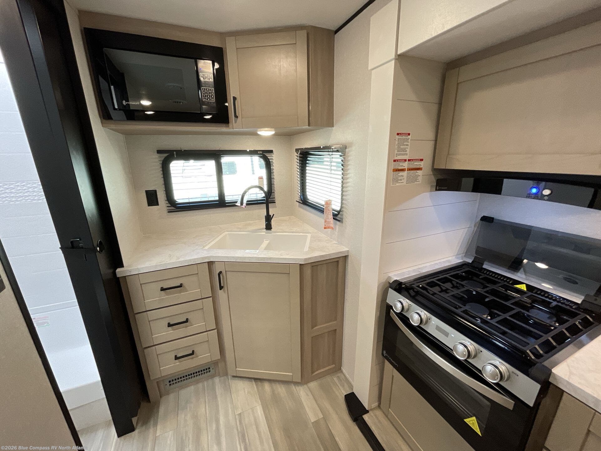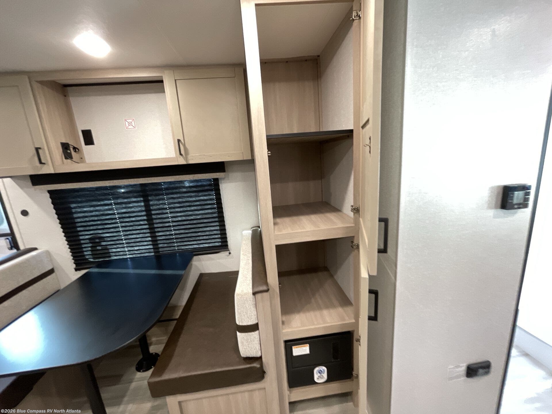You'll love having your own space in this travel trailer thanks to the front bedroom with a queen bed, dual bedside wardrobes, and privacy curtain. A large slide out provides more space to move about, and there is theater seating here to relax in the evenings. You can make meals on the three-burner cooktop or in the microwave oven, and you can dine at the booth dinette. This unit also includes a 12V refrigerator and pantry for food storge plus ample overhead cabinets for your personal belongings.