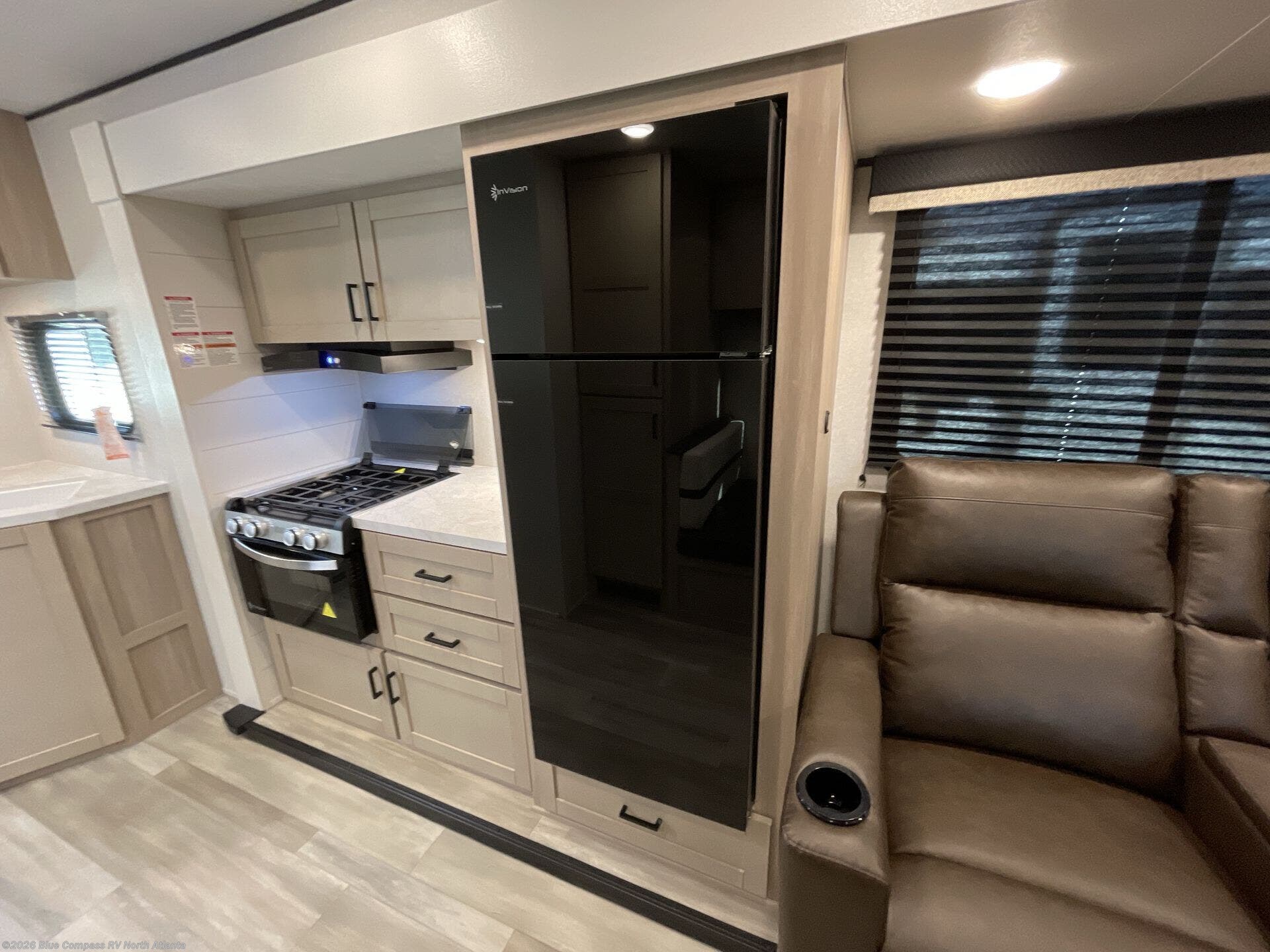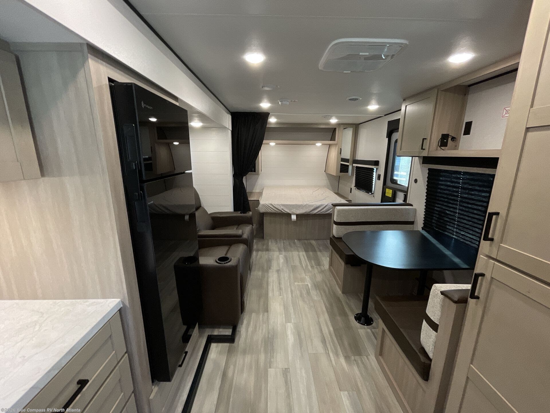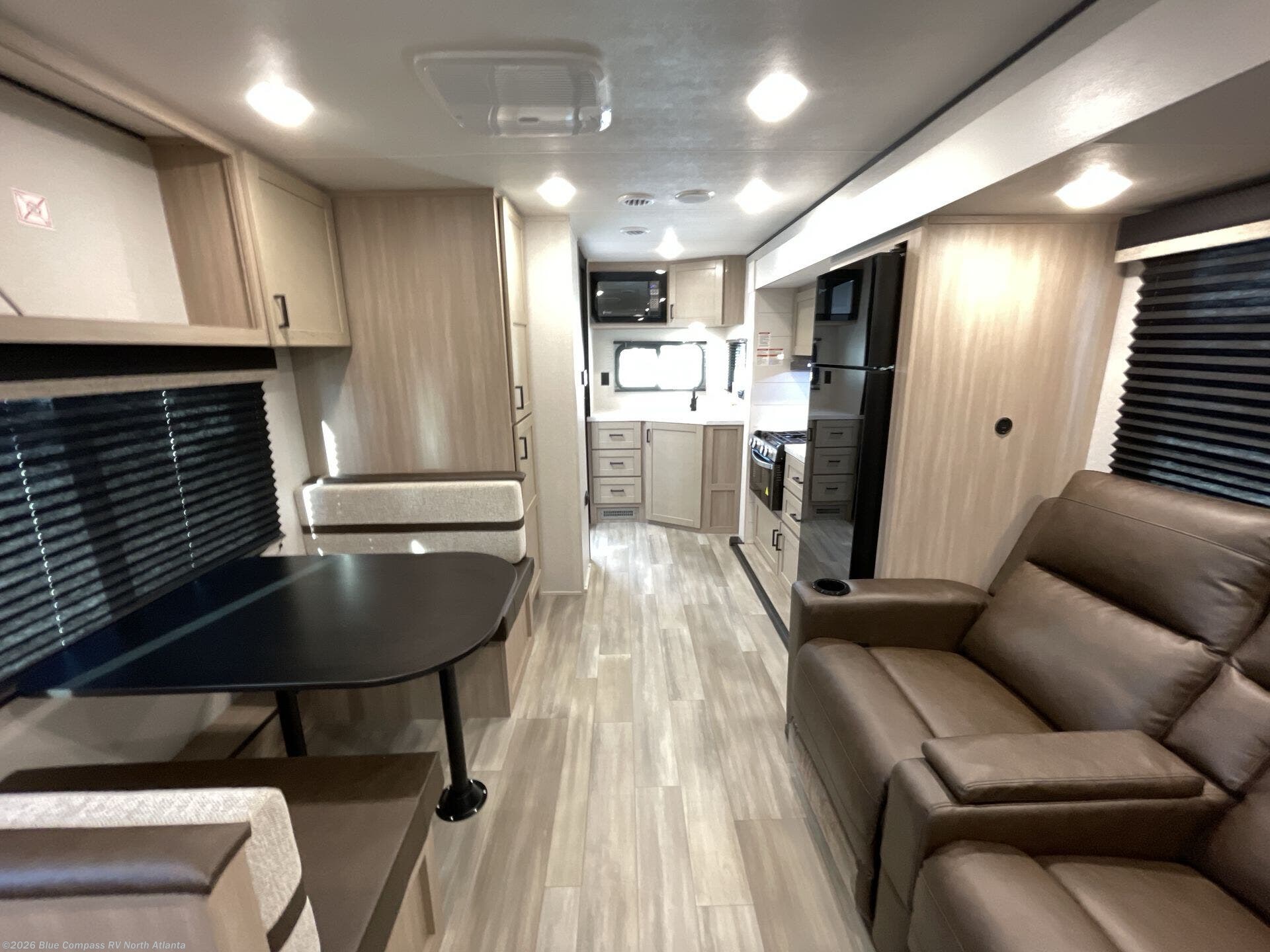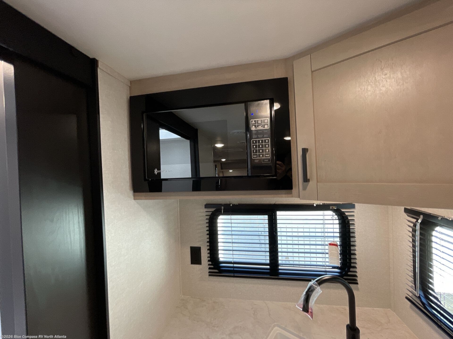 You'll love having your own space in this travel trailer thanks to the front bedroom with a queen bed, dual bedside wardrobes, and privacy curtain. A large slide out provides more space to move about, and there is theater seating here to relax in the evenings. You can make meals on the three-burner cooktop or in the microwave oven, and you can dine at the booth dinette. This unit also includes a 12V refrigerator and pantry for food storge plus ample overhead cabinets for your personal belongings.